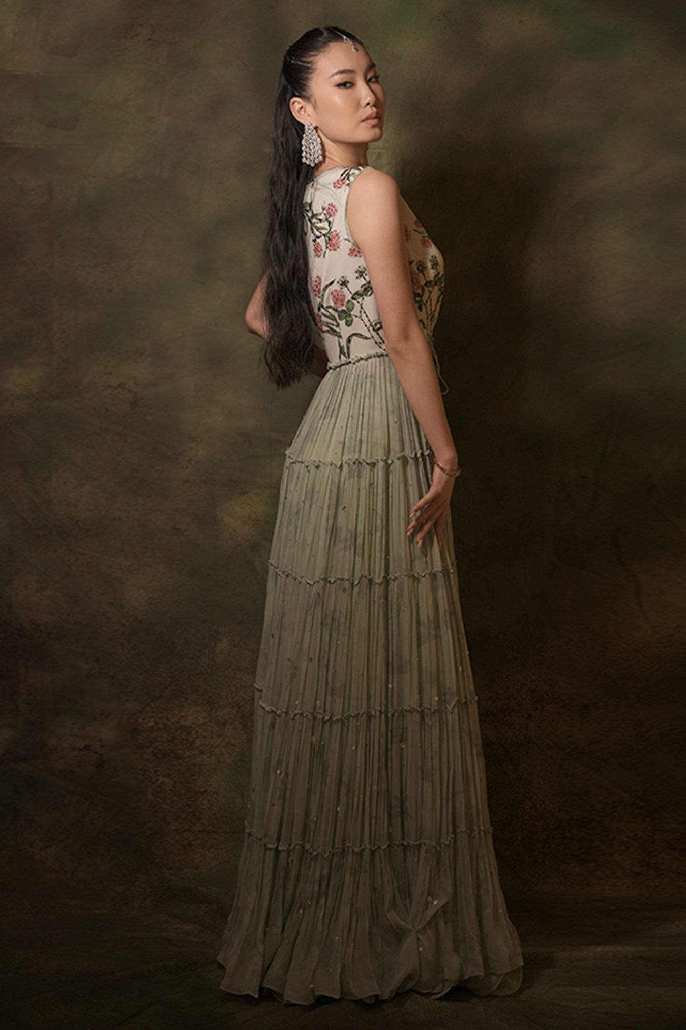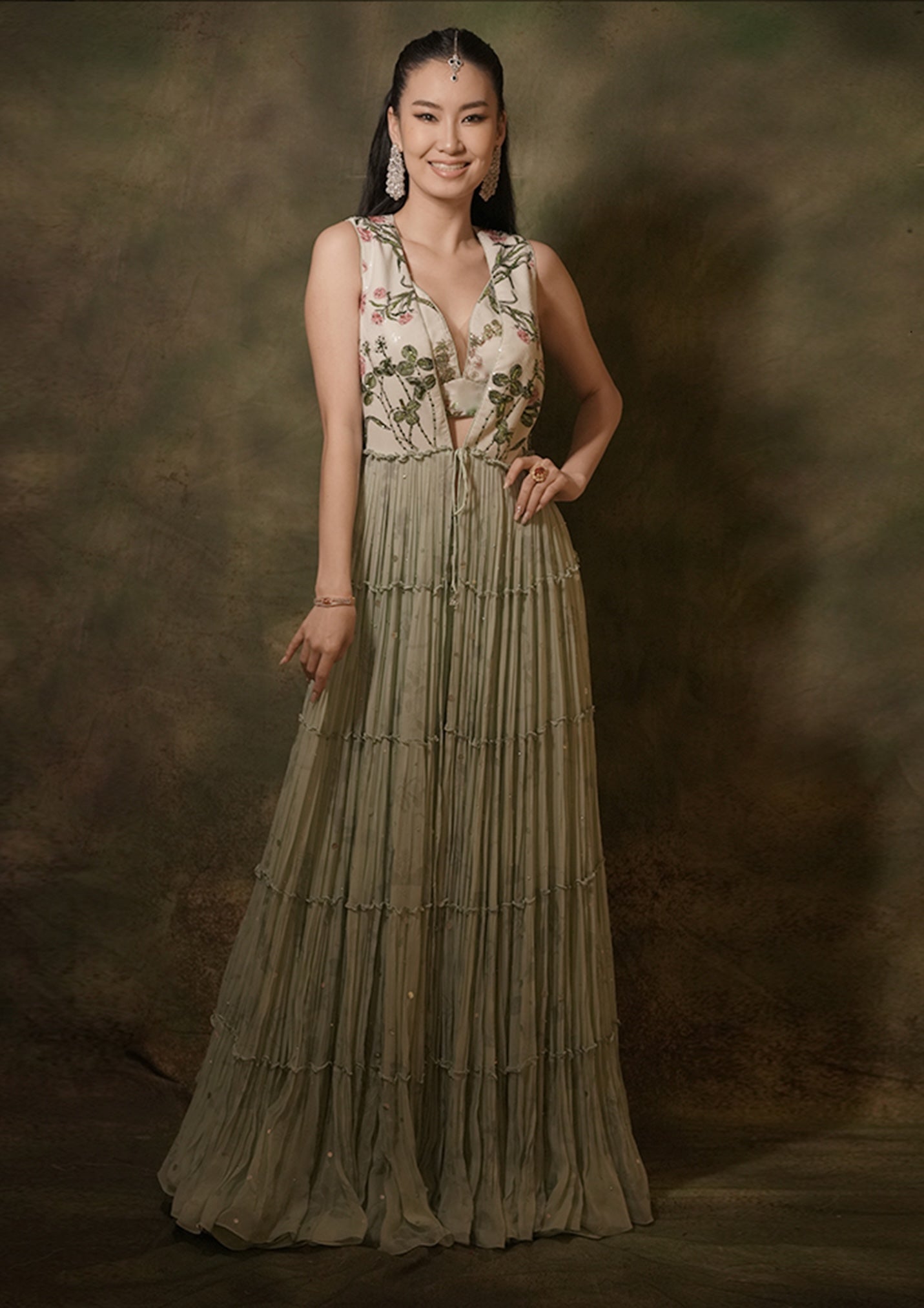 Immerse yourself in the serene beauty of this outfit, where pastel light green hues are elegantly complemented by exquisite pearl embroidery. The georgette tiered jacket features floral sequins work at the top and scattered sequins in the tiered sections, adding a touch of sparkle and sophistication. It is paired with a sequins-embellished blouse and a georgette lehenga skirt, creating a harmonious and refined ensemble. Perfect for any special occasion, this outfit seamlessly blends grace with contemporary style.