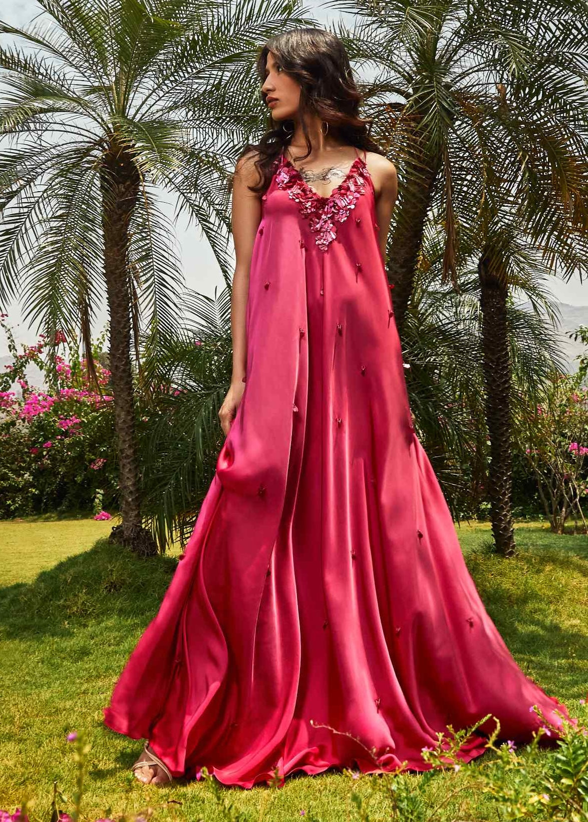 Discover elegance redefined with our cerise pink bias dress, a masterpiece in satin that seamlessly blends sophistication with contemporary flair. This stunning dress features delicate noodle straps and showcases exquisite embroidery, adorned with intricate asymmetric sequins and beads for a touch of opulence. Perfect for any special occasion, the dress’s rich cerise hue and detailed craftsmanship promise to make a lasting impression. Elevate your wardrobe with this statement piece, designed to celebrate your unique style and grace.