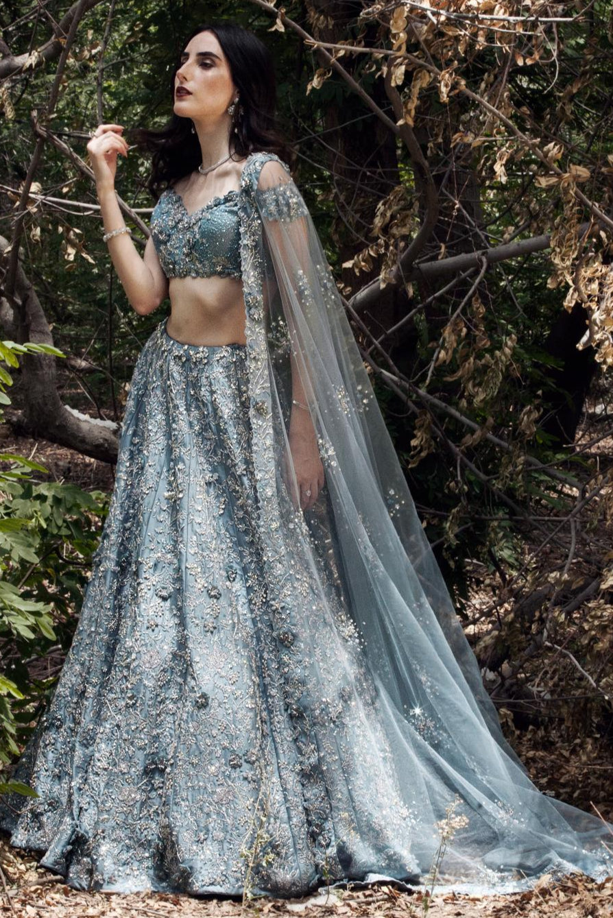 Cerulean blue 3d flower embellished lehanga set