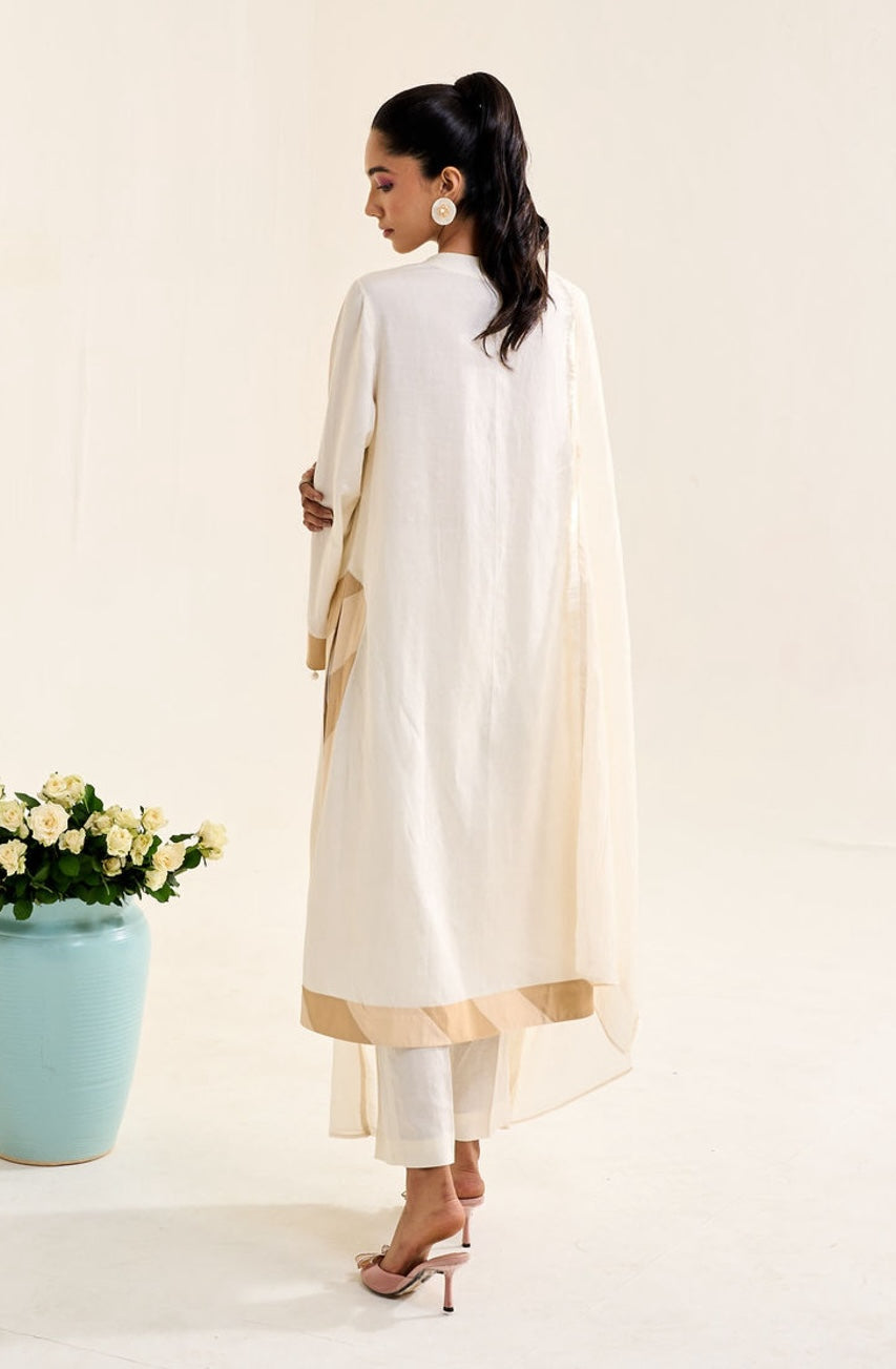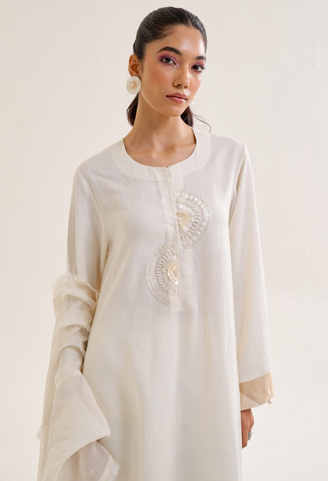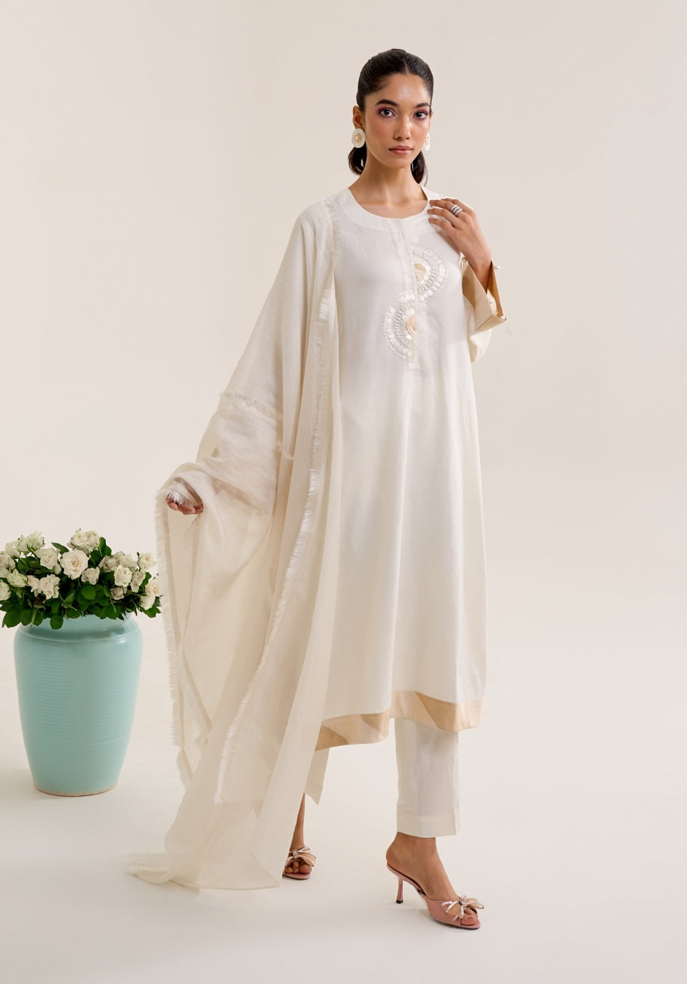 Discover timeless sophistication with our Long Kurta, featuring a hand-embellished neckline that exudes intricate elegance and artisanal craftsmanship. This exquisite kurta is beautifully paired with matching pants and a coordinating dupatta, creating a seamlessly refined ensemble. Ideal for festive celebrations and formal occasions, the combination of detailed handwork and classic design ensures you stand out with grace and style. Embrace a look that merges traditional charm with modern elegance.
