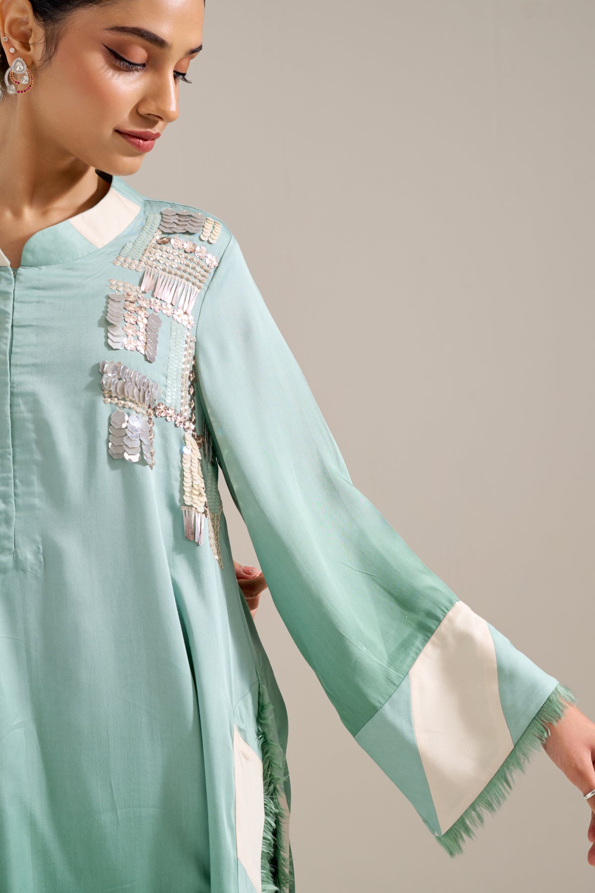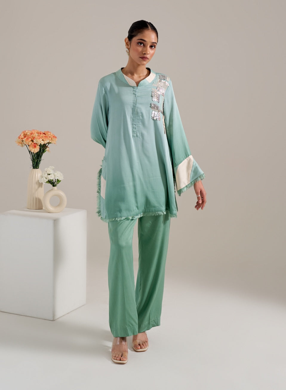 Elevate your style with this exquisite co-ord set, featuring a hand-embellished shoulder motif that adds a sophisticated touch of artistry. The set includes matching pants, creating a seamlessly chic and coordinated look. Perfect for special occasions or upscale events, this ensemble combines intricate detailing with modern design to ensure you make a lasting impression. Embrace contemporary elegance and refined craftsmanship with this stunning outfit.
