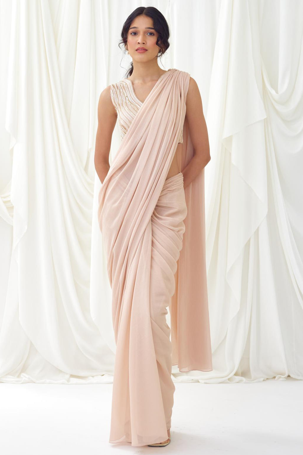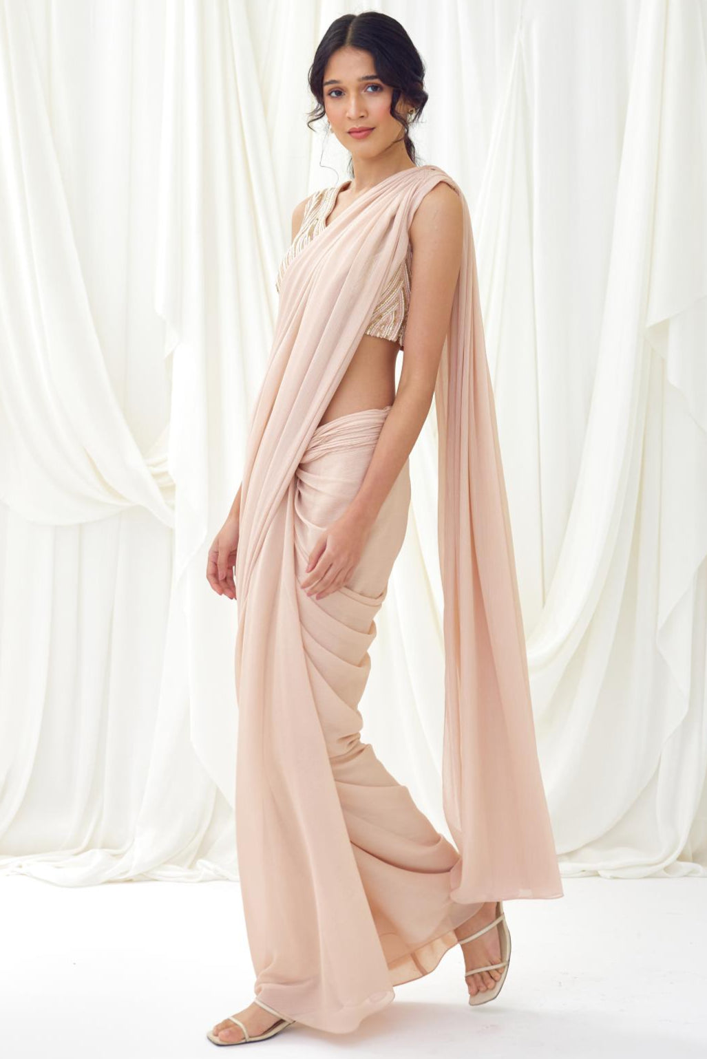 Step into elegance with our Sunset Waltz Pre-Draped Saree in Champagne. Crafted from shimmery "moon-dusted" georgette, this knotted draped saree exudes effortless glamour. Paired with our signature wave blouse, adorned with pearls, sequins, and blush-gold beadwork, it's the perfect fusion of sophistication and sparkle for your next soirŽe.