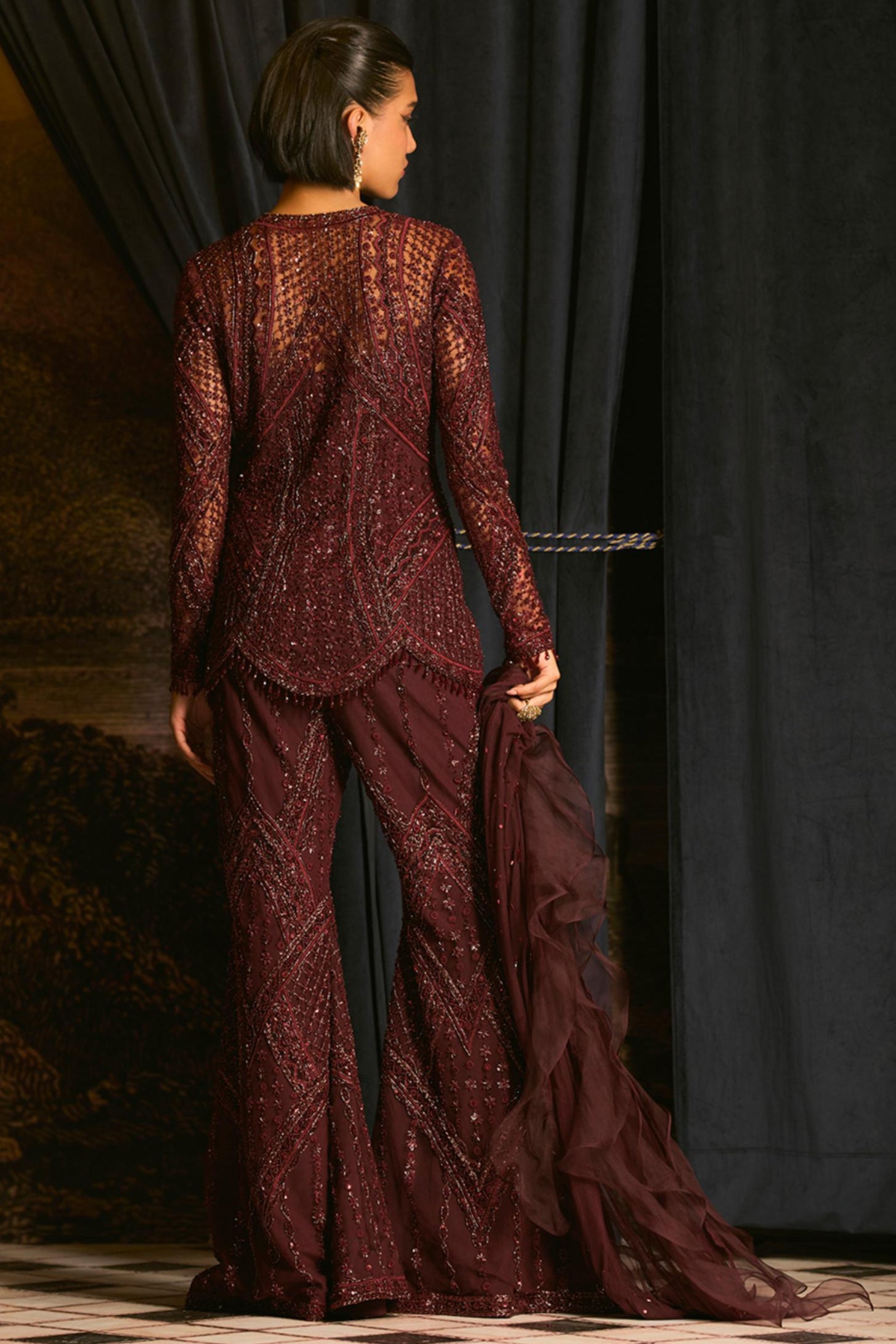 Embrace elegance with this deep wine set, featuring tonal embroidery on the kurta paired with flared palazzos for a graceful silhouette. The ensemble is complemented by a net embroidered dupatta, adding a touch of delicacy. Perfect for festive occasions or evening celebrations, this set combines sophistication with contemporary charm.