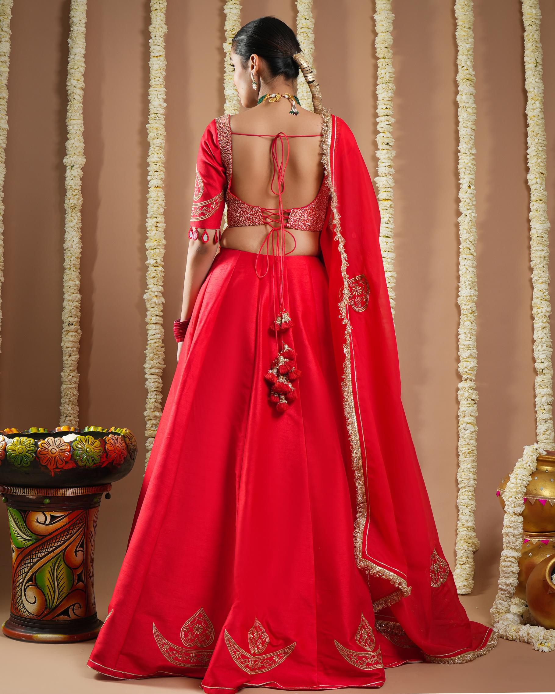 Ignite your festive look with the Chilli Red Avyanna Heavy Lehenga Set. Featuring a fiery hue and exquisite detailing, this ensemble is perfect for weddings, grand celebrations, and unforgettable occasions.
