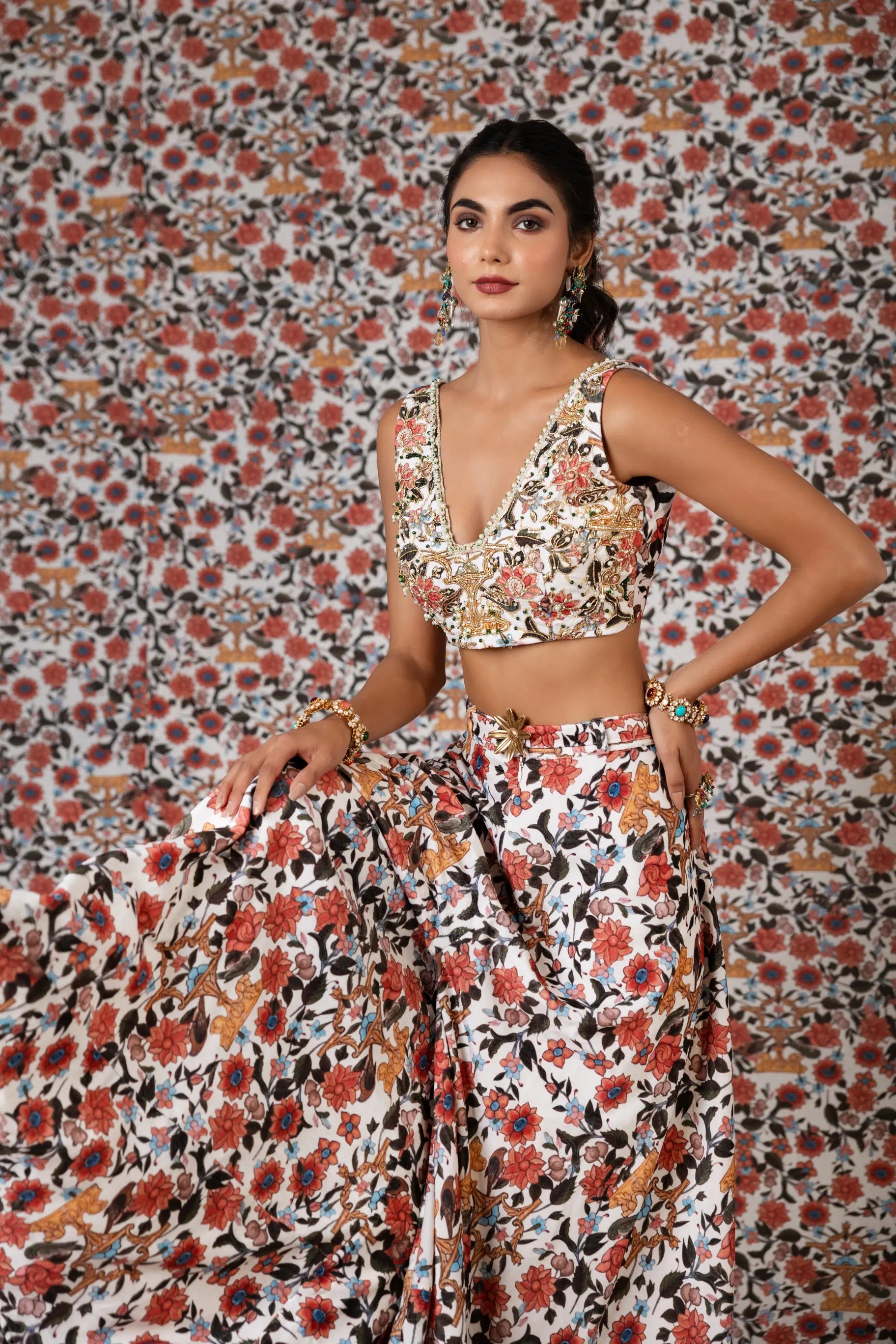 This chintz printed crop top paired with flared pants is the perfect fusion of vintage charm and contemporary style. Featuring a timeless chintz print, the crop top showcases intricate floral patterns that exude elegance and sophistication, while the flared pants add a bold, retro-inspired twist. Together, they create a chic, comfortable, and fashionable ensemble ideal for casual outings, brunches, or even evening events.