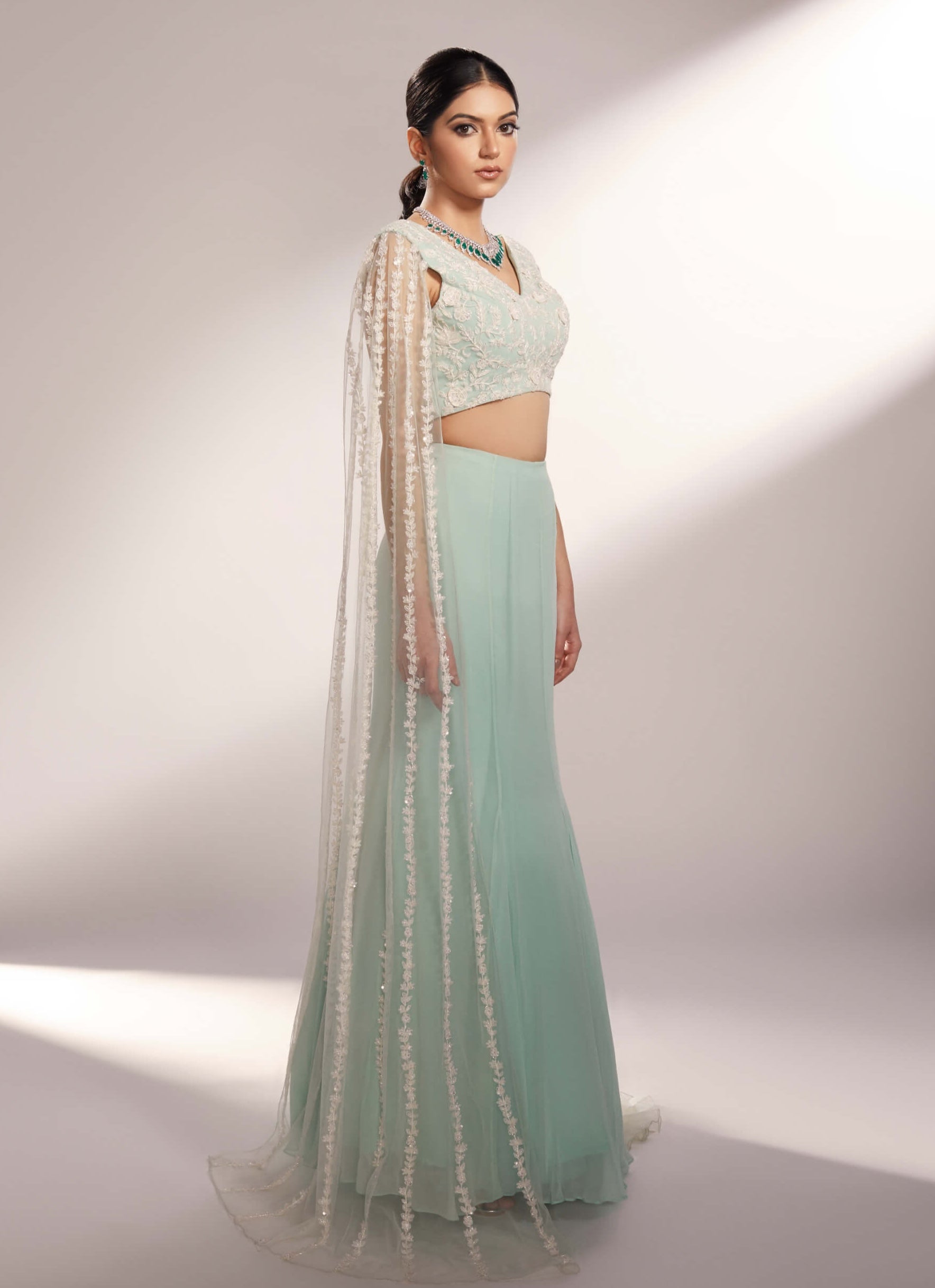 Experience the ethereal charm of our light aqua fishtail lehenga, a perfect blend of grace and glamour. This enchanting ensemble is paired with a cape sleeve blouse that exudes contemporary elegance, adorned with intricate 3D floral details that create a mesmerizing texture. The lehenga and blouse are embellished with delicate glass beads and exquisite threadwork, adding a touch of opulence and sophistication. The fishtail silhouette of the lehenga enhances your natural grace, making this outfit an ideal choice for those seeking to radiate timeless beauty at any special occasion.
