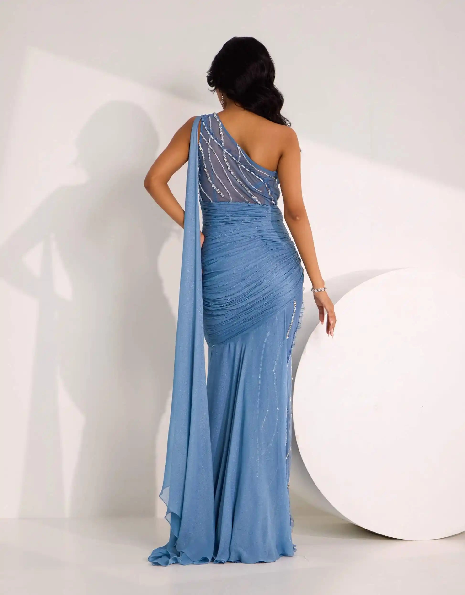 Introducing the cielle one-shoulder ruched gown in a striking blue hue, designed for those who appreciate elegance and sophistication. This stunning gown features exquisite mix media embroidery that adds depth and texture, creating a truly unique look. The one-shoulder design beautifully highlights your neckline, while the flattering ruching enhances your silhouette for a graceful fit.