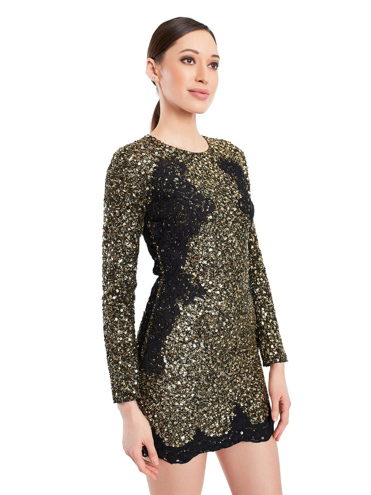 This classic black and gold short dress is a stunning example of timeless elegance. Featuring full sleeves and a round neckline, it is beautifully adorned with intricate sequined embroidery that creates a striking, artistic effect. The interplay of black and gold sequins offers a sophisticated and glamorous look, making this dress the perfect choice for any special occasion where you want to make a memorable impression.