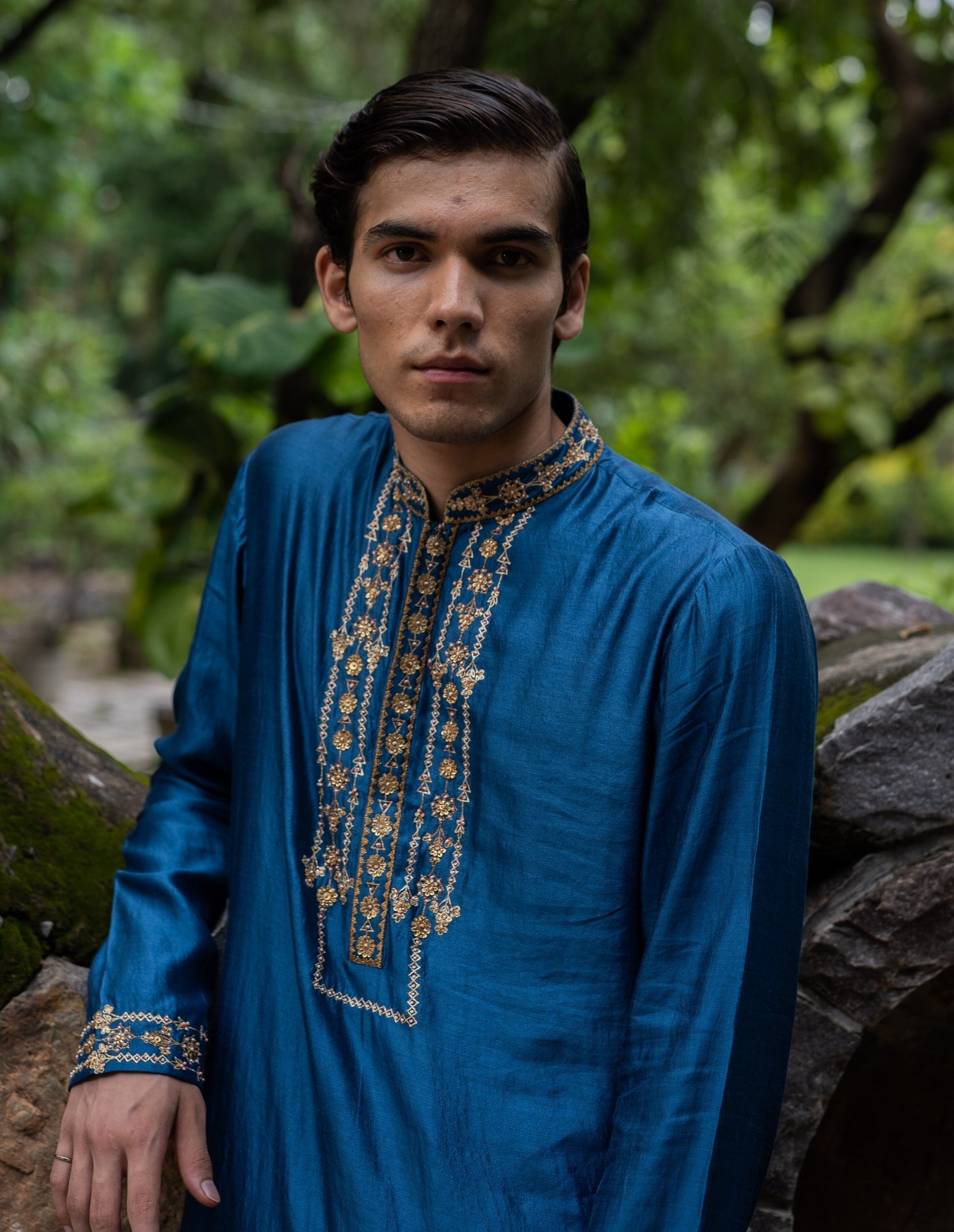 Discover timeless elegance with our cobalt blue silk kurta, exquisitely hand-embroidered with a mix of aari, zardosi, and sequins on the yoke. The kurta is paired with matching chudi pants, offering a refined and cohesive look. Perfect for any special occasion, this ensemble combines luxurious silk with intricate craftsmanship for a stunning appearance.