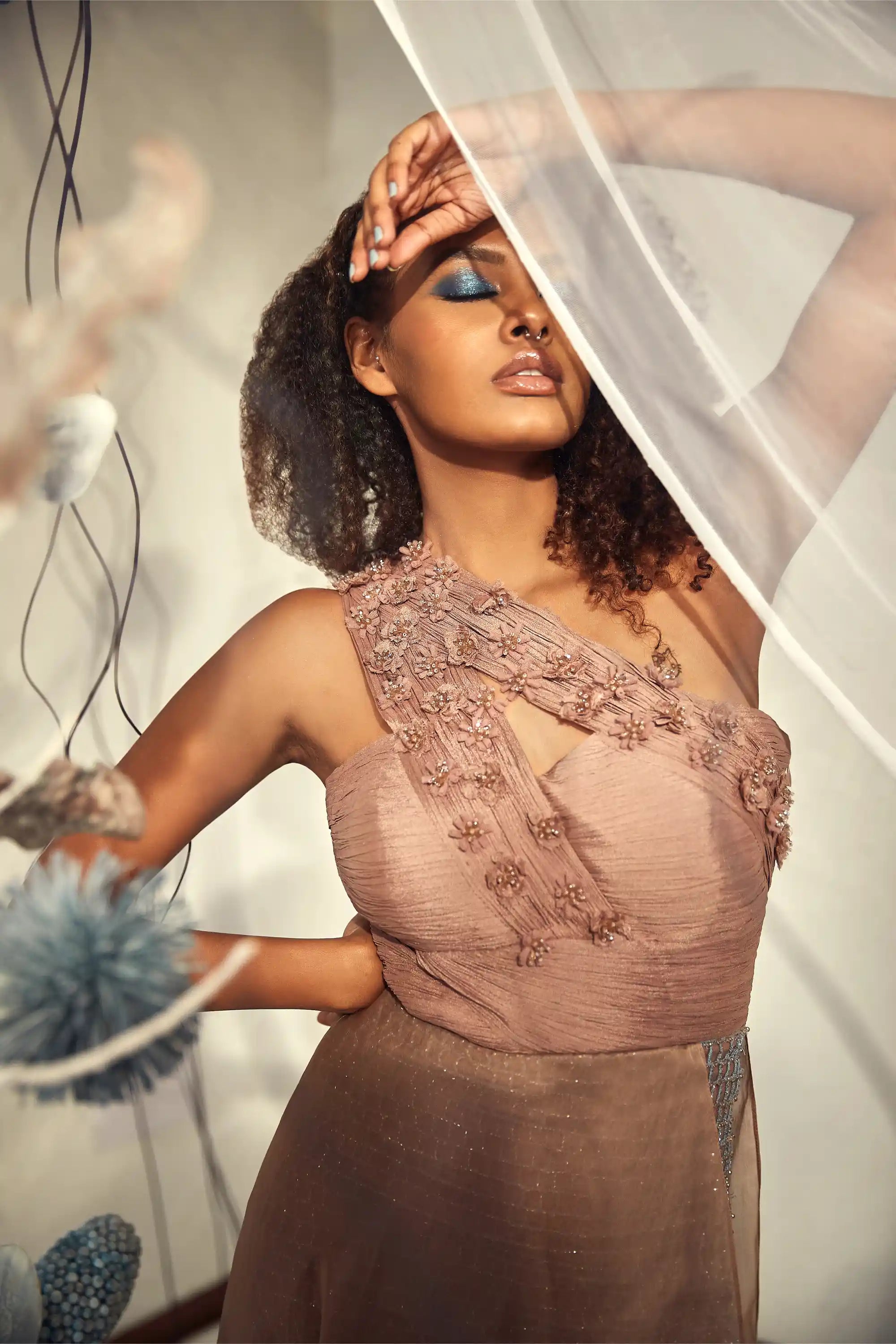 Step into elegance with this coffee-toned one-shoulder short dress, featuring exquisite delicate latticework in fine thread and sparkling crystals. The stunning ombré organza drape skirt adds a romantic flair, cascading beautifully for a dynamic look. Complemented by a ruched bodice and adorned with striking 3D monochrome flowers, this dress seamlessly blends sophistication with contemporary style, making it perfect for special occasions or evening events. Make a statement and turn heads in this captivating piece!