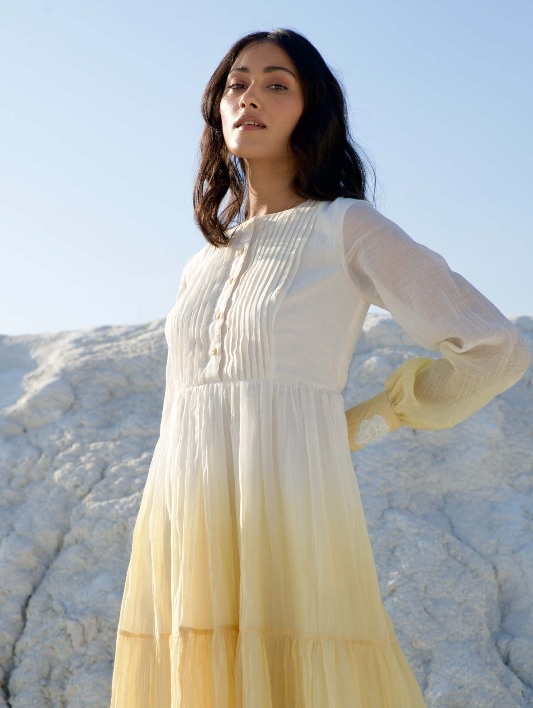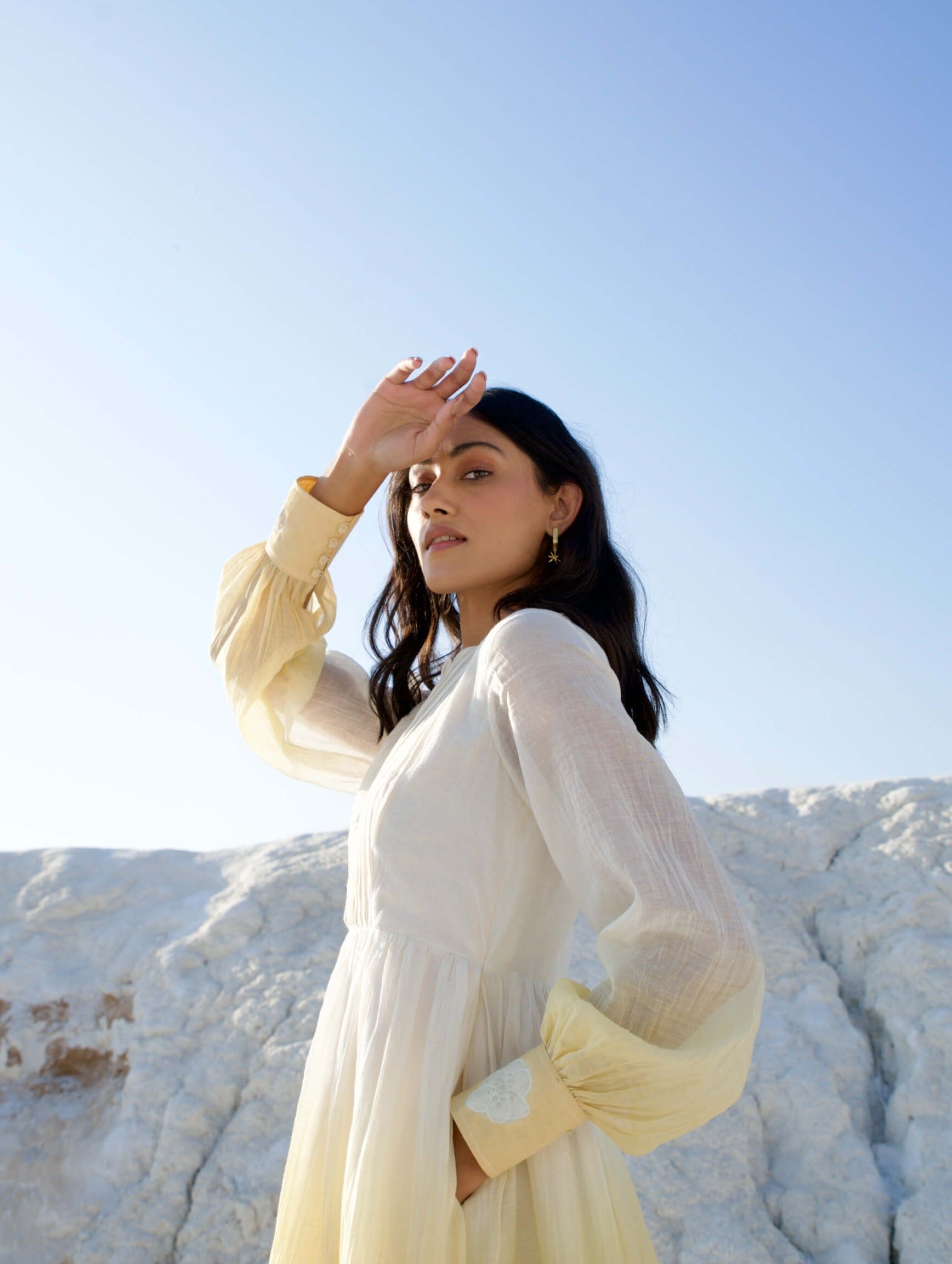 This supremely soft and lightweight chanderi silk dress features a captivating blend of pearl white and vanilla yellow. Designed with a buttoned-down boat neckline, this two-tier dress boasts balloon sleeves with broad cuffs and practical side pockets. The bodice is detailed with intricate knife pleats, adorned with handcrafted buttons for a touch of artisanal charm. Adding to its allure is a beautifully embroidered petal flower, complemented by fine baking detail at the hem. Perfect for making a statement with sophistication, this dress combines elegance with comfort seamlessly.