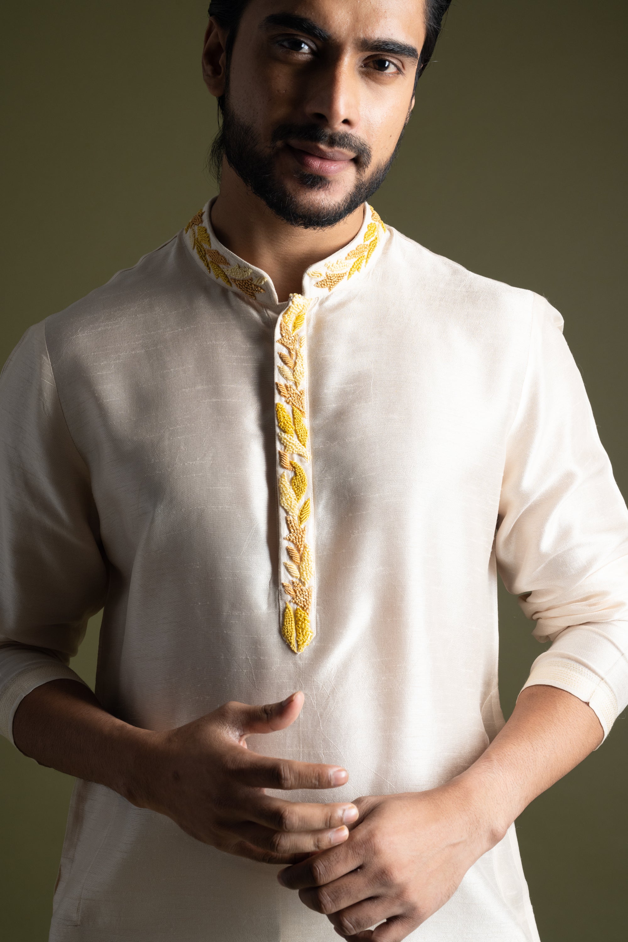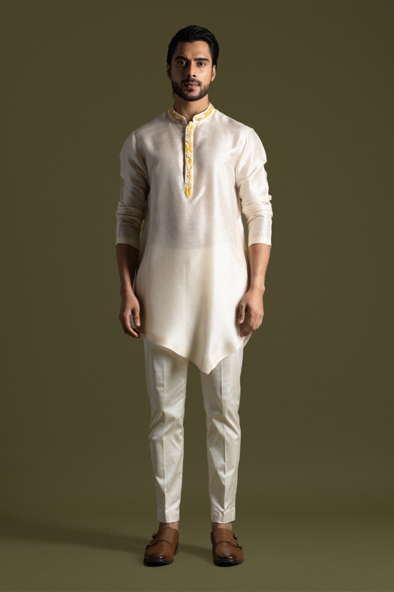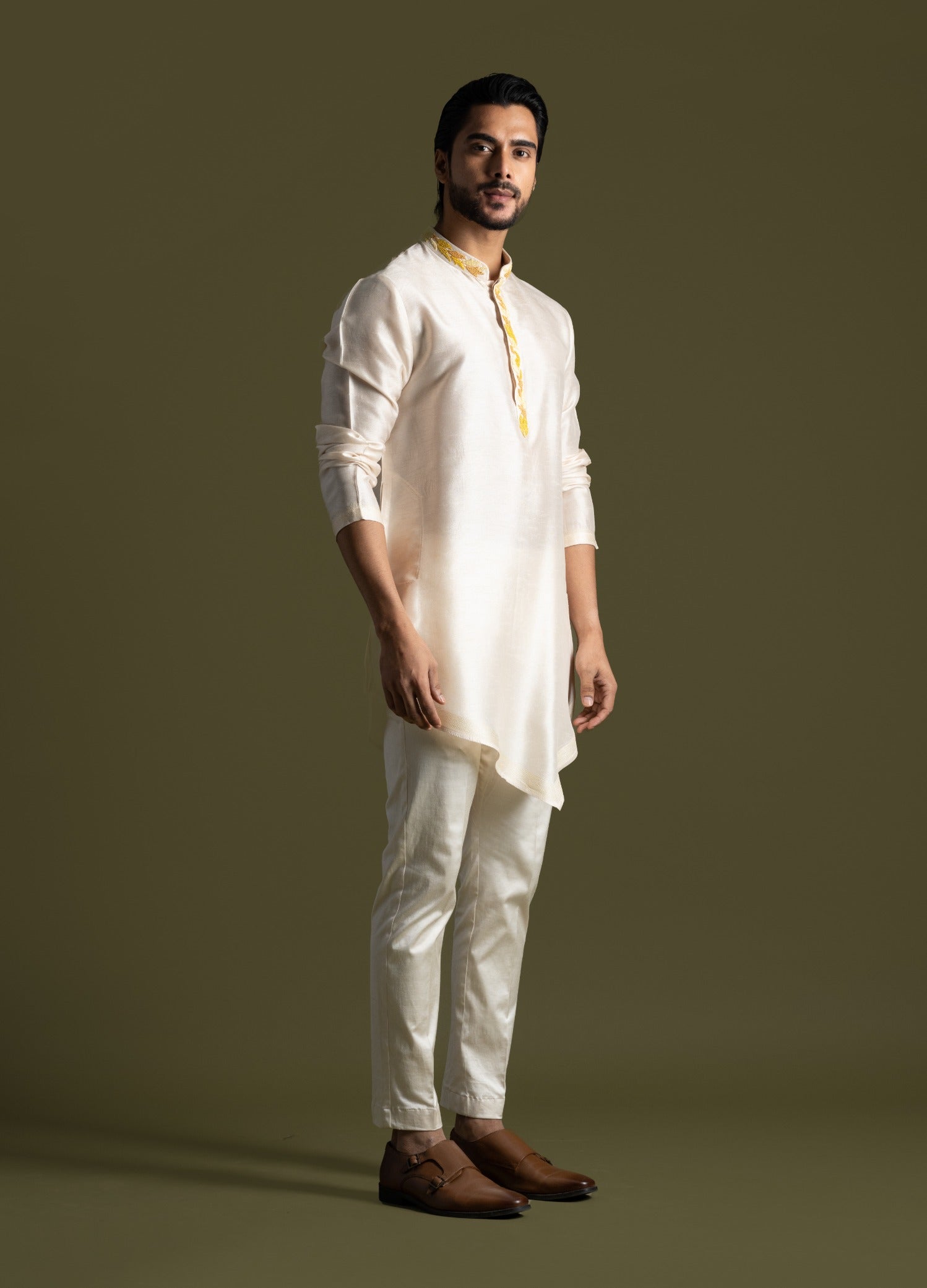Elevate your wardrobe with our exquisite cream silk kurta, a masterpiece of contemporary design and traditional craftsmanship. Featuring a sophisticated asymmetric cut, this kurta offers a unique, modern silhouette while maintaining a timeless elegance. Delicate embroidery gracefully adorns the collar and button placket, adding a touch of refined detail to this luxurious piece. Perfectly paired with matching cream pant pajamas, this ensemble seamlessly blends comfort with style. Ideal for both festive occasions and elegant gatherings, this silk kurta set ensures you make a lasting impression.