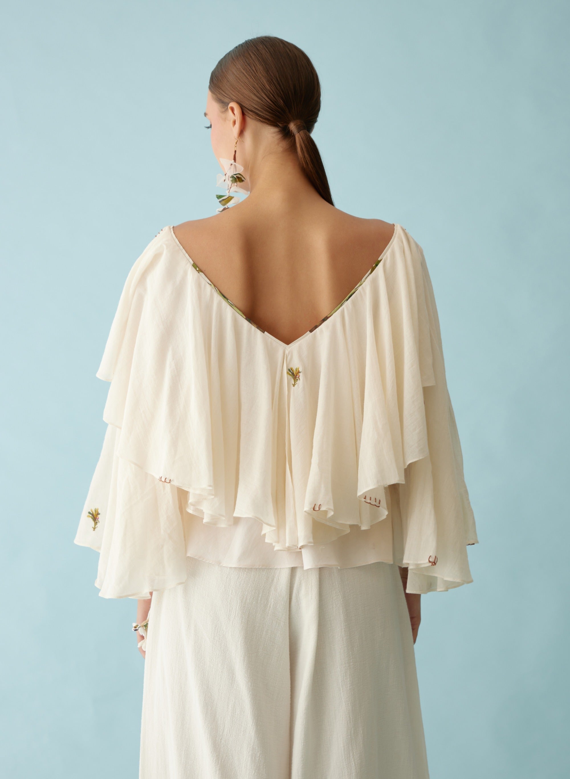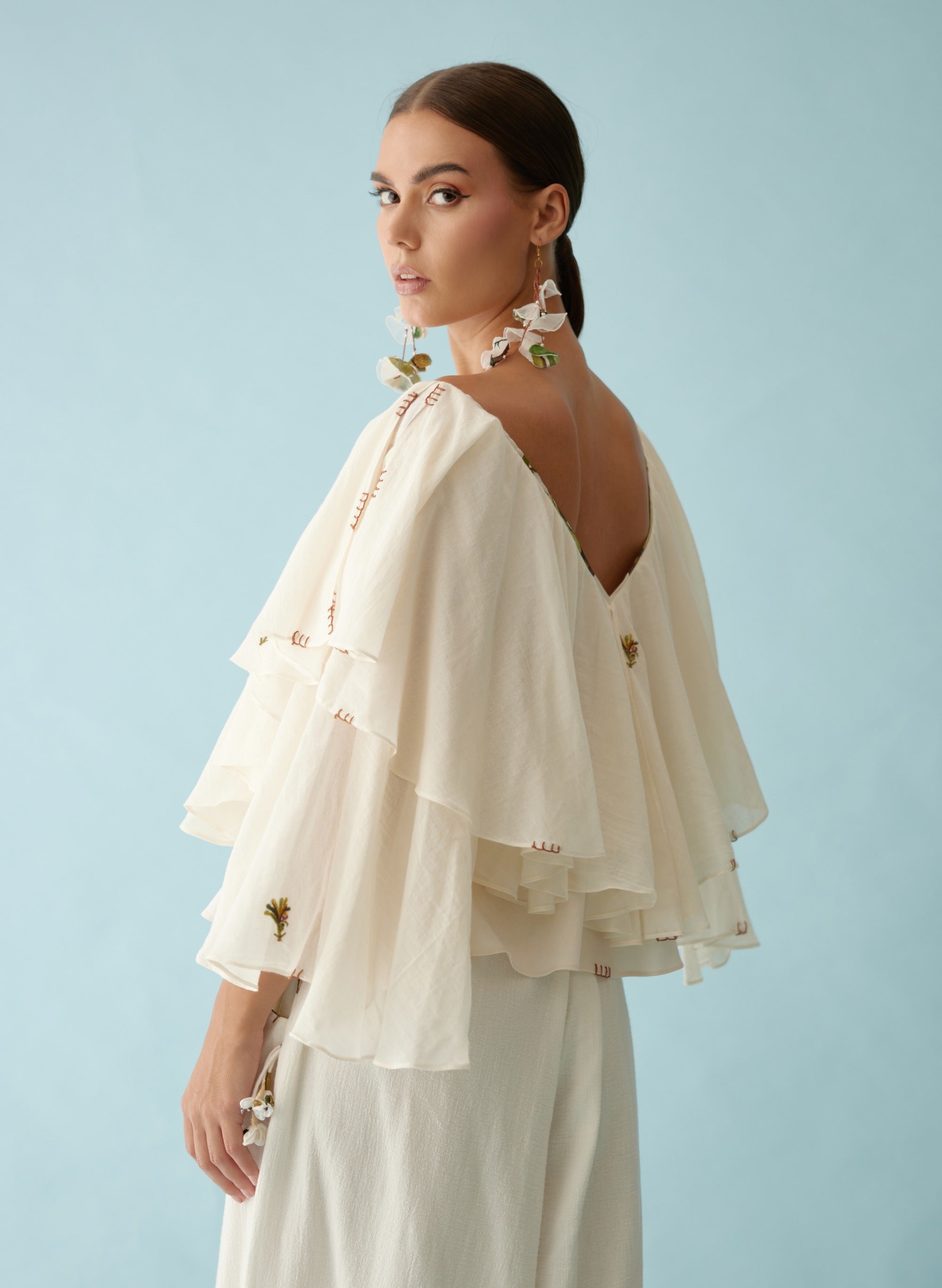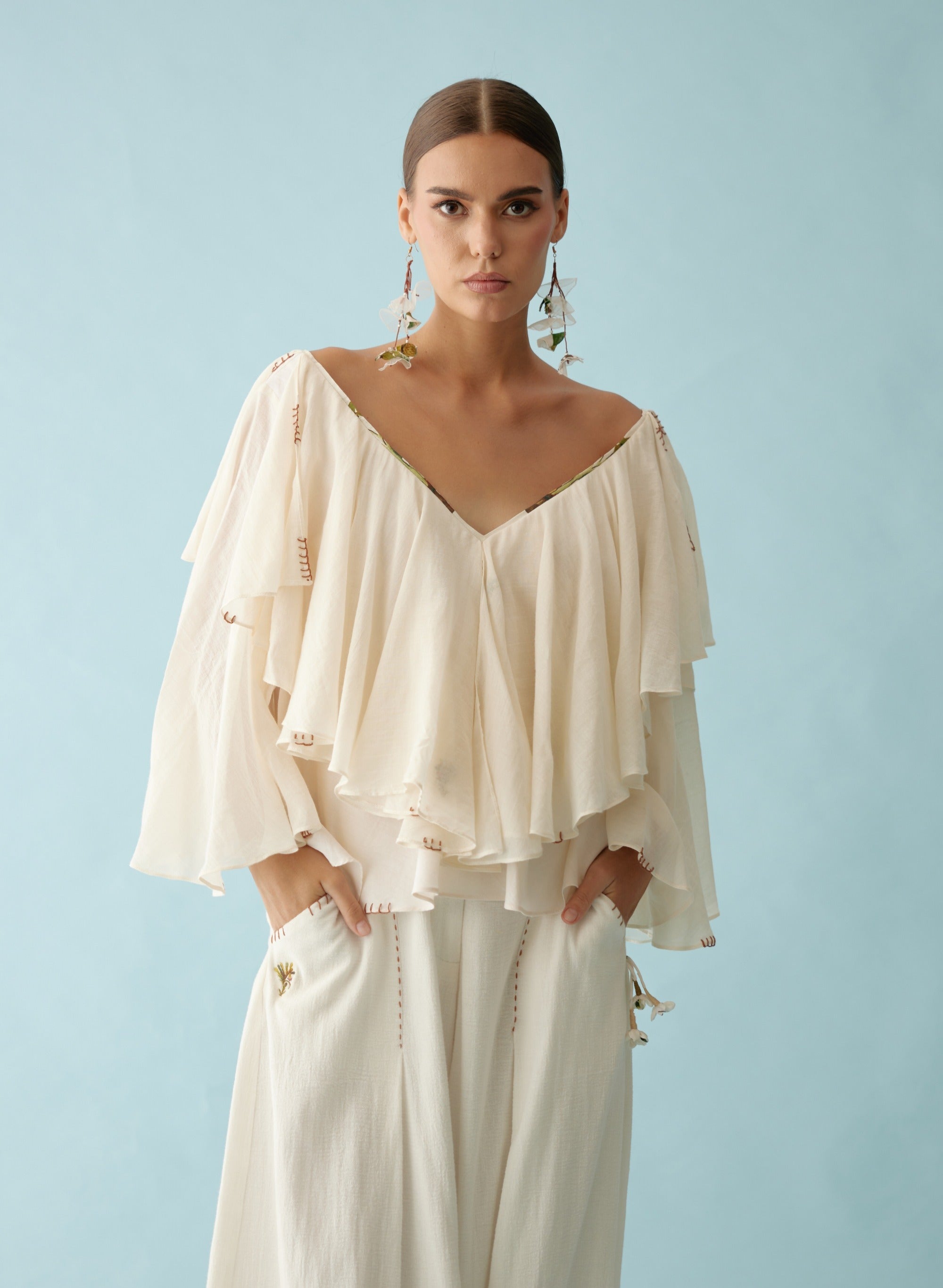 Elevate your style with our cream frill top, adorned with charming banana tree appliqué and exquisite hand-stitched details. Crafted from high-quality cotton, this top combines delicate frills with artisanal craftsmanship for a sophisticated yet playful look. The unique banana tree appliqué adds a touch of whimsy, while the hand-stitched accents enhance its elegance. Ideal for adding a touch of refined detail to your wardrobe, this top is perfect for both casual outings and special occasions.