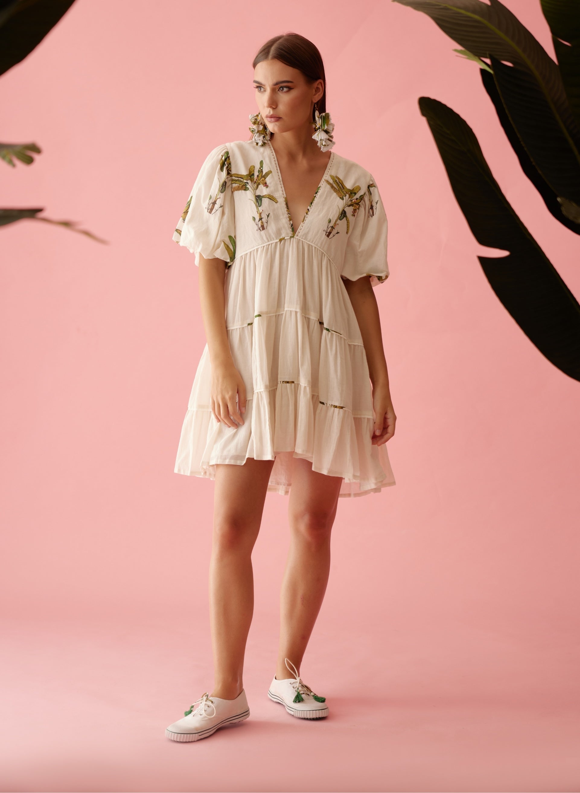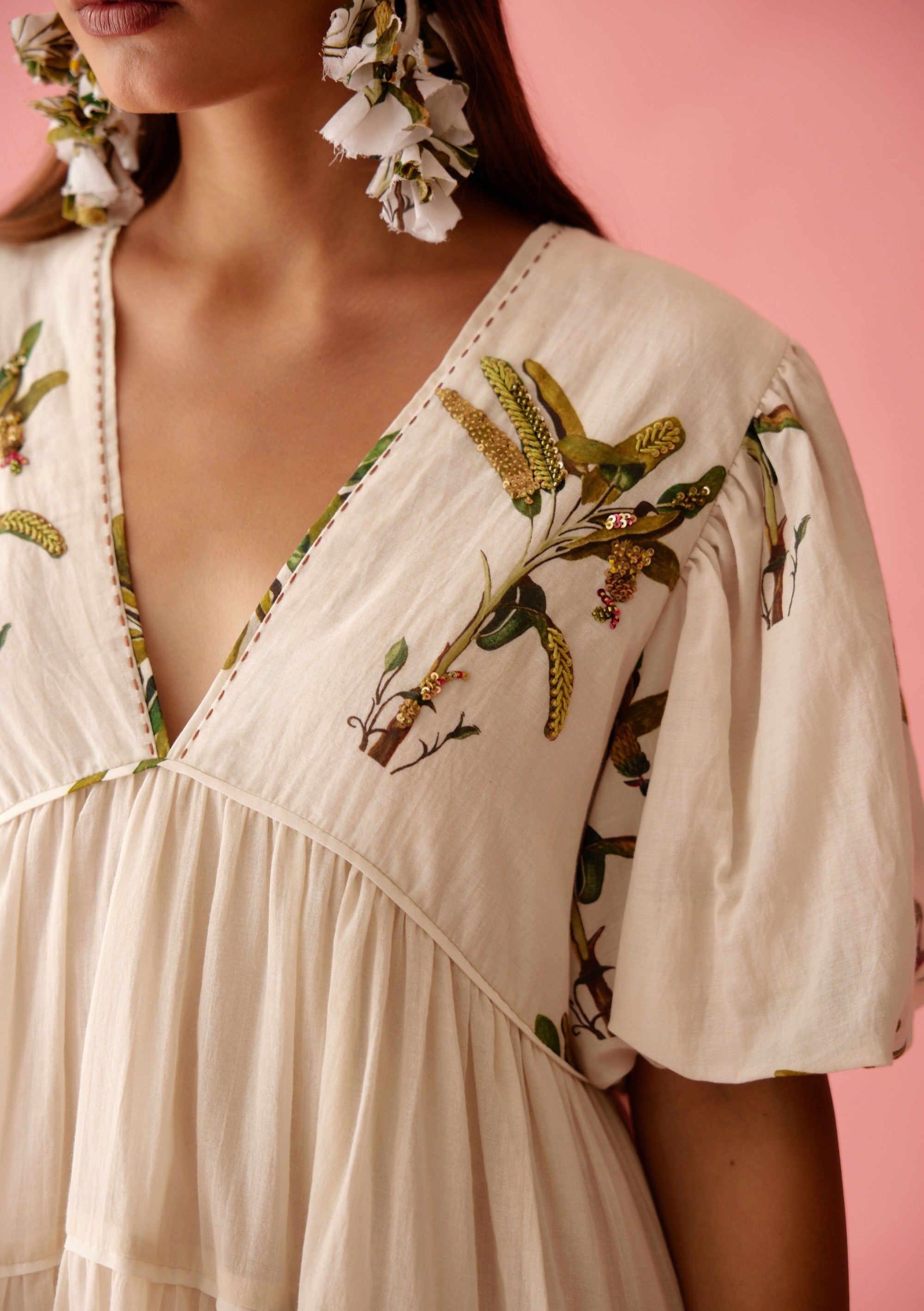 Elevate your style with our cream bubble sleeves tier dress, designed for both comfort and elegance. Crafted from high-quality cotton, this dress features playful bubble sleeves and a tiered silhouette that enhances its graceful movement. The yoke is adorned with charming banana tree print detailing, adding a unique and whimsical touch. Perfect for a variety of occasions, this dress combines contemporary fashion with artisanal flair, making it a standout piece in any wardrobe.