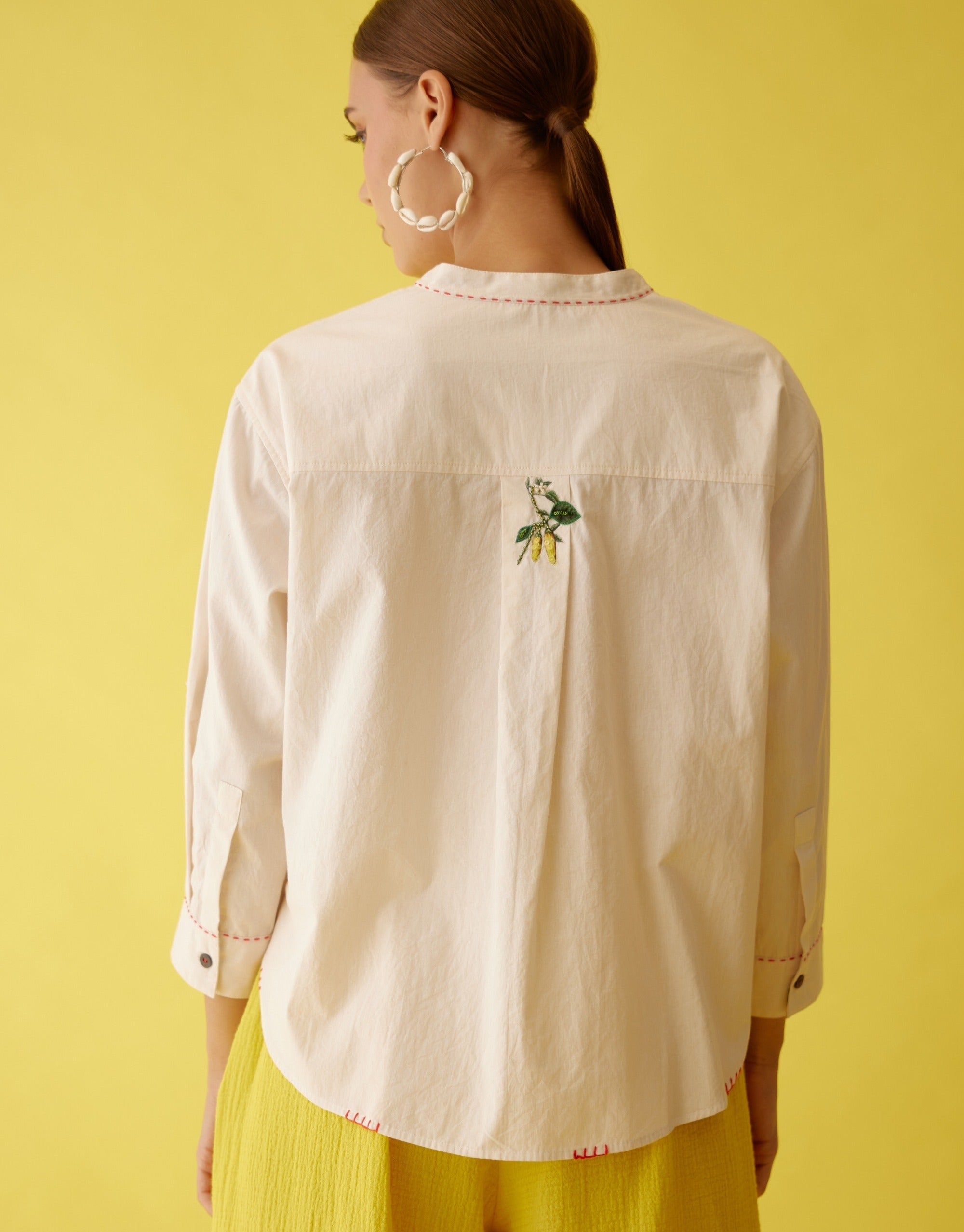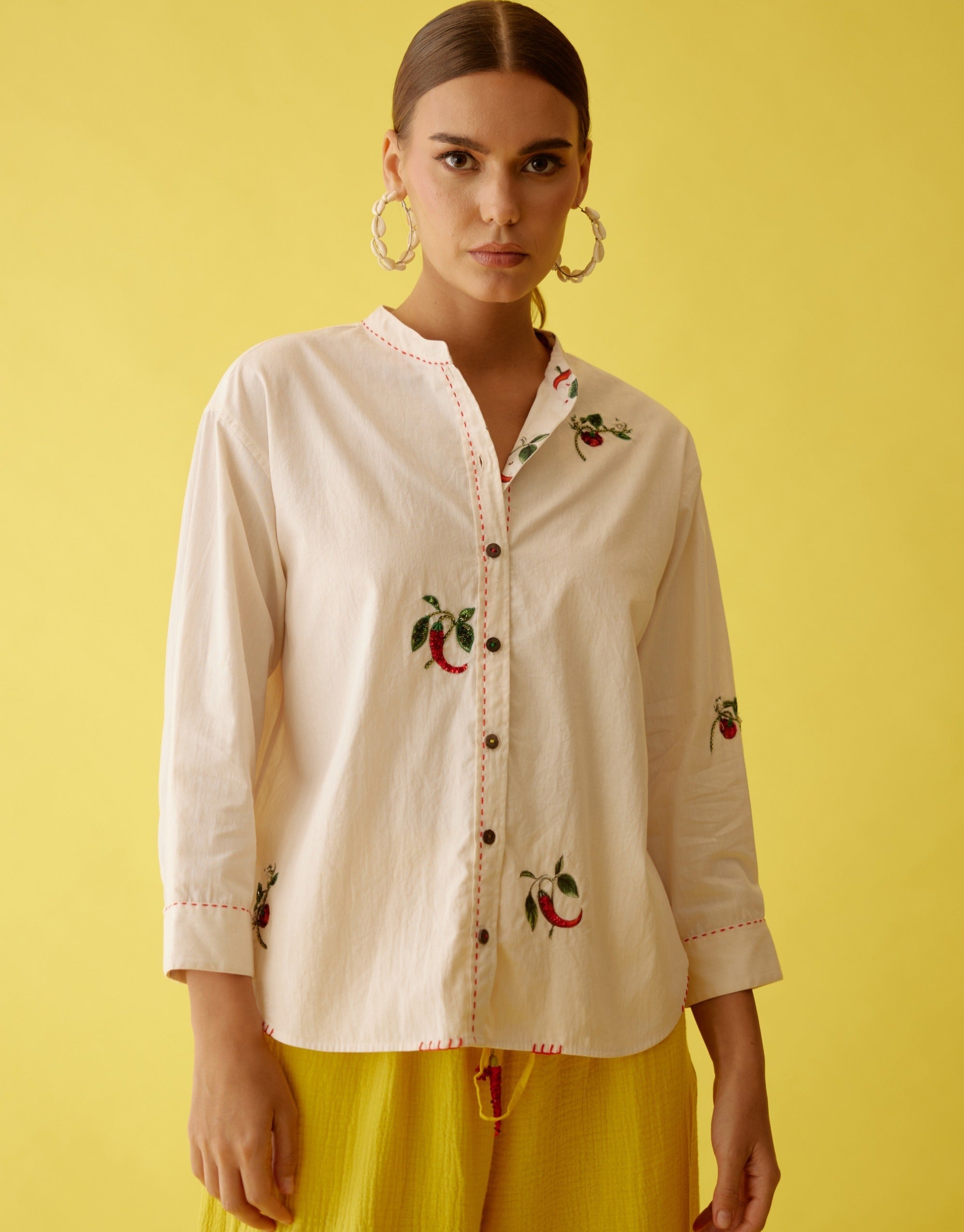 Discover timeless elegance with our cream top, featuring exquisite hand-embroidered chili appliqué adorned with sequins, thread, and meticulous hand-stitching. Crafted from high-quality cotton, this top combines luxurious comfort with intricate artisanal details, making it a standout piece for any wardrobe. The delicate embroidery and sparkling embellishments create a refined look, perfect for both casual and special occasions. Embrace sophistication and unique craftsmanship with this beautifully designed top that effortlessly enhances your style.