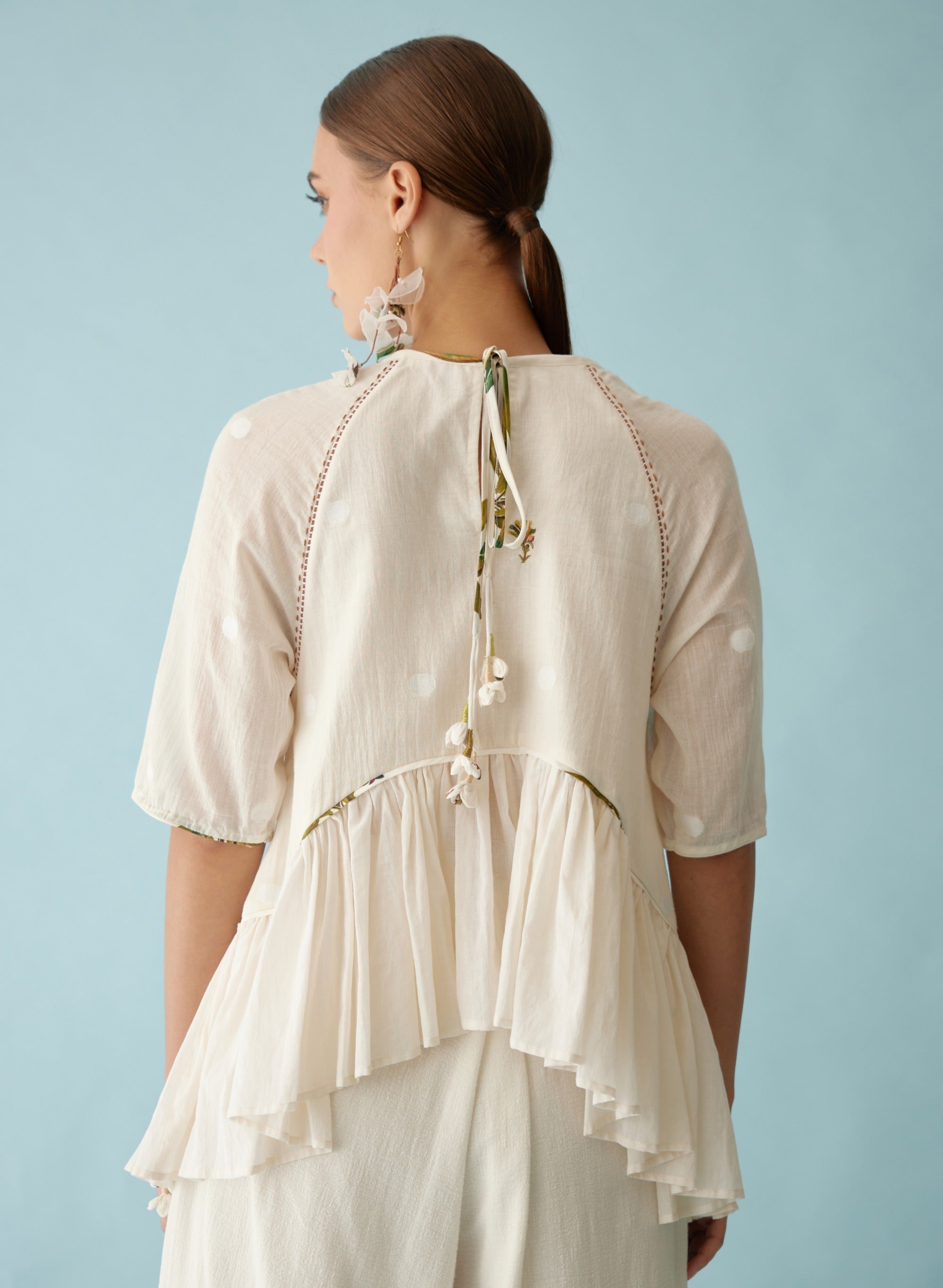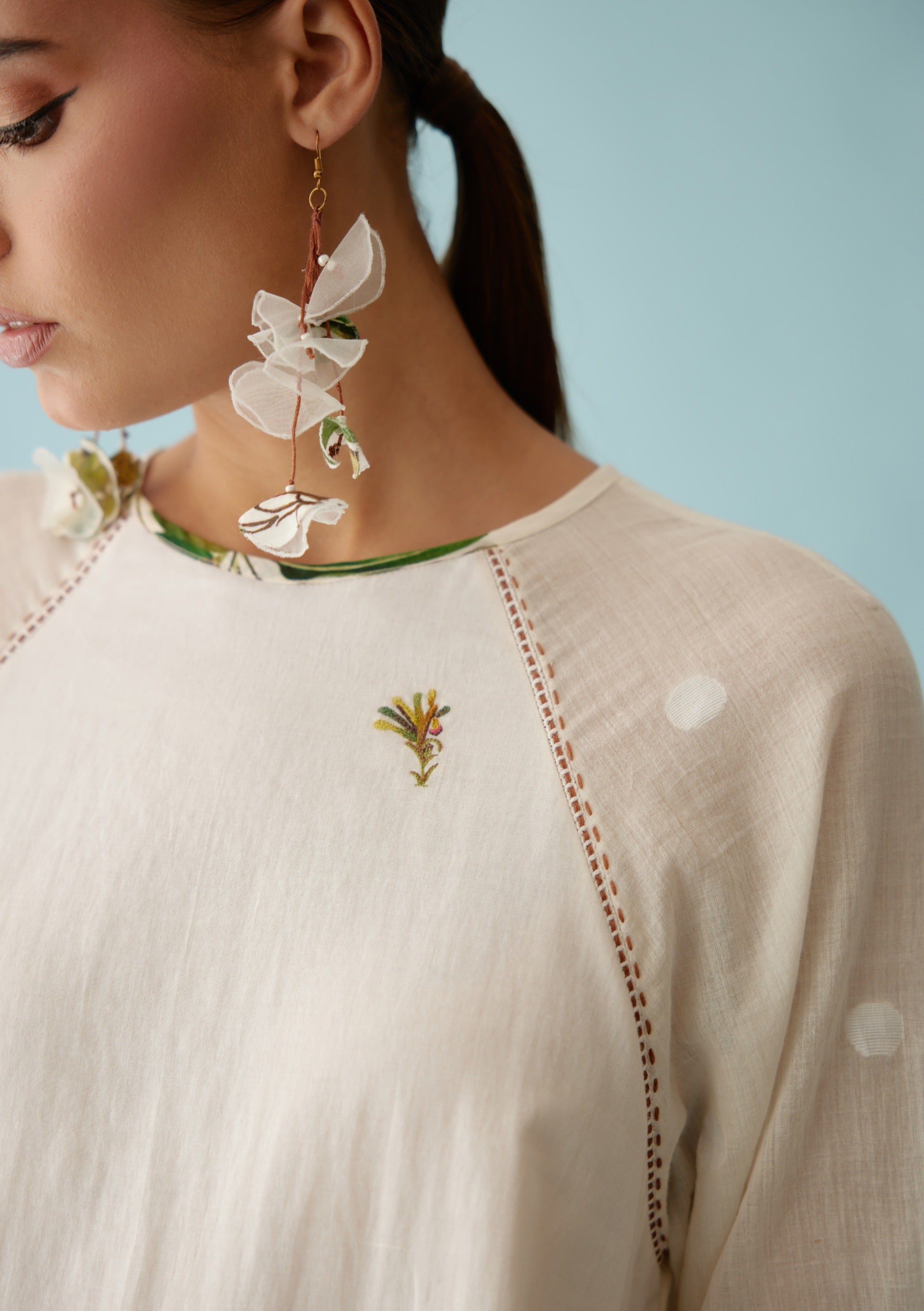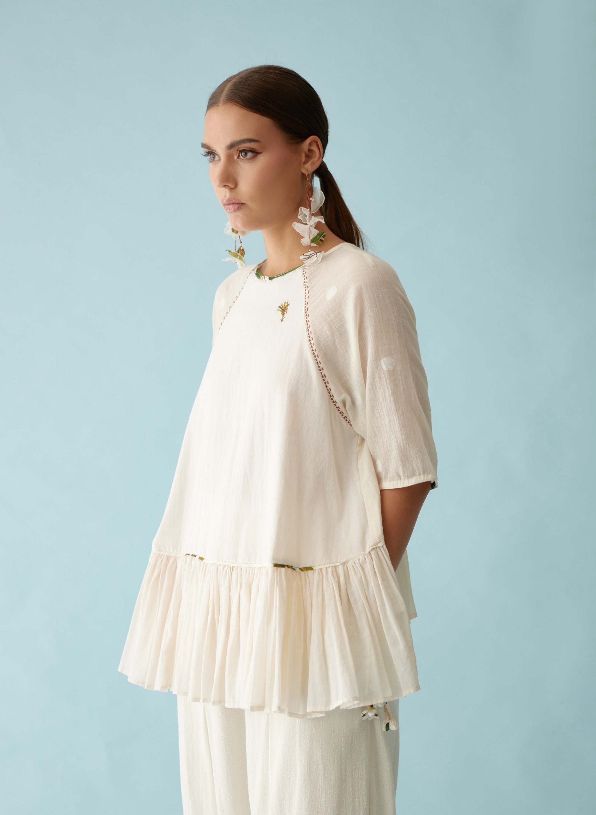 Elevate your style with our cream hi-low top, expertly crafted from handwoven Jamdani cotton. This exquisite piece features a unique banana tree appliqué complemented by delicate handmade flower tassels, adding a touch of artisanal charm. The hi-low hemline offers a contemporary silhouette, while the intricate details highlight the craftsmanship of traditional weaving techniques. Perfect for adding sophistication to both casual and special occasions, this top combines elegance with distinctive design elements, making it a standout addition to any wardrobe.