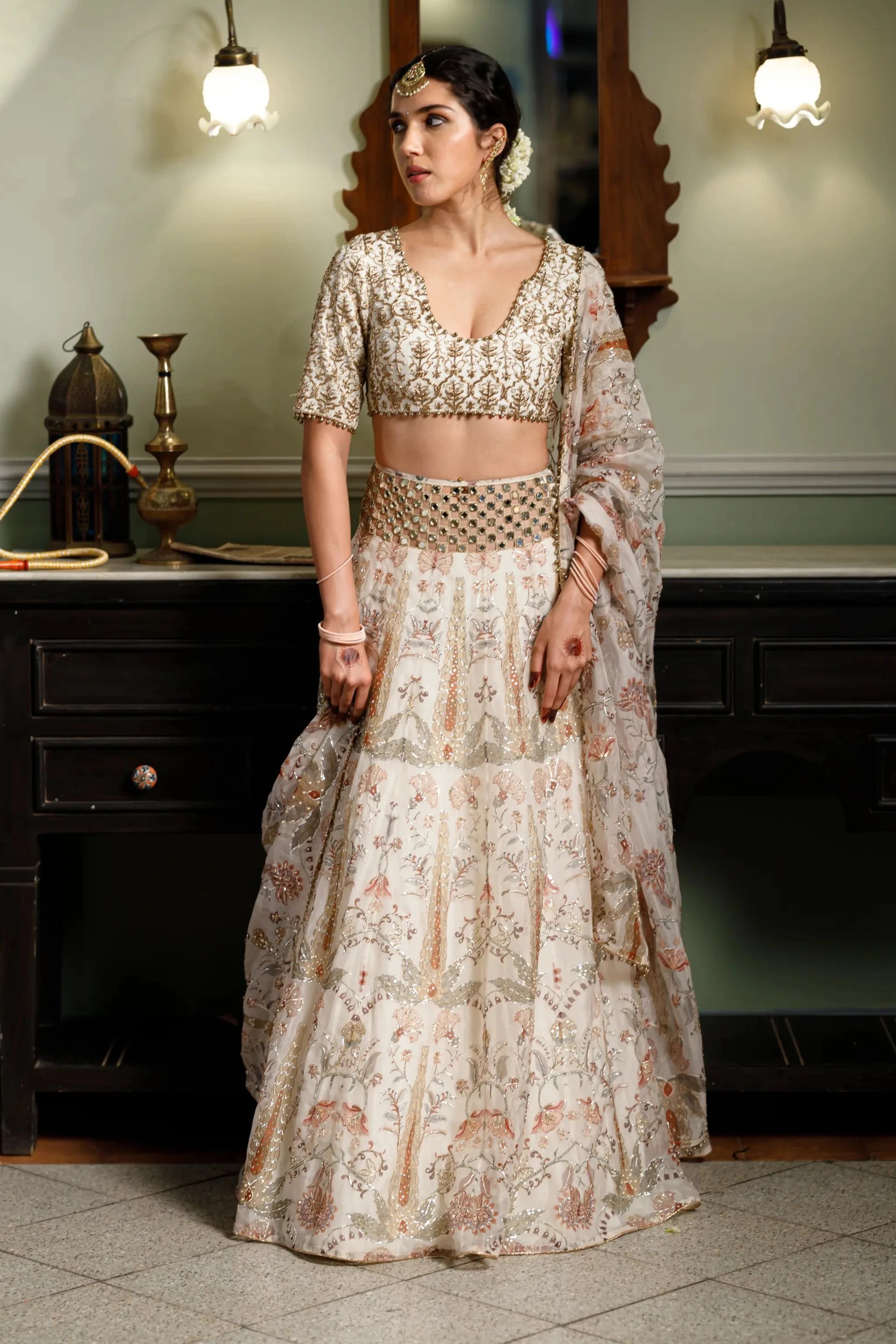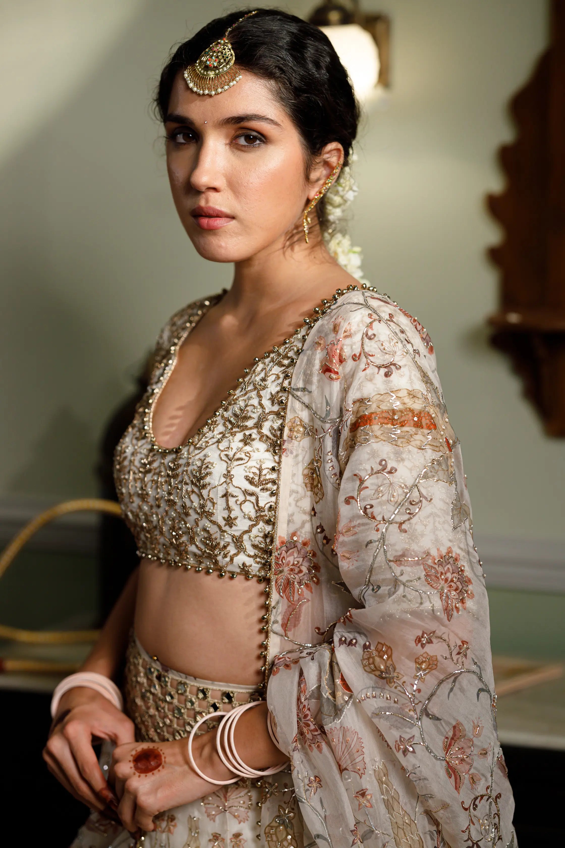 The Sultana Cream Embroidered Choli paired with a cream printed lehenga and an embroidered dupatta creates a look of timeless elegance and sophisticated charm. The intricate embroidery on the choli and dupatta complements the beautiful printed lehenga, making this set ideal for weddings, festivals, or any traditional celebration. The ensemble seamlessly blends classic craftsmanship with modern design for a standout appearance at any special occasion.