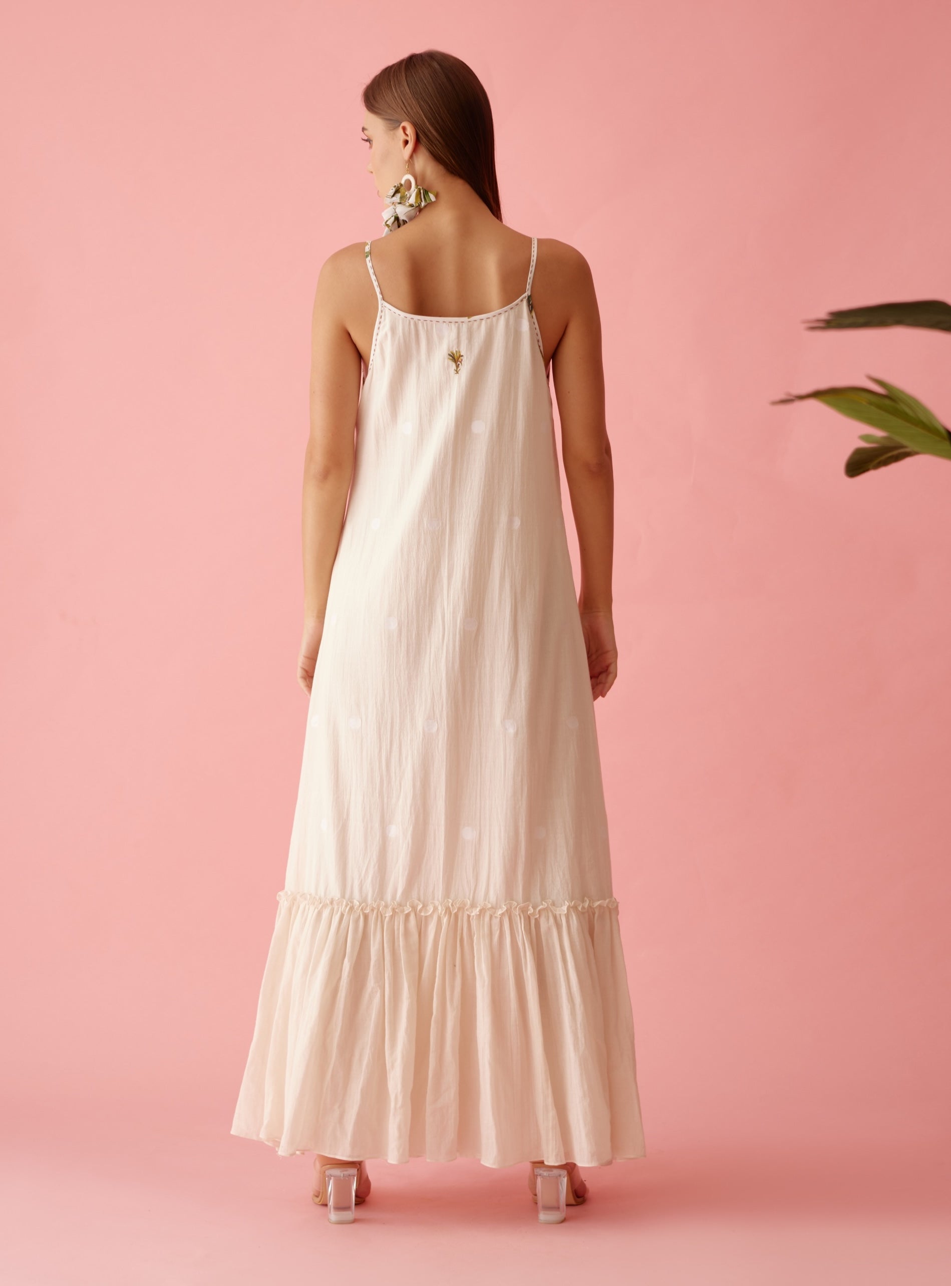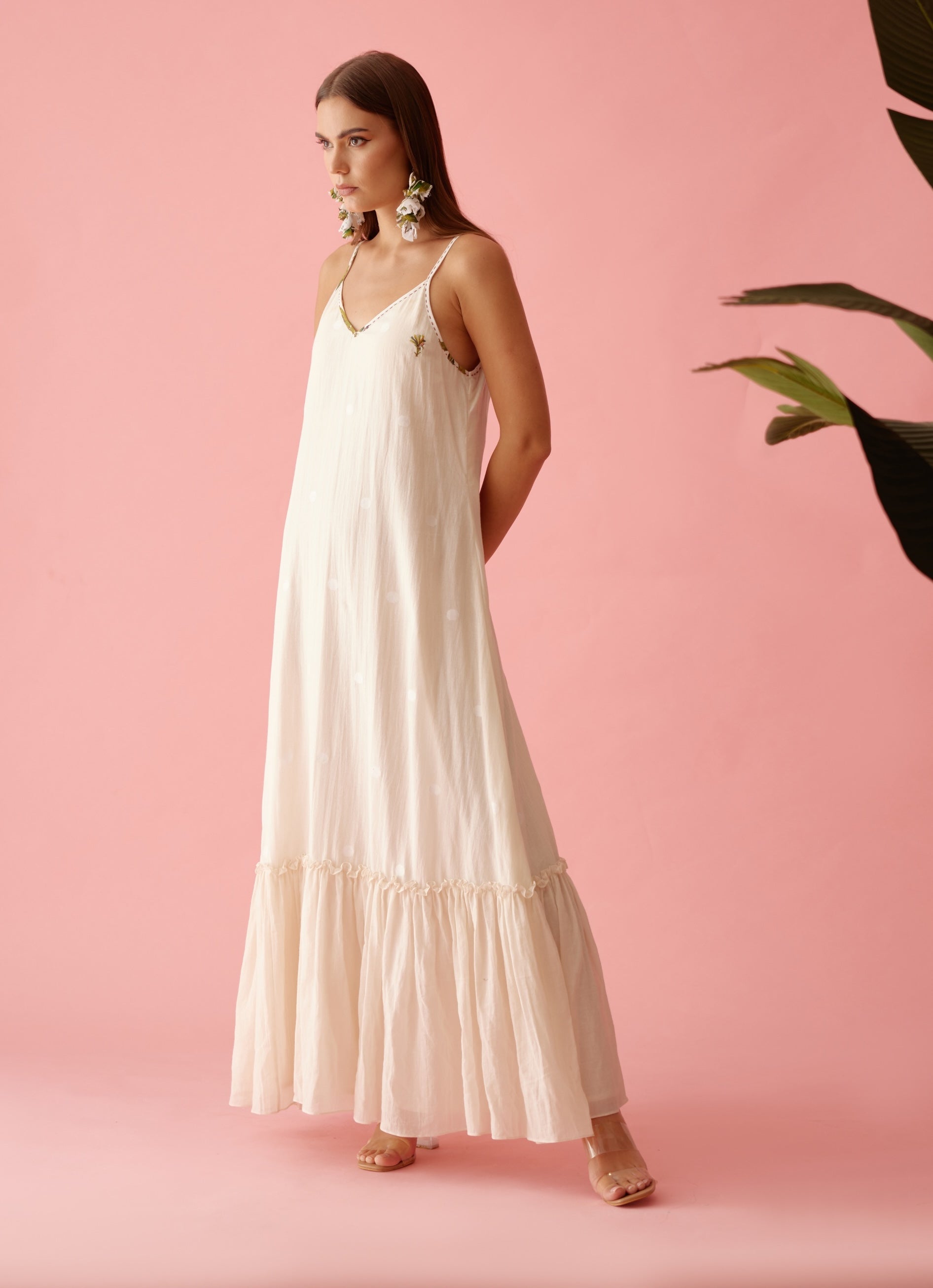Elevate your wardrobe with our cream handwoven Jamdani cotton slip dress, a blend of tradition and modern elegance. Crafted from luxurious handwoven Jamdani cotton, this dress features delicate frill detailing at the bottom, adding a touch of sophistication and movement. The slip dress silhouette offers a flattering and comfortable fit, perfect for a range of occasions from casual outings to special events. Embrace the exquisite craftsmanship and timeless style of this beautifully detailed dress.