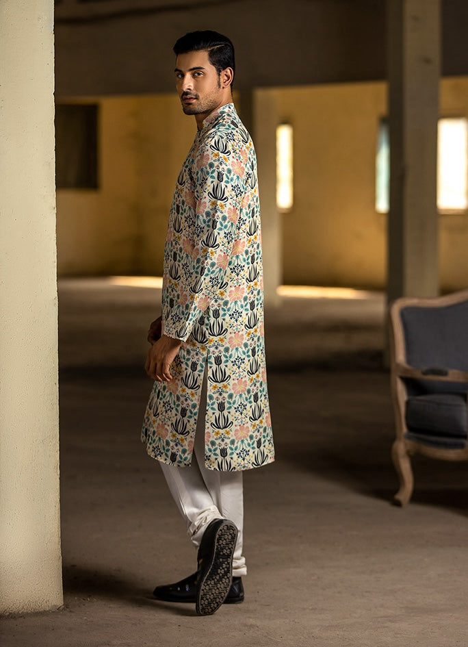 Step into style with this beautiful tulip garden print silk kurta, perfect for the modern man who values both comfort and elegance. Made from luxurious silk, this kurta showcases vibrant floral motifs that bring a refreshing touch of nature to your wardrobe. The soft fabric drapes effortlessly, providing a comfortable fit for any occasion.