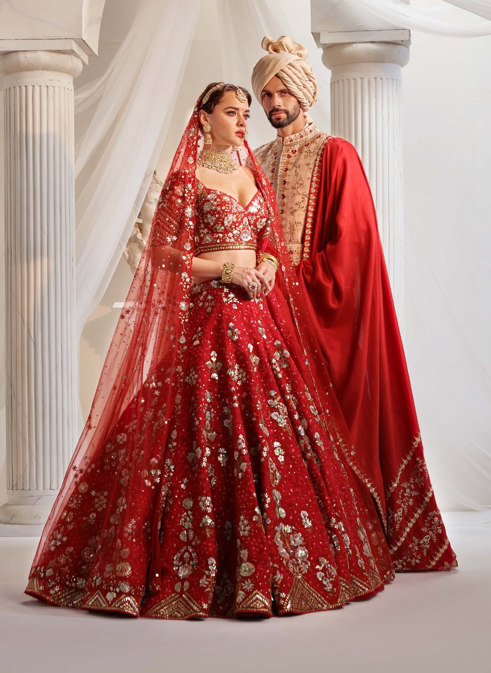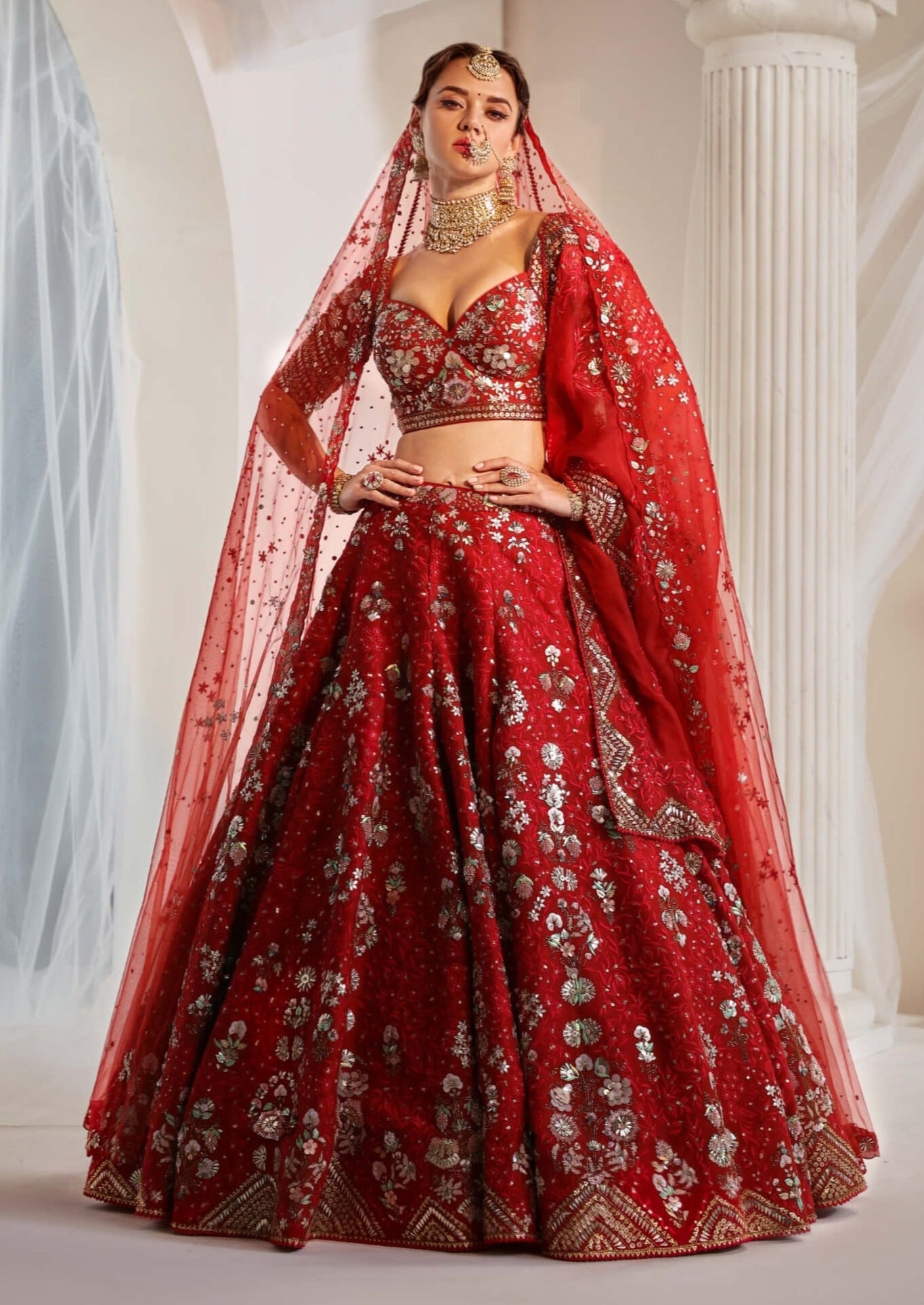 Illuminate your bridal look with this crimson red lehenga choli set, crafted from luxurious dupion silk. Featuring stunning 3D embroidery in resham, along with artful sequin and glass bead embellishments, this ensemble is completed with two elegantly draped dupattas. The vibrant crimson hue and intricate detailing create a breathtakingly regal appearance for your special day.