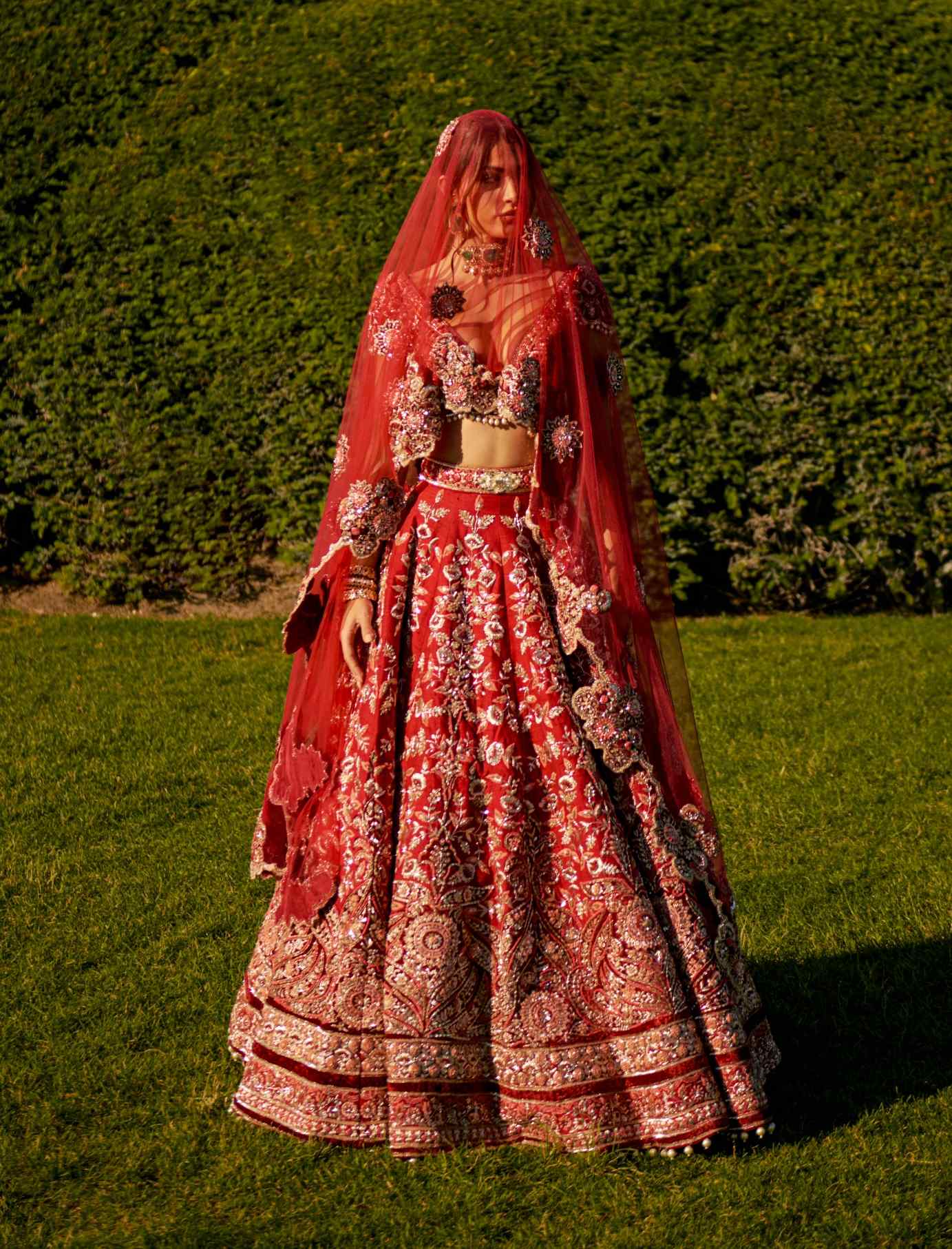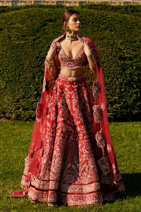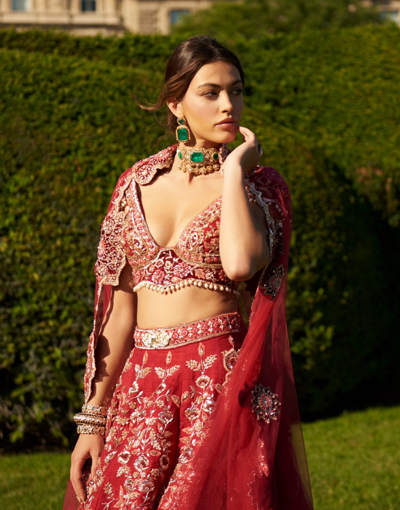 Immerse yourself in opulence with our crimson red lehenga set adorned with delicate handcrafted motifs that add a touch of refined elegance. Crafted from sumptuous raw silk and velvet the lehenga exudes grandeur while the matching velvet and raw silk blouse enhances the ensemble's sophistication. Paired with a graceful net dupatta this lehenga set epitomizes timeless elegance and is perfect for making a statement at weddings and special occasions.