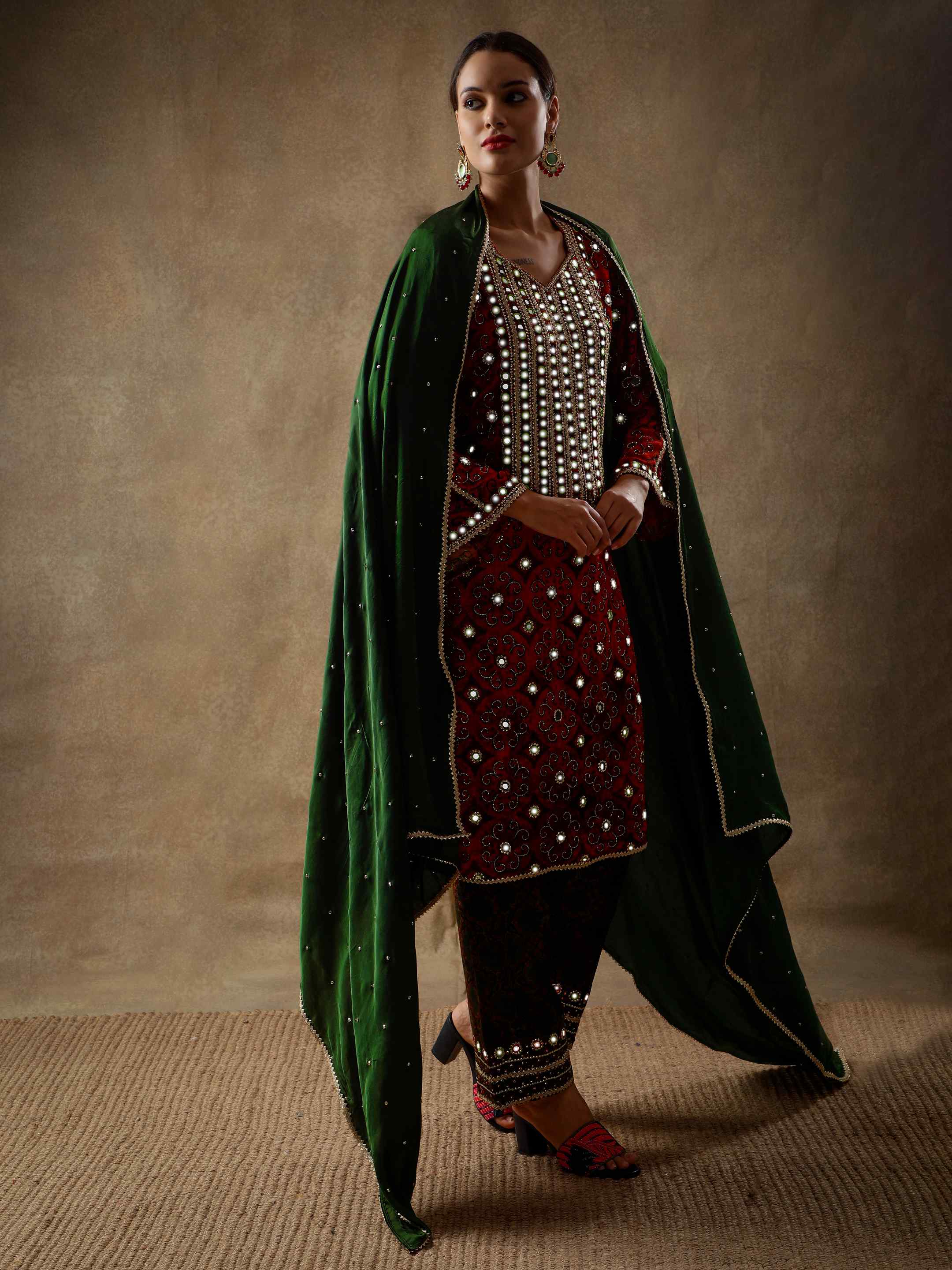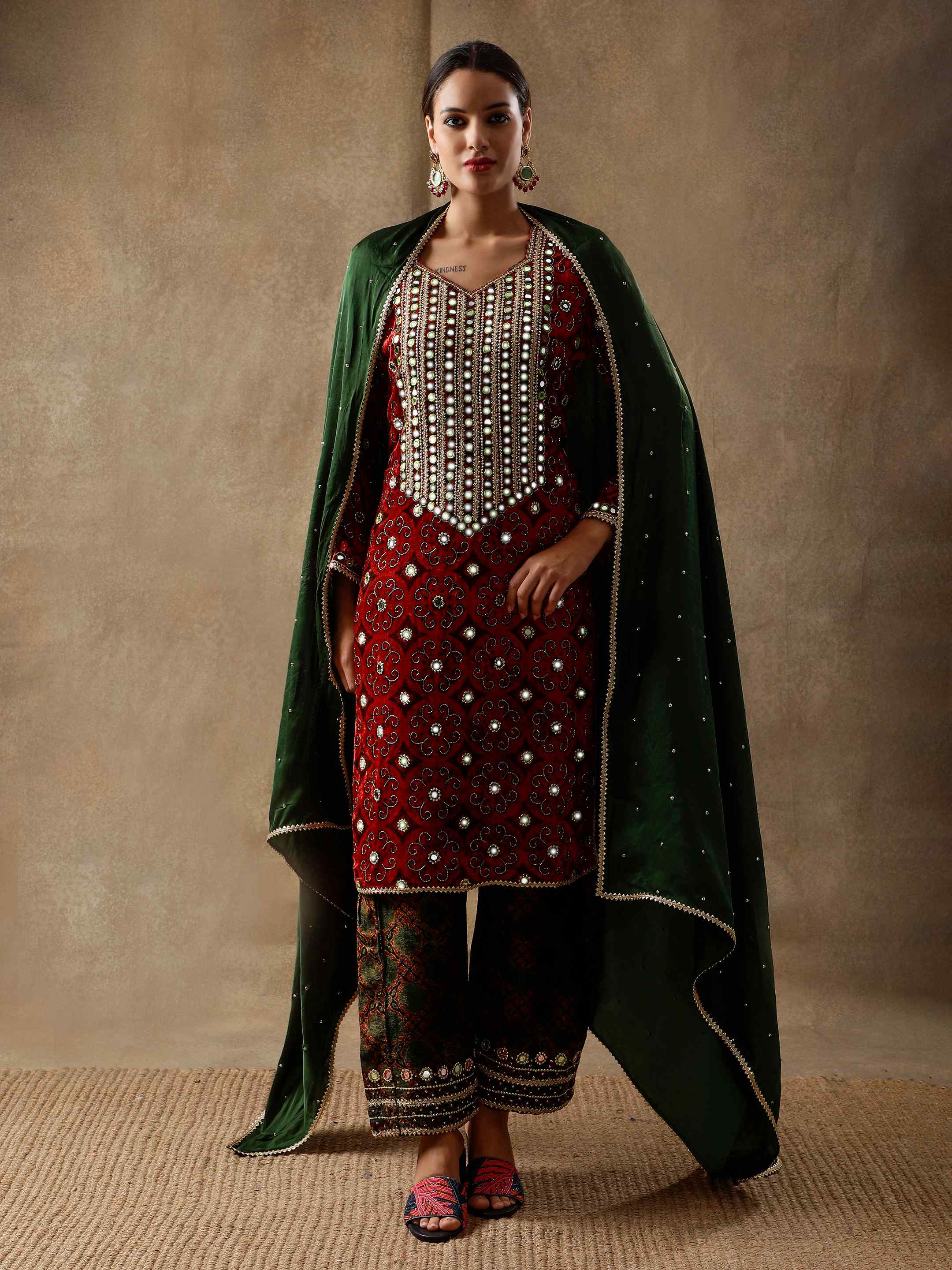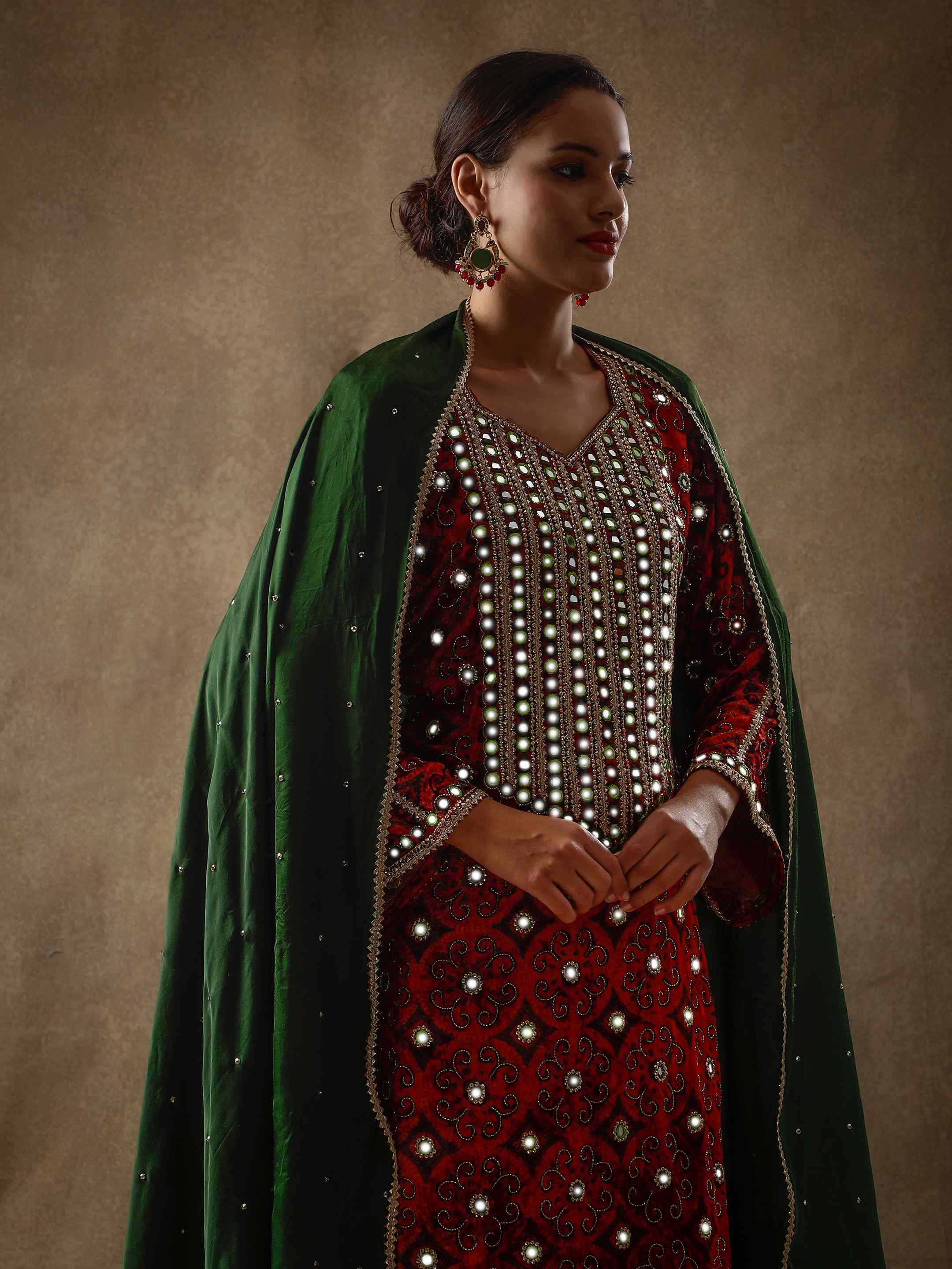 Exude royal magnificence with our Jewel-Toned Crimson Red Velvet Suit. This opulent kurta features a sweetheart neckline and a heavily embroidered yoke, crafted with our signature sheeshakari, resham, aari, kasab, and beadwork. The luxurious velvet fabric and ornate bell sleeves further enhance its grandeur. Paired with Hand-Embroidered Green Velvet Pants that beautifully complement the kurta, the ensemble is completed with a Green Silk Dupatta adorned with gotapatti and intricate hand embroidery. This combination offers a truly regal and sophisticated look.