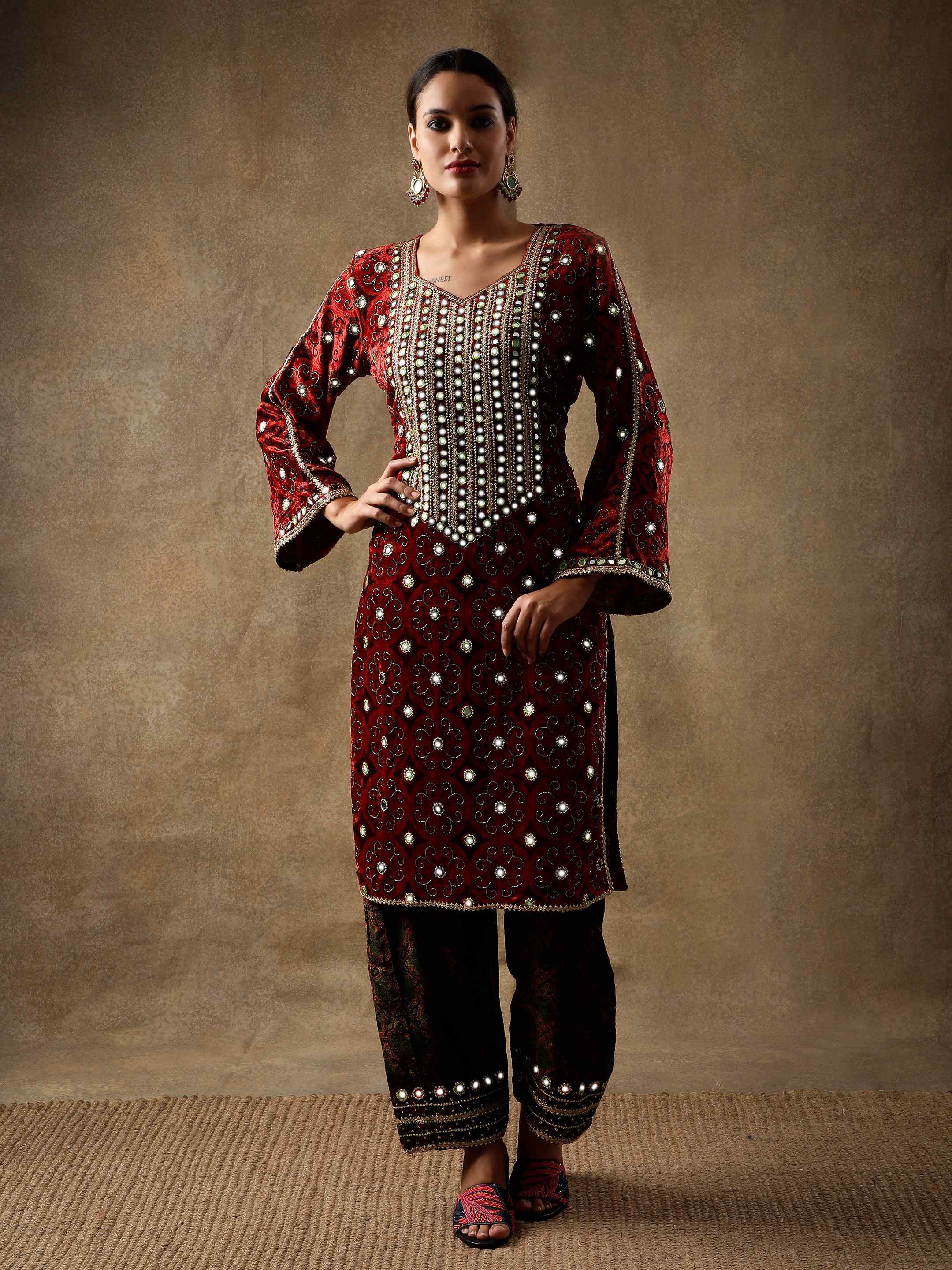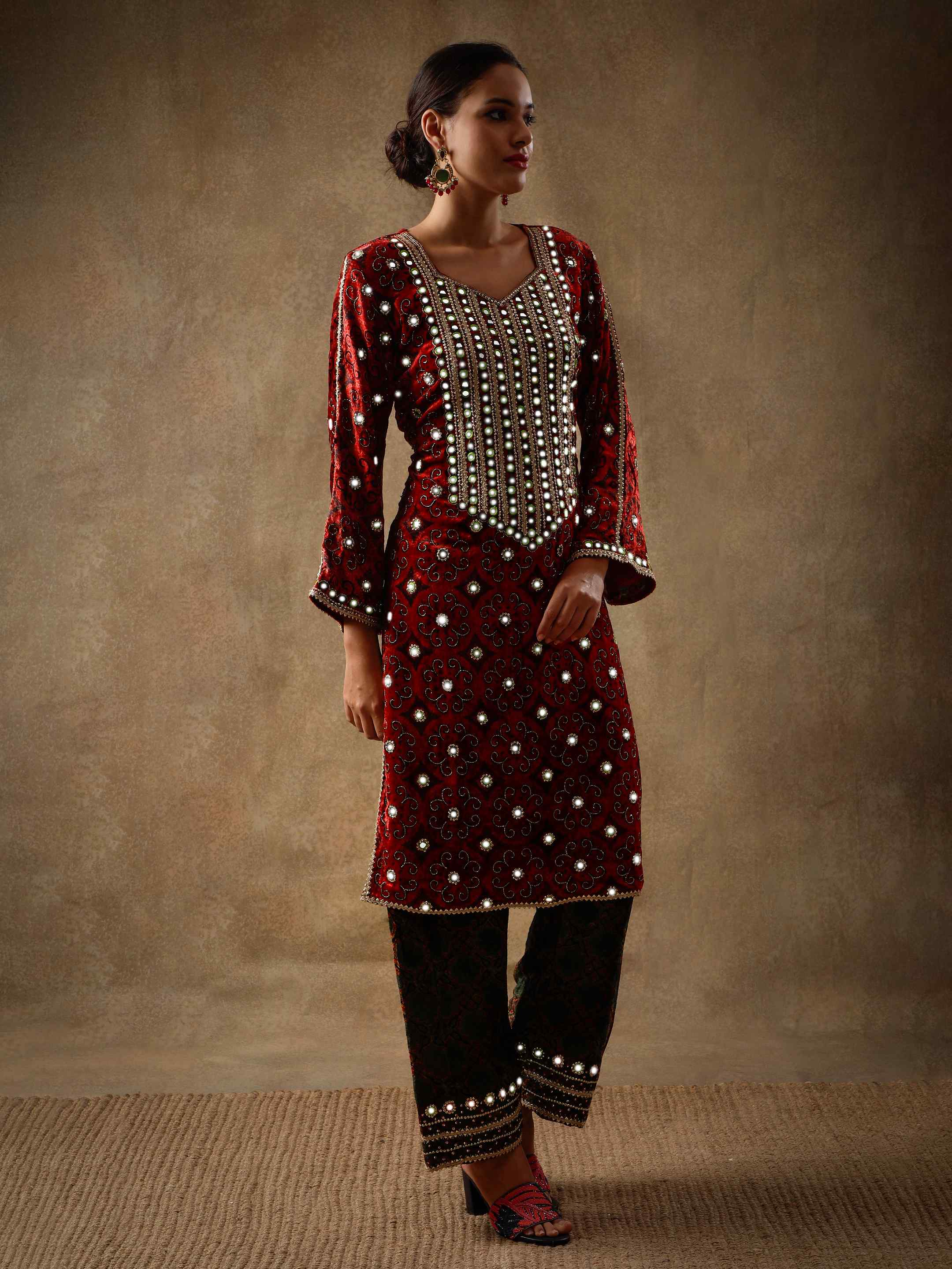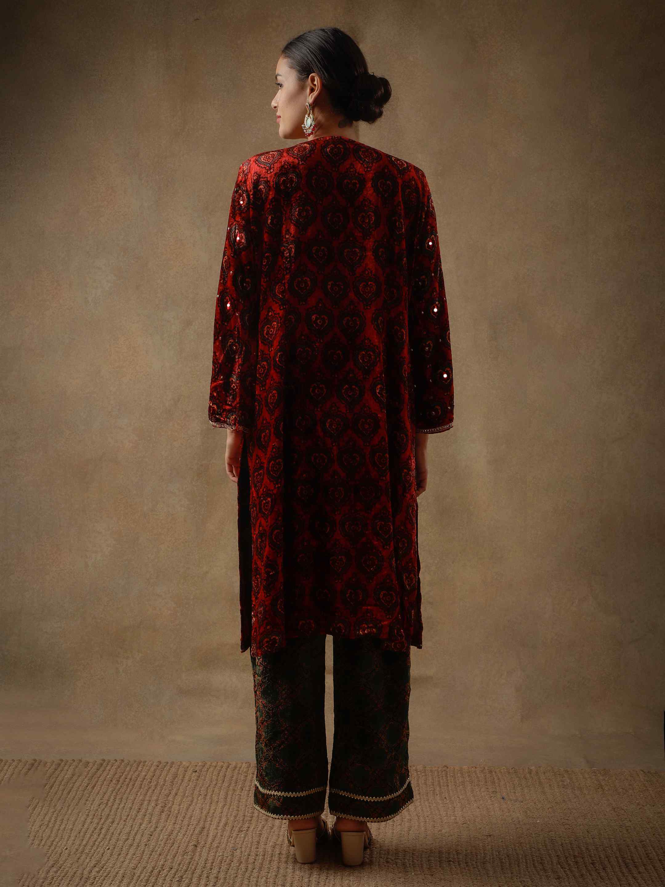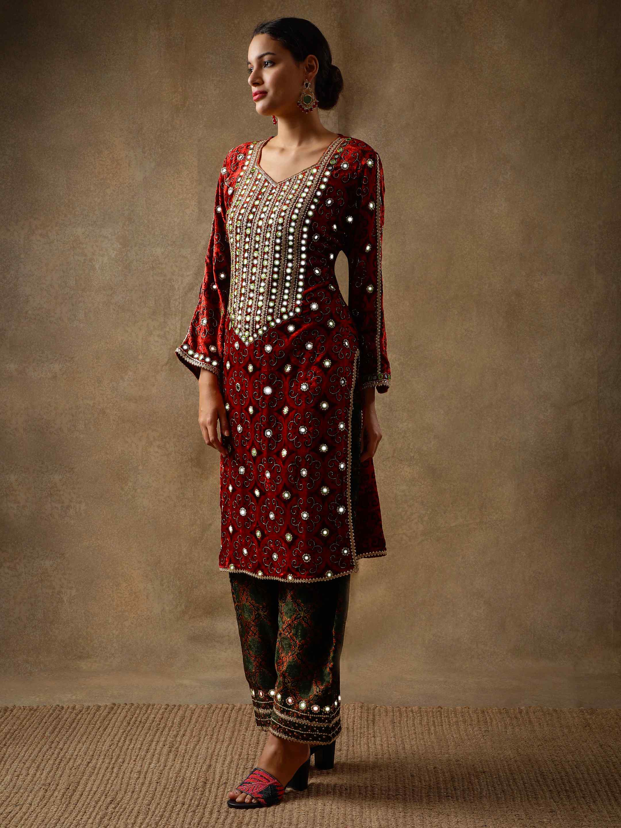 Exude royal magnificence with our Jewel-Toned Crimson Red Velvet Suit. This opulent kurta features a sweetheart neckline and a heavily embroidered yoke, crafted with our signature sheeshakari, resham, aari, kasab, and beadwork. The luxurious velvet fabric and ornate bell sleeves further enhance its grandeur. Paired with Hand-Embroidered Green Velvet Pants that beautifully complement the kurta, the ensemble is completed with a Green Silk Dupatta adorned with gotapatti and intricate hand embroidery. This combination offers a truly regal and sophisticated look.