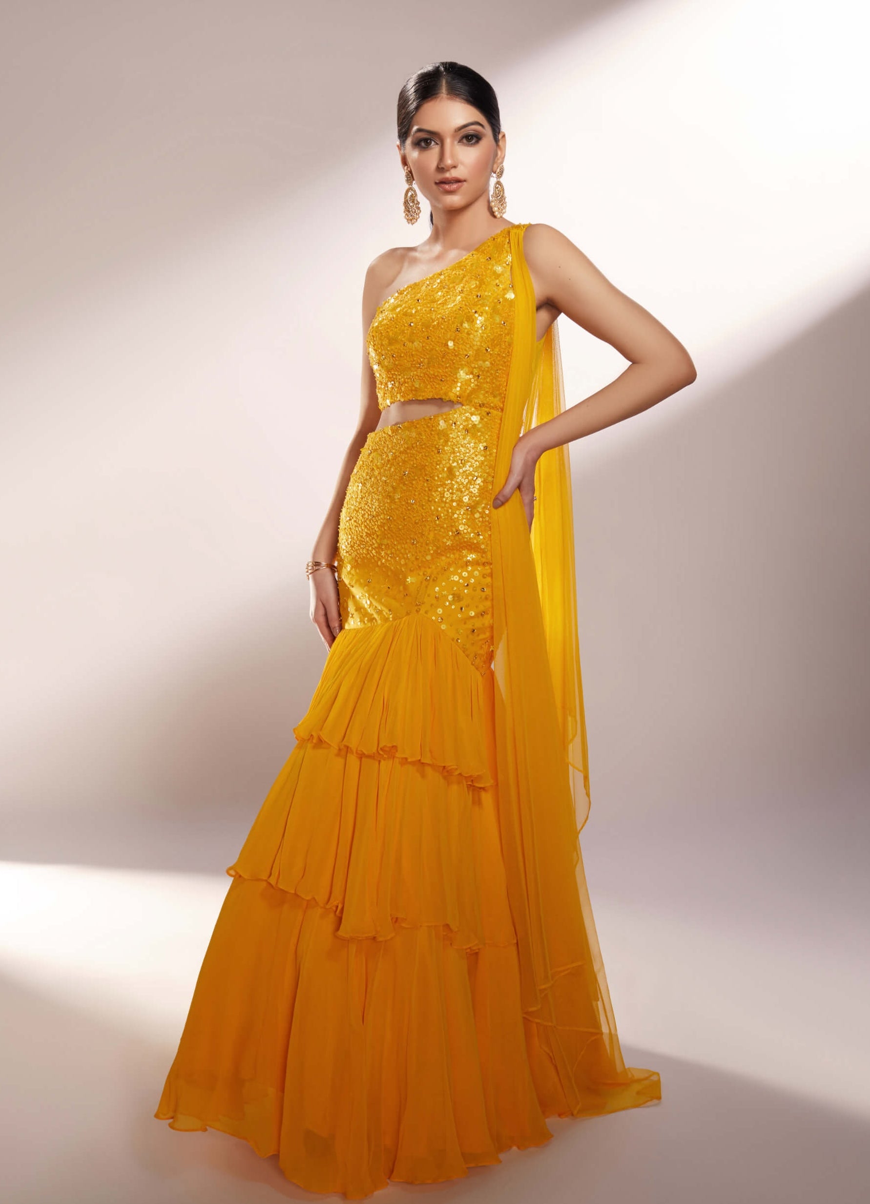 Discover the captivating allure of our one-shoulder gown in vibrant chrome yellow designed to make a bold fashion statement. This stunning piece features an exquisite tone-on-tone gradient embroidery meticulously crafted with sequins and crystal stones to catch the light with every movement. The innovative one-side waist cut adds a contemporary edge while the layered georgette hem flows gracefully creating a dramatic yet elegant silhouette. Perfect for those who seek to stand out this gown embodies a seamless fusion of modern sophistication and classic glamour.