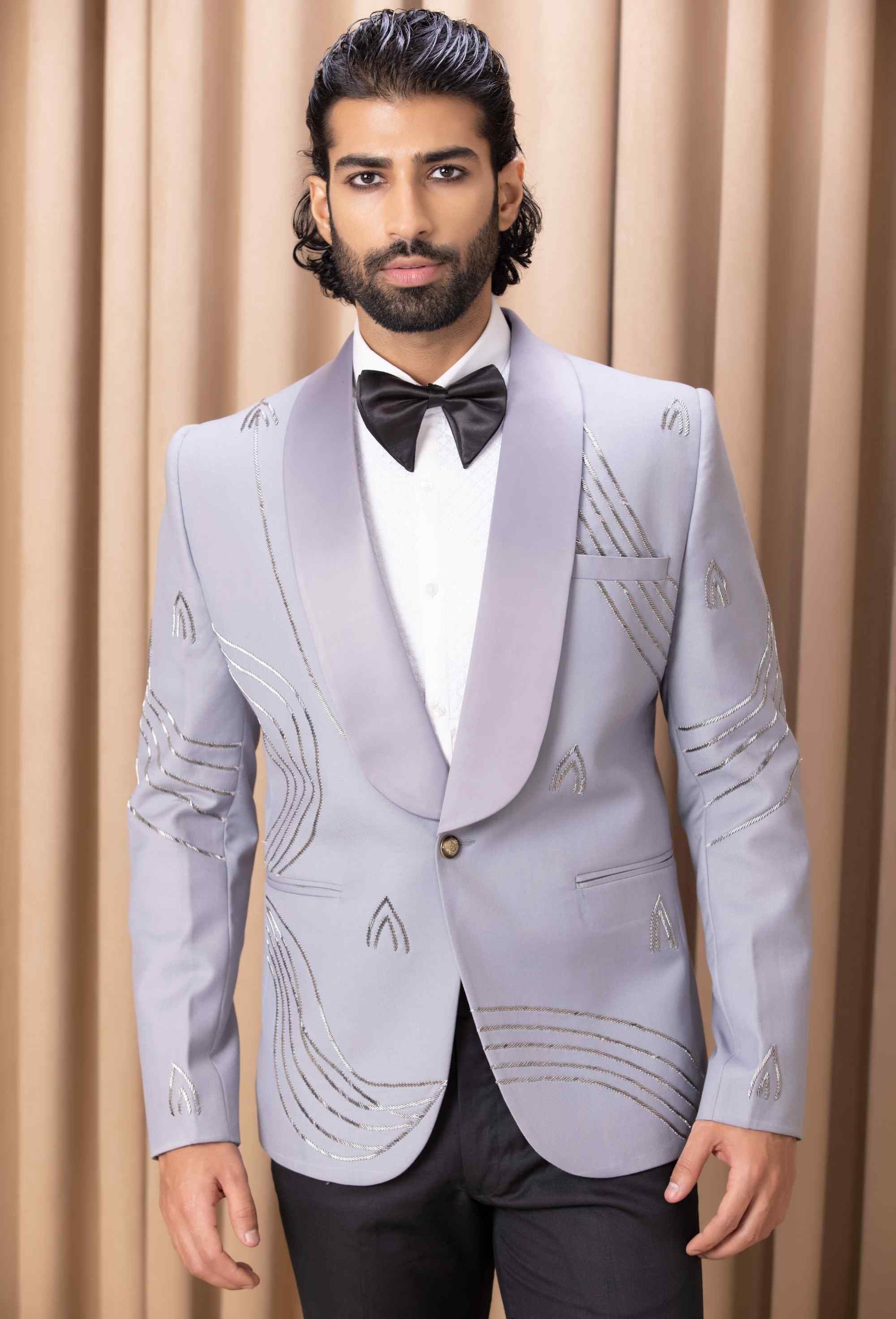 Unveil a new level of sophistication with our bespoke hand-embroidered silver gray tuxedo set. Featuring an elegant shawl collar and intricate detailing, this ensemble is crafted for distinguished events. The set includes a sleek silver gray jacket paired with classic black trousers. Perfect for making a polished impression at any upscale occasion, this tuxedo blends modern refinement with timeless craftsmanship, ensuring you exude exceptional style and grace.