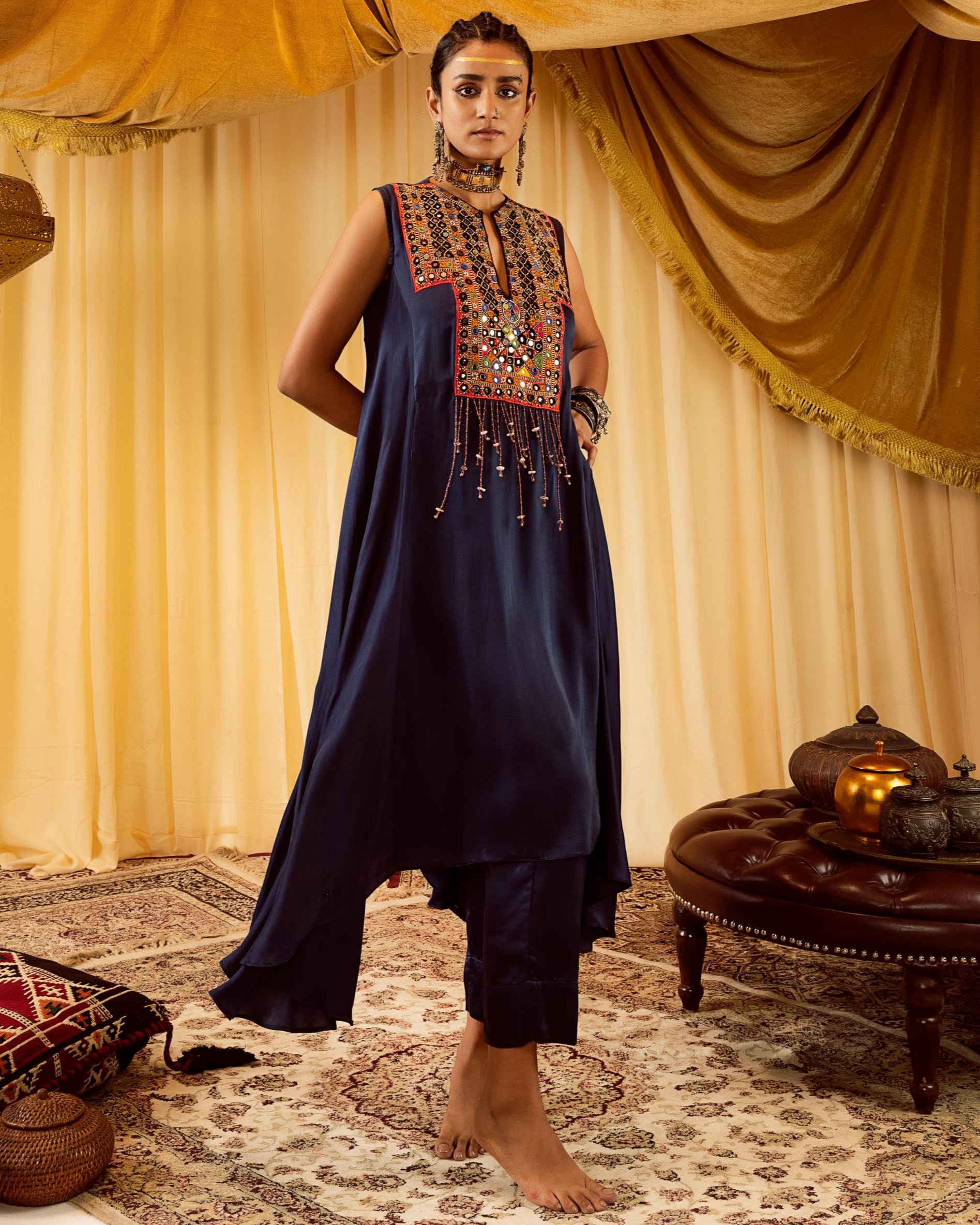 This striking asymmetrical blue kurta features a beautifully hand-embroidered neckline with intricate mirror work and a unique tassel detail for added charm. Paired with matching pants, this ensemble blends traditional craftsmanship with modern elegance, making it a perfect choice for festive gatherings and special occasions.