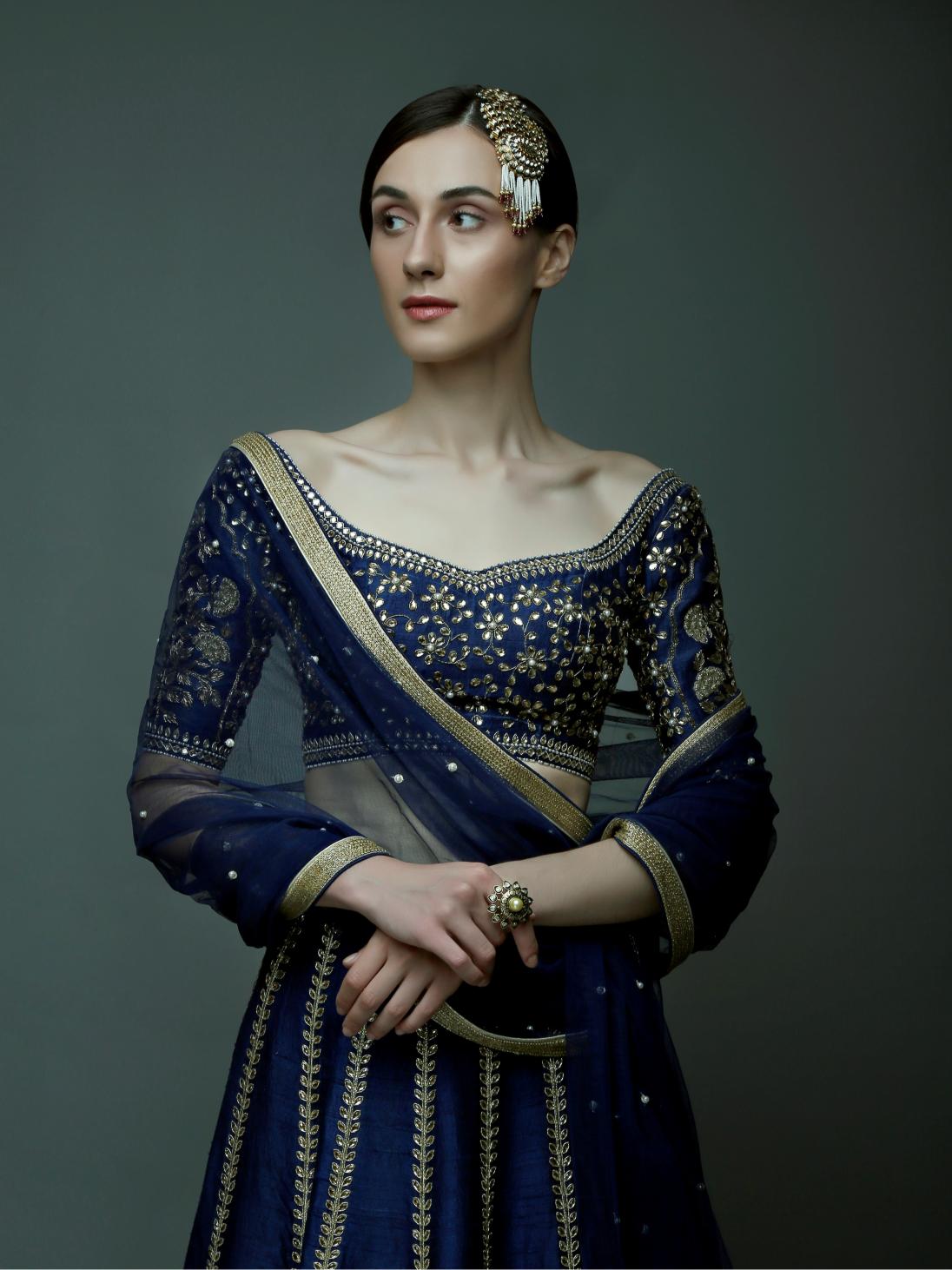 Exude regal charm with this dark blue Kundan and Dabka embellished lehenga set, a masterpiece of intricate craftsmanship and timeless elegance. The deep, rich hue enhances the opulence of hand-embroidered Dabka work, while the Kundan embellishments add a touch of royal splendor. Designed for weddings, receptions, and festive soirŽes, this ensemble drapes beautifully, creating a stunning silhouette that blends heritage artistry with contemporary sophistication.