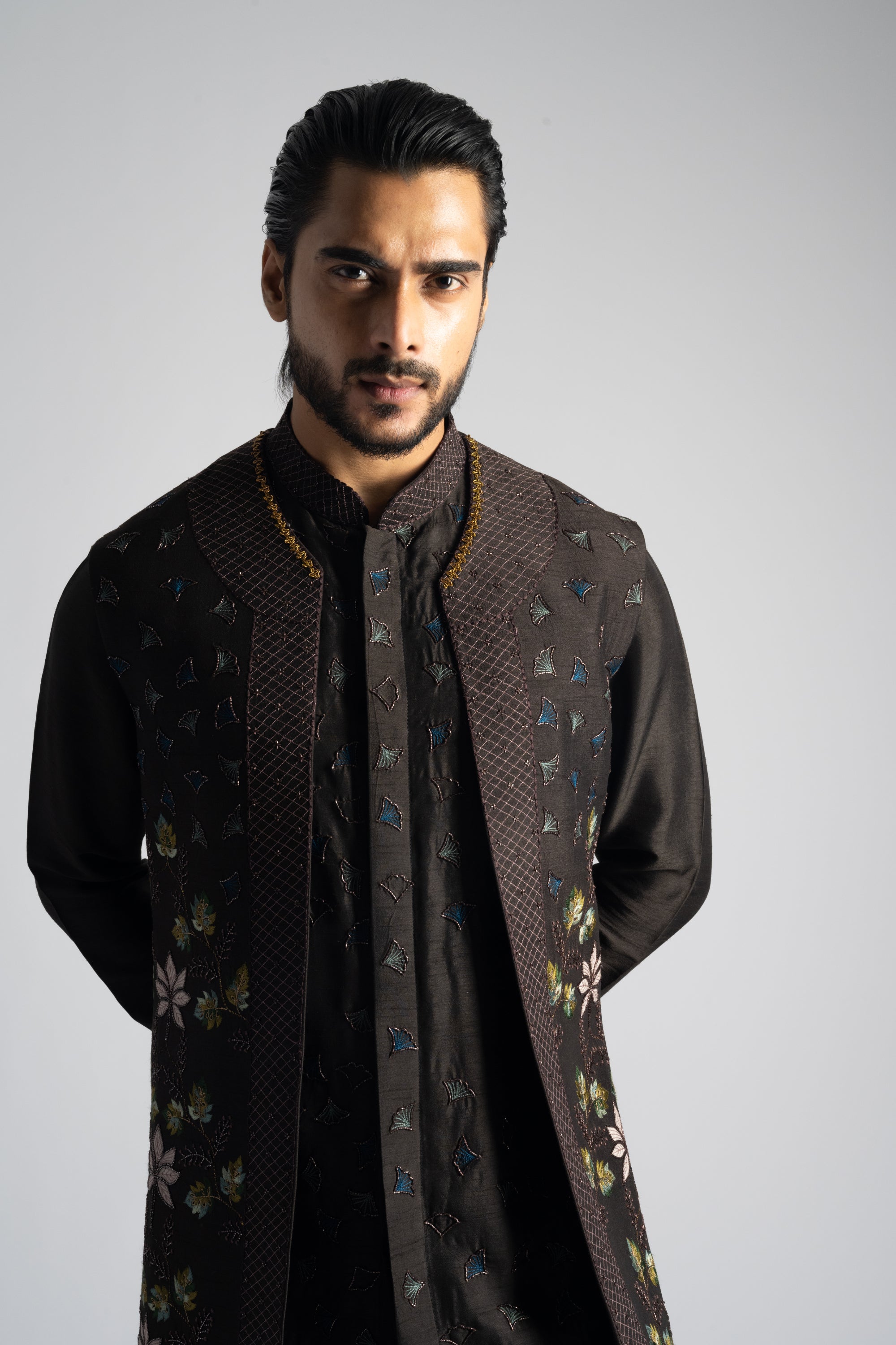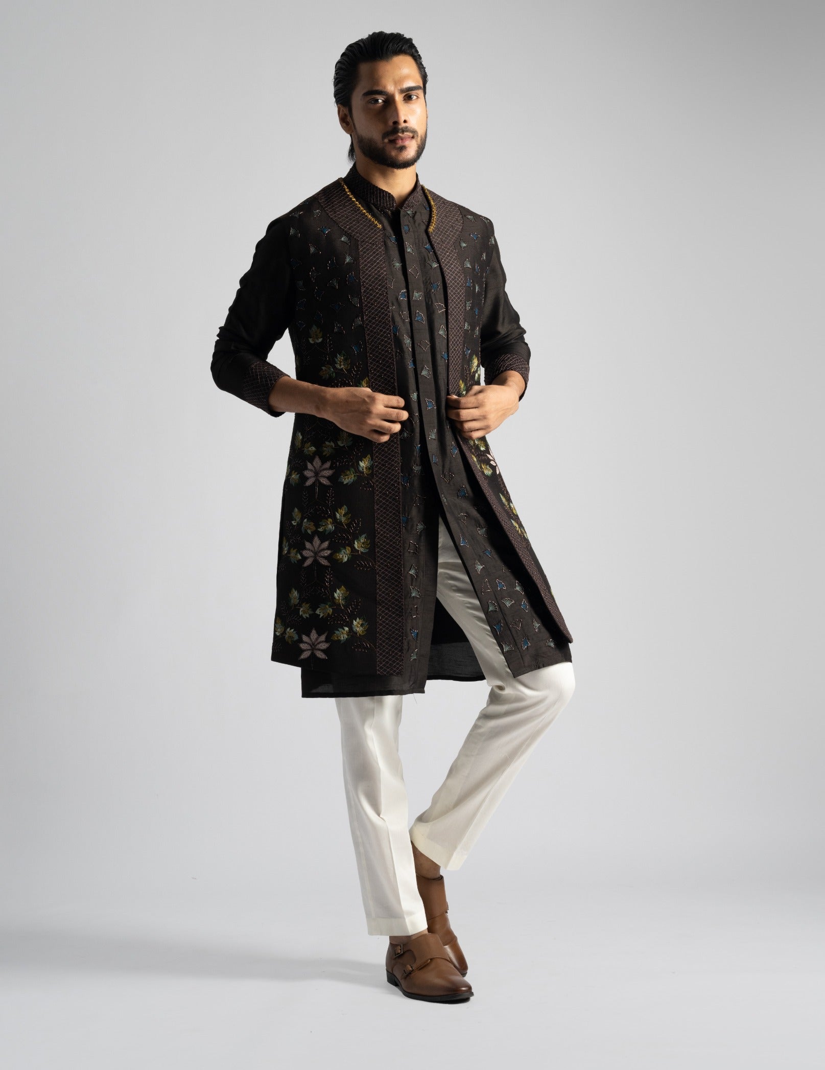 Elevate your formal attire with our dark brown open long Nehru jacket, featuring subtle yet stunning tone-on-tone blingy embroidery that adds a touch of sophisticated sparkle. This elegant jacket is paired with a coordinating kurta, highlighted with intricate threadwork and cutdana embroidery for a rich, textured finish. Together, this ensemble combines classic design with modern detailing, making it perfect for upscale events and special occasions.