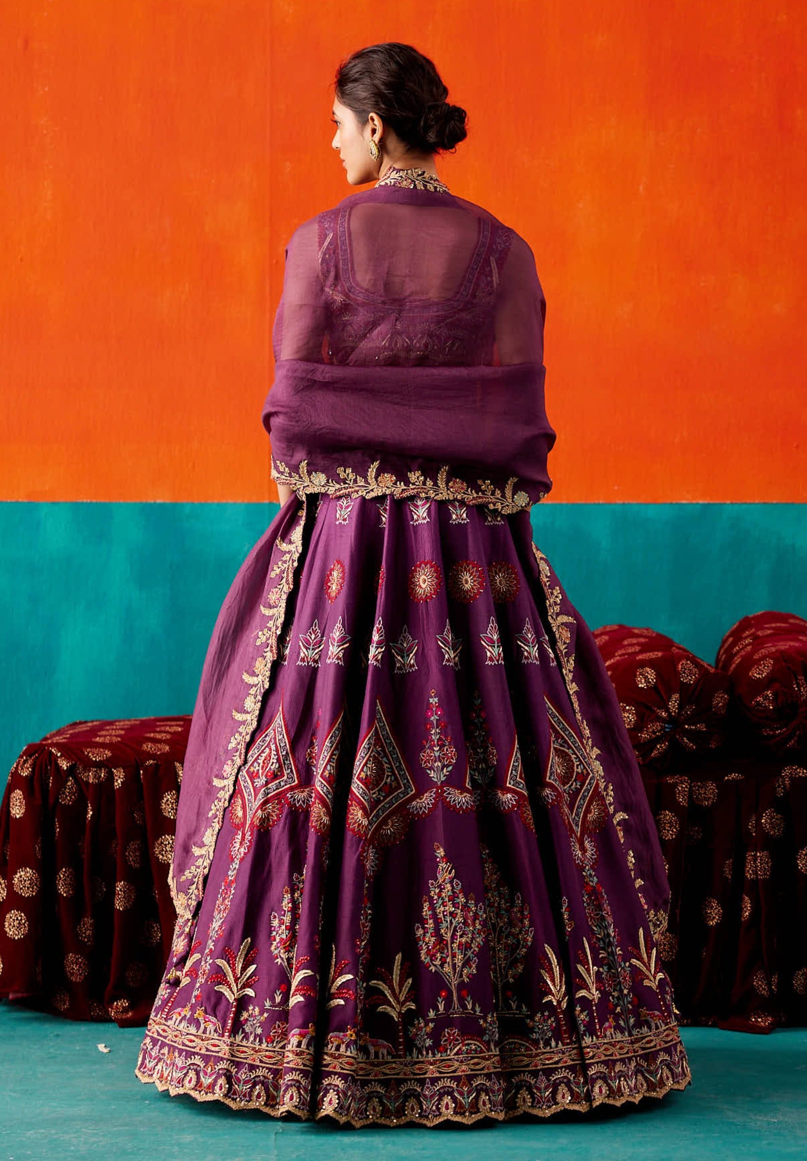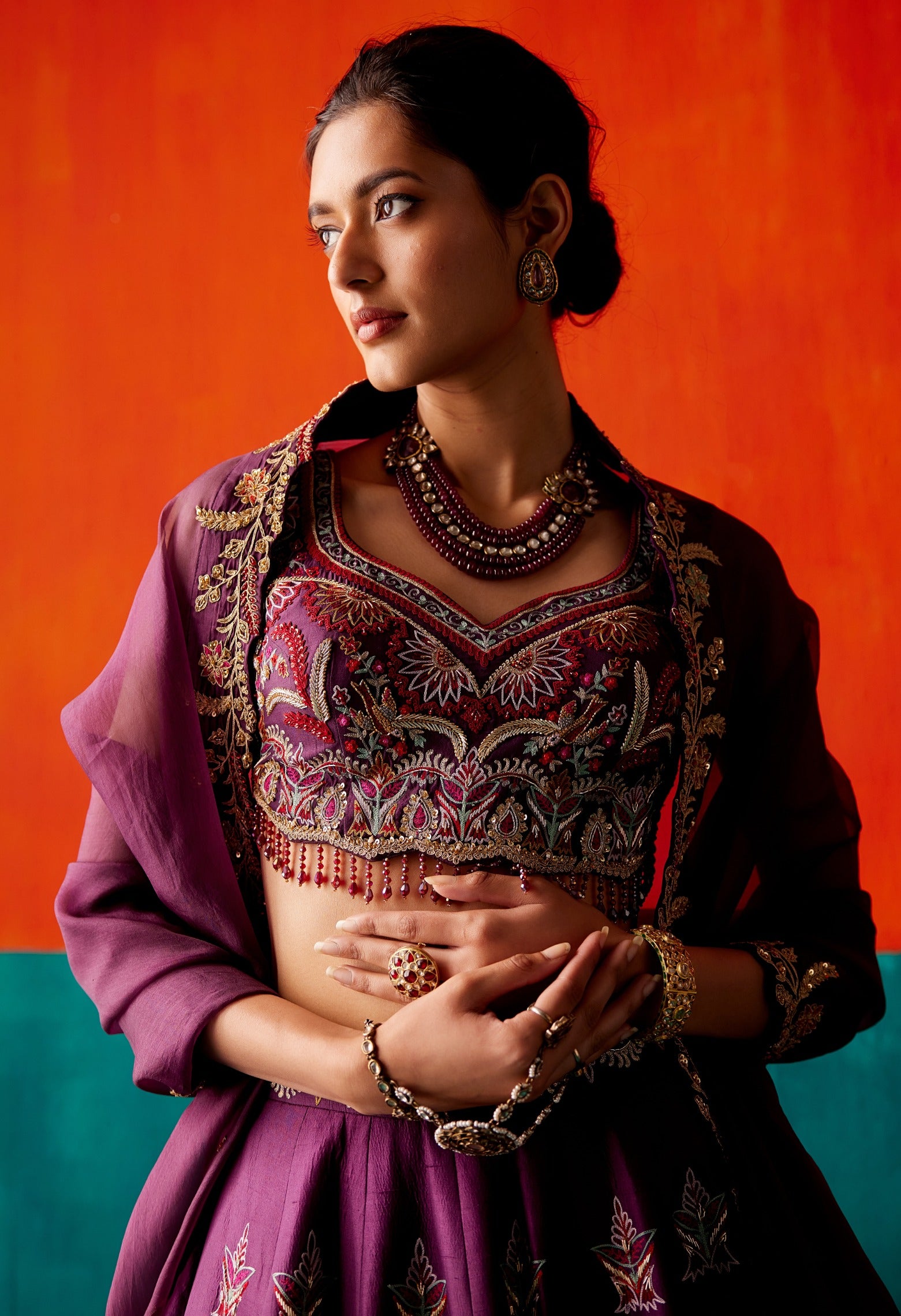Embrace opulence with our luxurious dark purple lehenga set, featuring exquisite floral embroidery and highlighted with a range of elegant embellishments. This stunning ensemble is perfectly complemented by an embroidered organza dupatta, adding a layer of sophistication and grace. Ideal for weddings, formal events, and festive occasions, this lehenga set combines rich color with intricate detailing to create a truly captivating and memorable appearance.