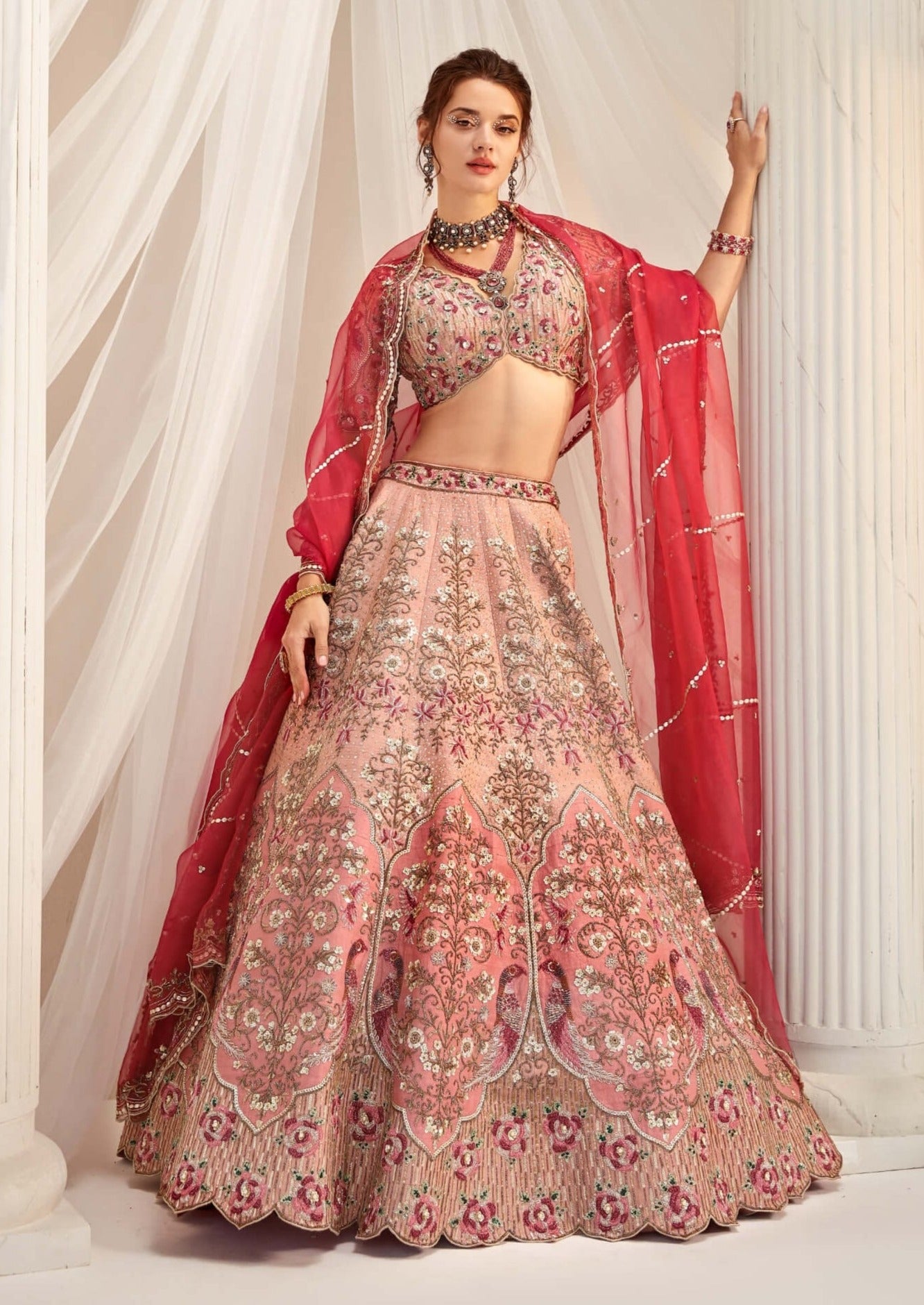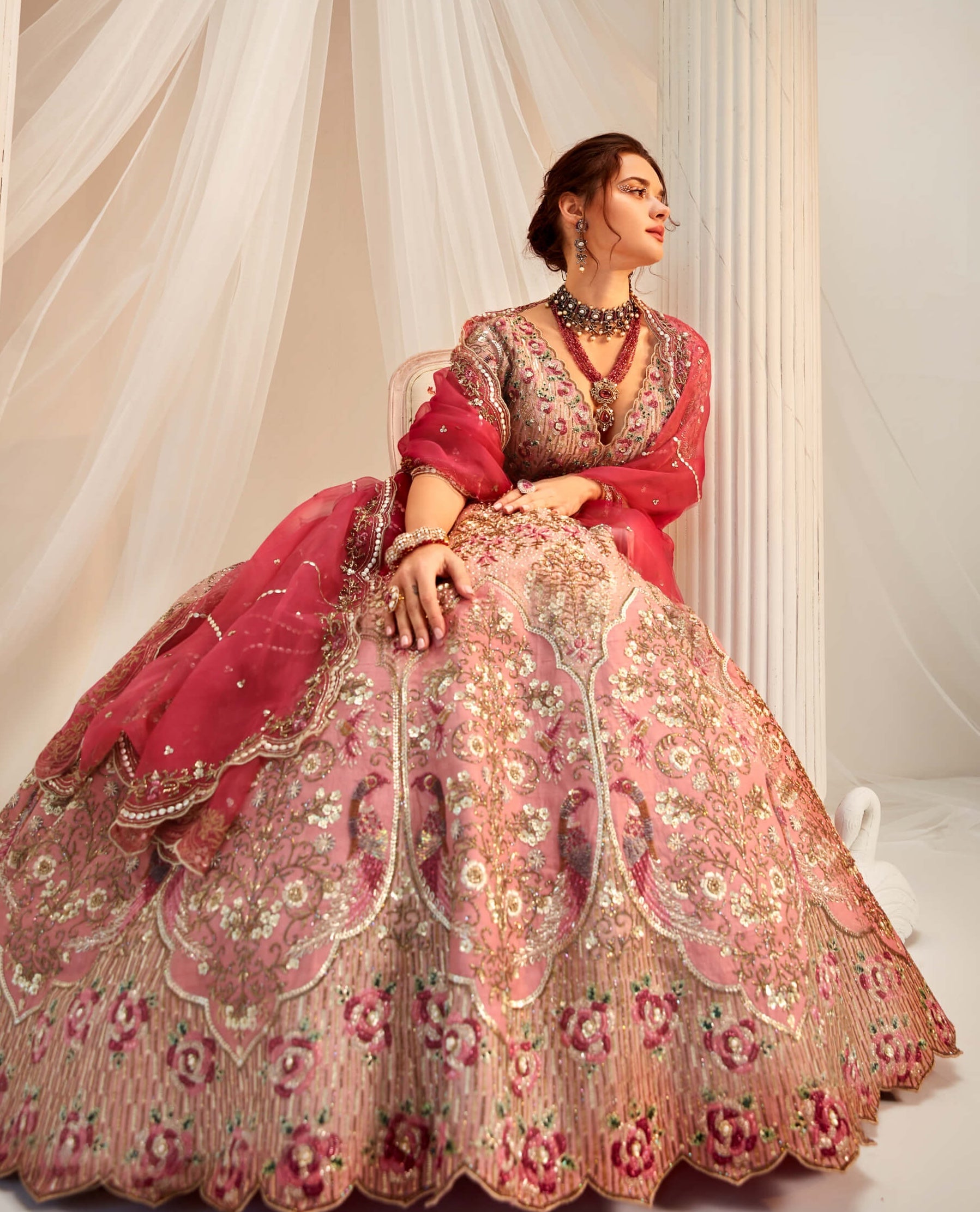 Step into sophistication with this dark rosegold bridal lehenga choli set, meticulously crafted from luxurious raw silk. The ensemble is embellished with intricate glass beads, artful sequin accents, and exquisite nakshi and dabka work, creating a dazzling effect. Complete with two elegantly draped dupattas, this set offers a perfect blend of opulence and timeless beauty for your special day.