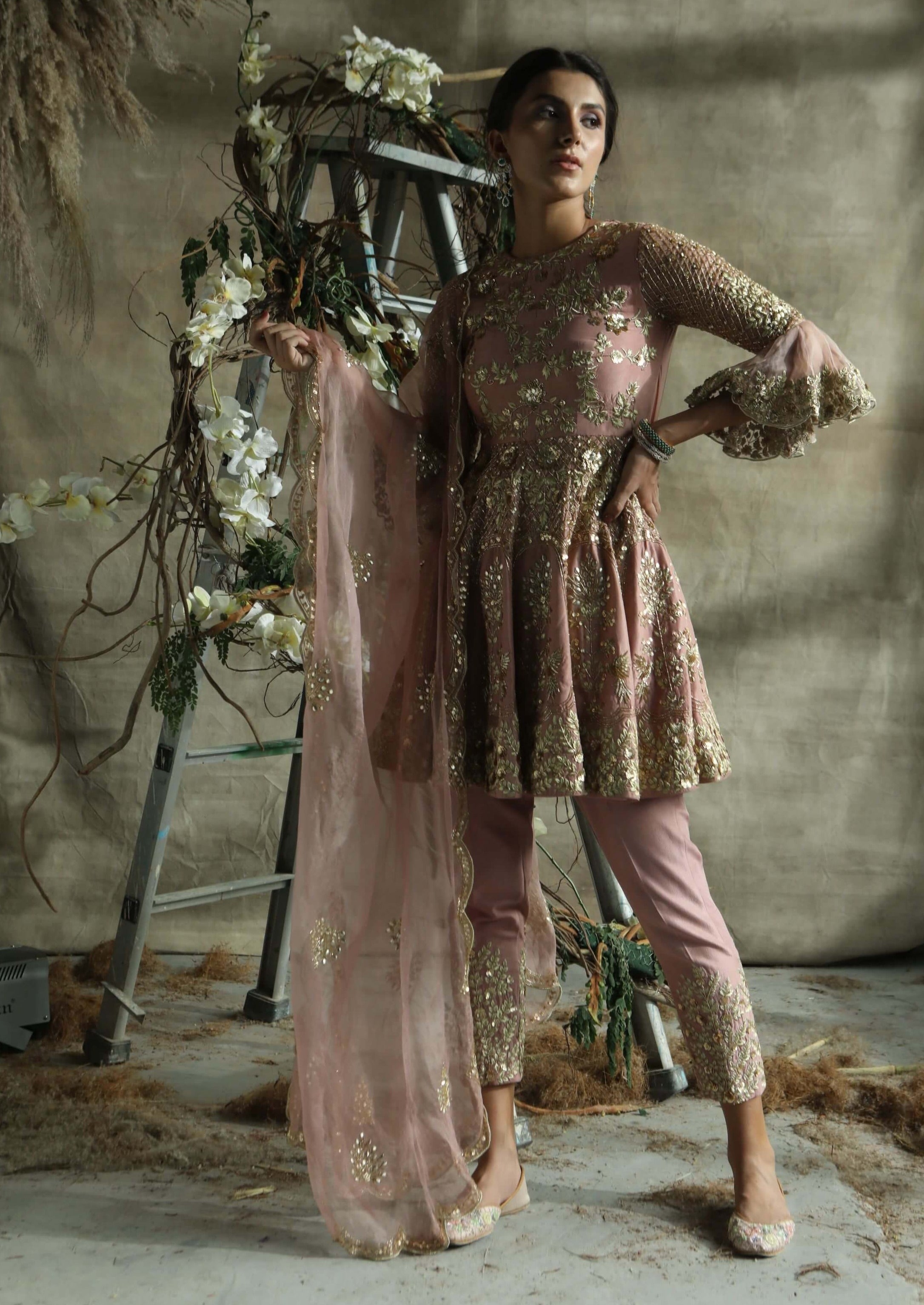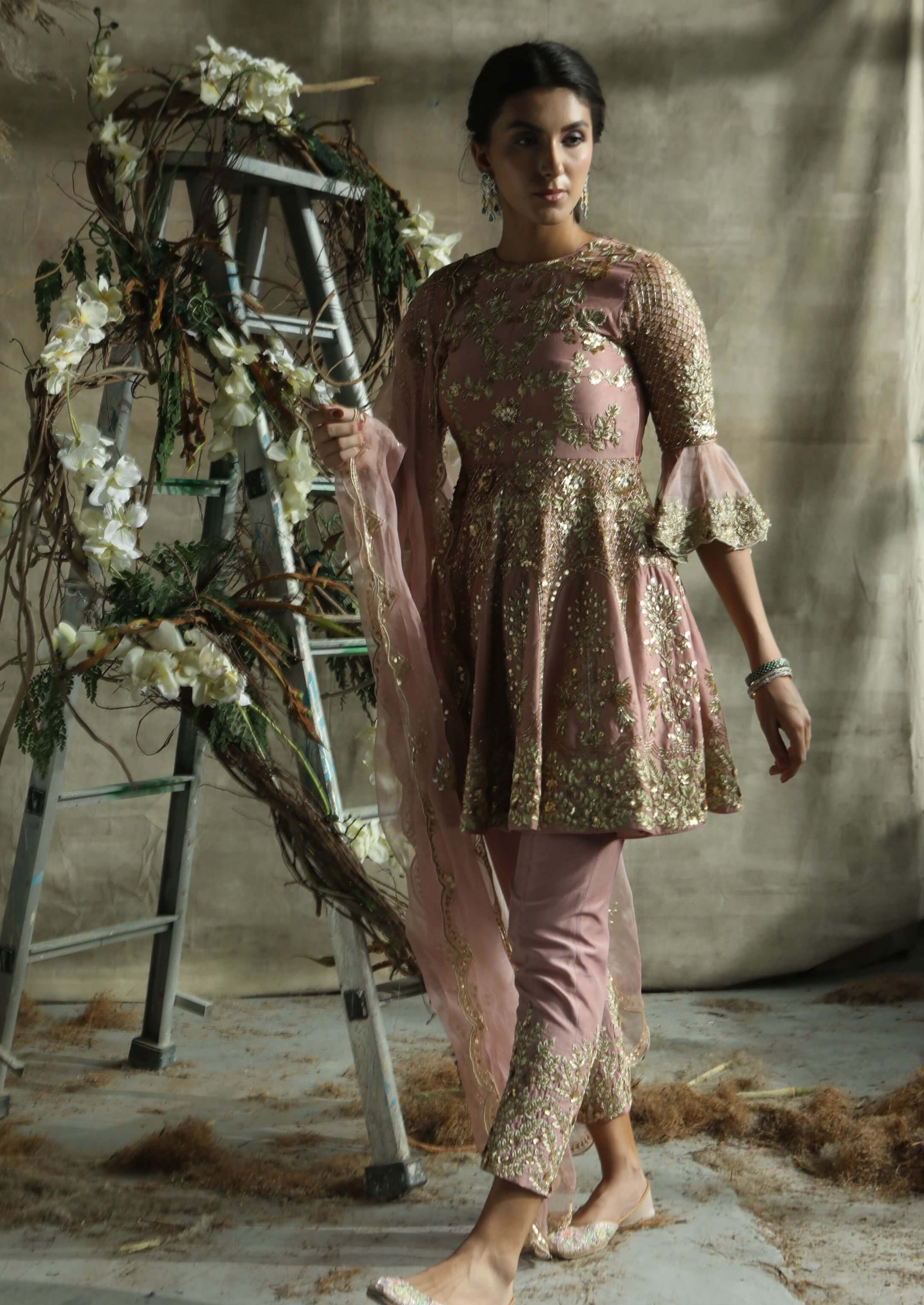 Exude elegance with our dark rose gold short anarkali suit, a sophisticated ensemble crafted from luxurious silk. This stunning outfit features a dark rose gold short anarkali with intricate embroidery that adds a rich texture and subtle shimmer. It is paired with sleek pants that complement the anarkali’s graceful silhouette and a coordinating organza dupatta that drapes beautifully. Perfect for weddings and special events, this set combines opulent color with exquisite craftsmanship, ensuring a memorable and refined look.