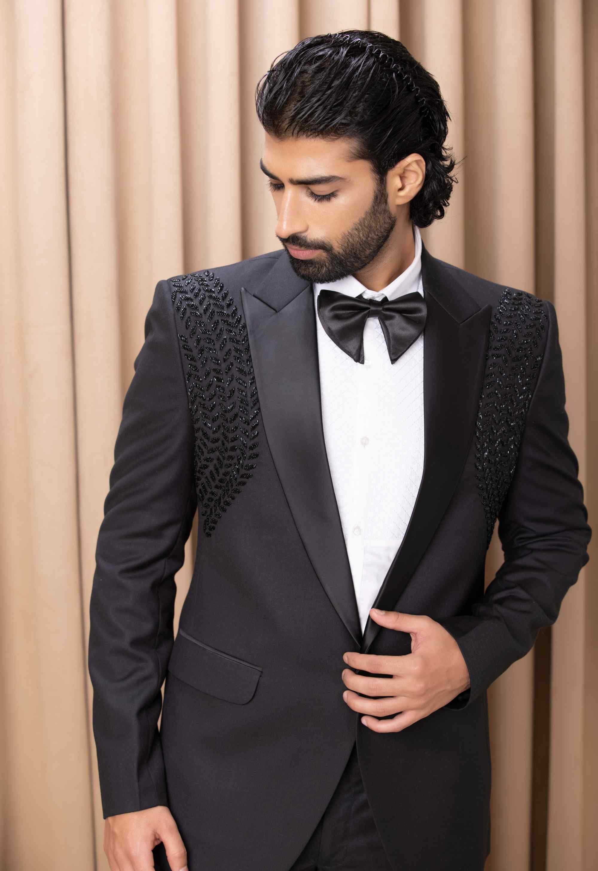 Elevate your formal attire with our bespoke hand-embroidered black tuxedo set, meticulously designed with peak lapels and intricate detailing. Ideal for sophisticated events, this ensemble includes a sleek black jacket and matching black trousers, offering a classic and refined look. Perfect for making a distinguished impression at any classy occasion, this tuxedo set combines timeless elegance with contemporary craftsmanship.