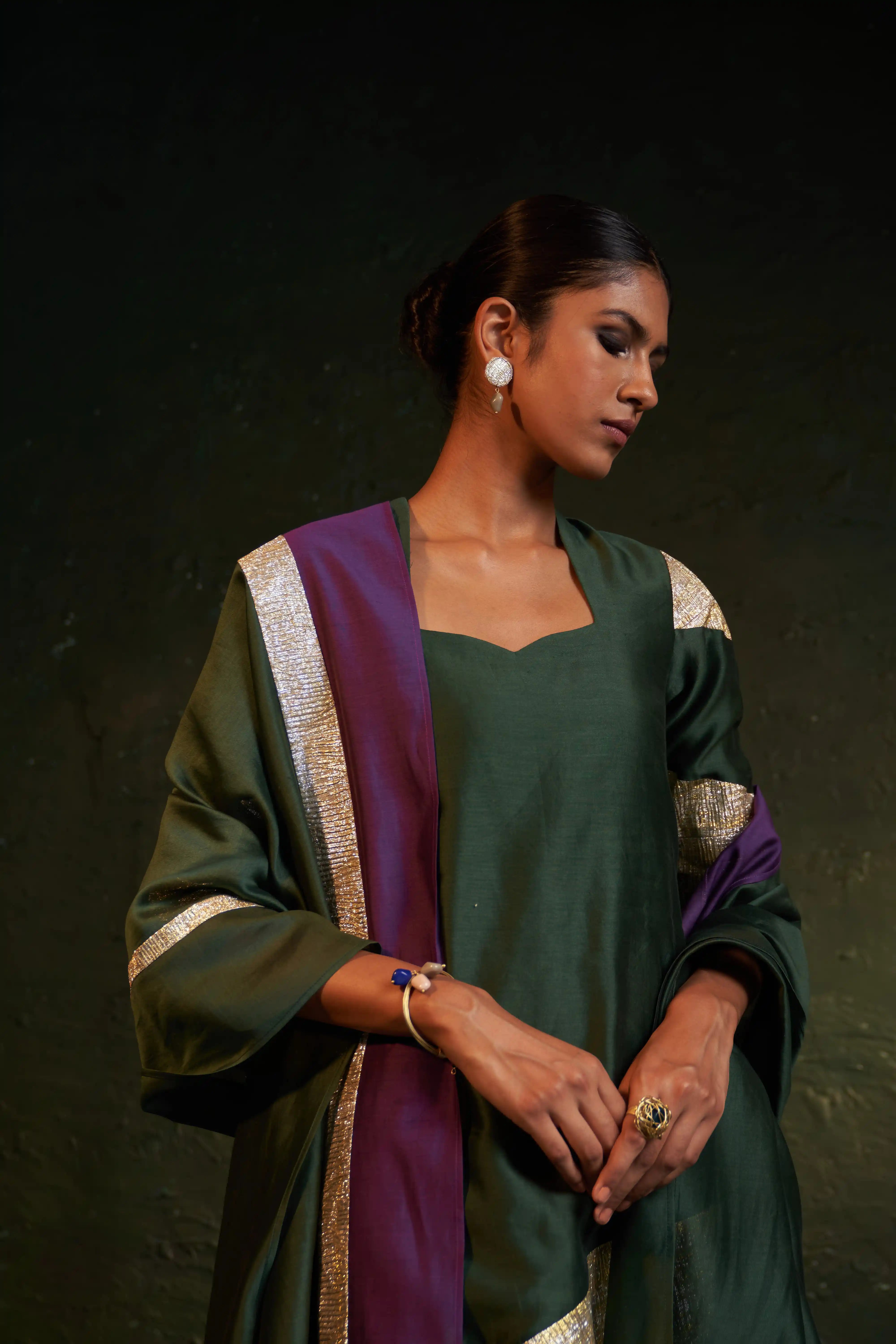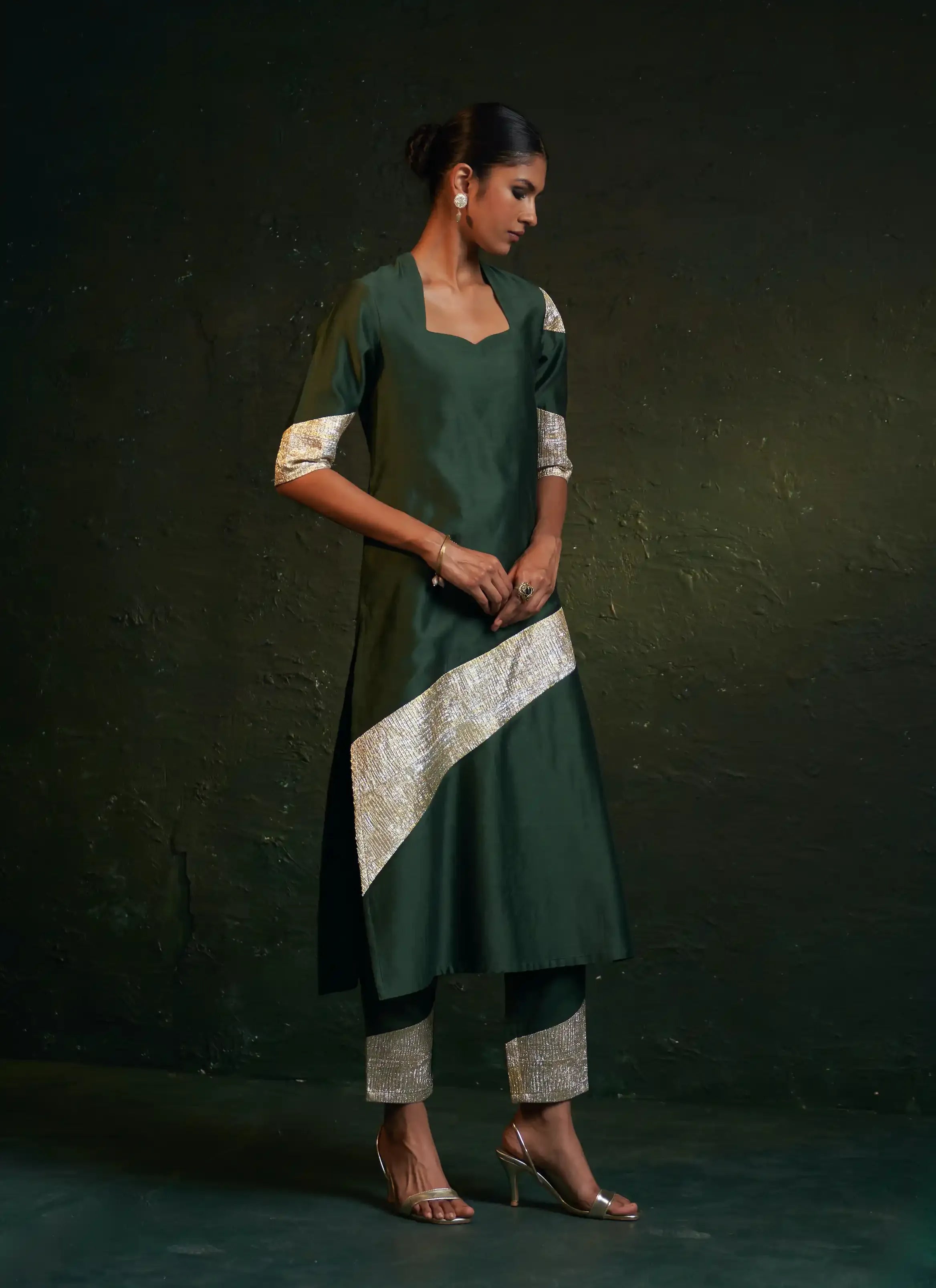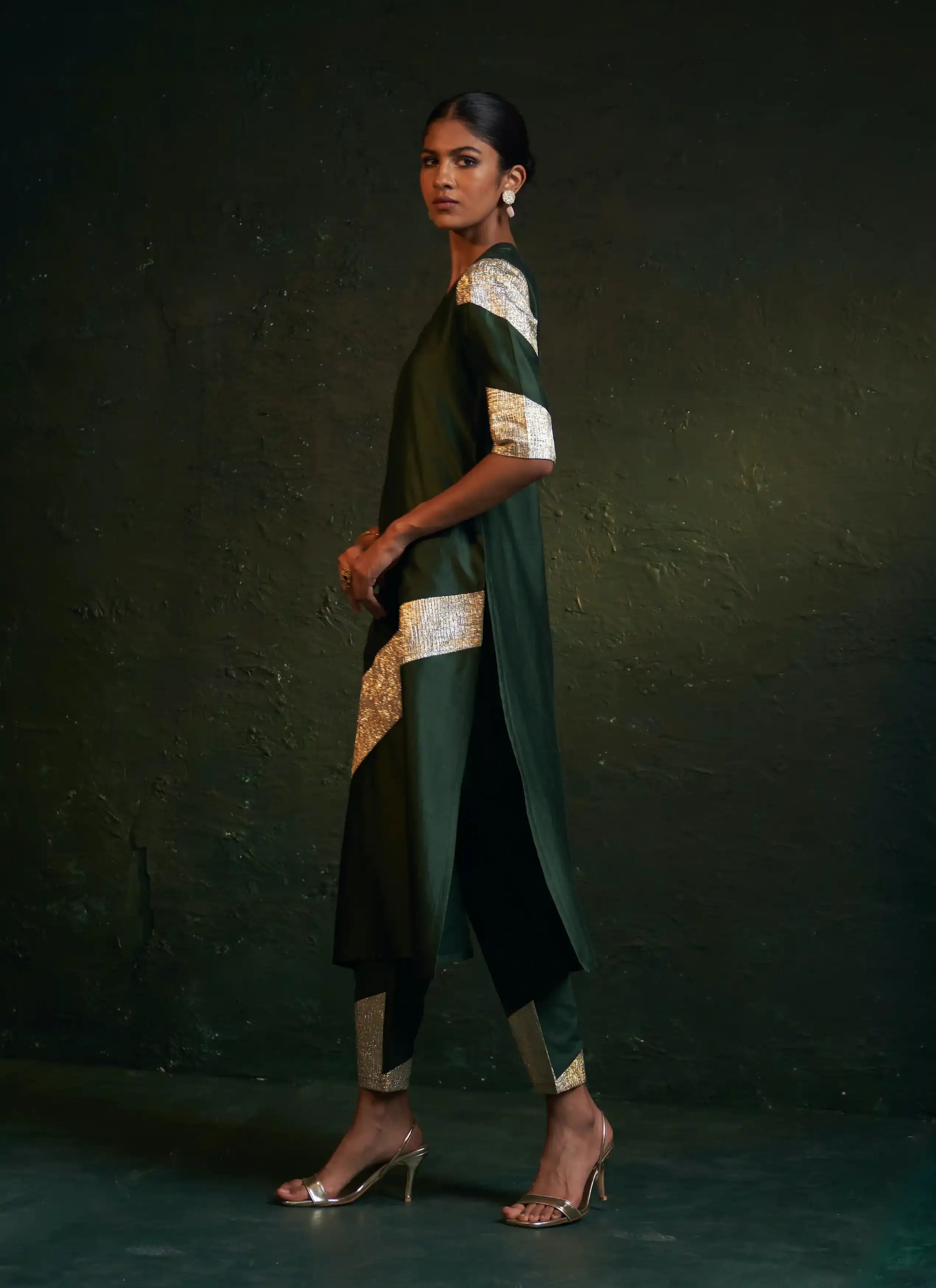 Make a bold statement with this straight a-line kurta, featuring dramatic gota details on the front and sleeves that add a touch of flair. Paired with straight pants adorned with gota accents on the hem and a matching chanderi dupatta embellished with gota, this ensemble offers a refreshing contemporary silhouette. Perfect for any occasion, it effortlessly combines elegance and style, ensuring you stand out with grace and confidence. Elevate your wardrobe with this stunning piece that captures the essence of modern fashion!