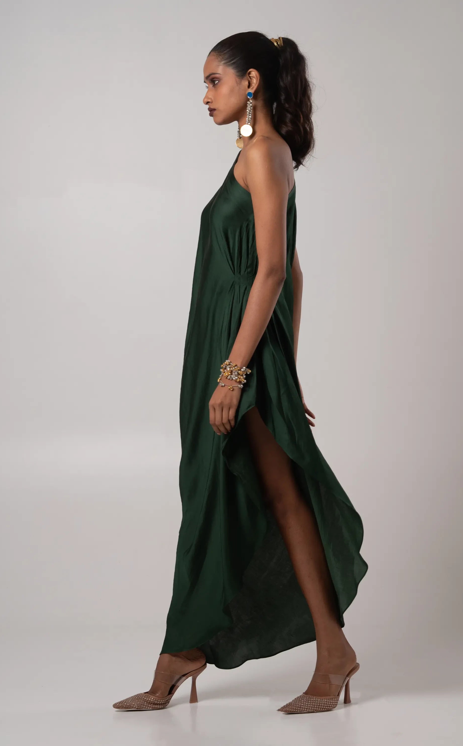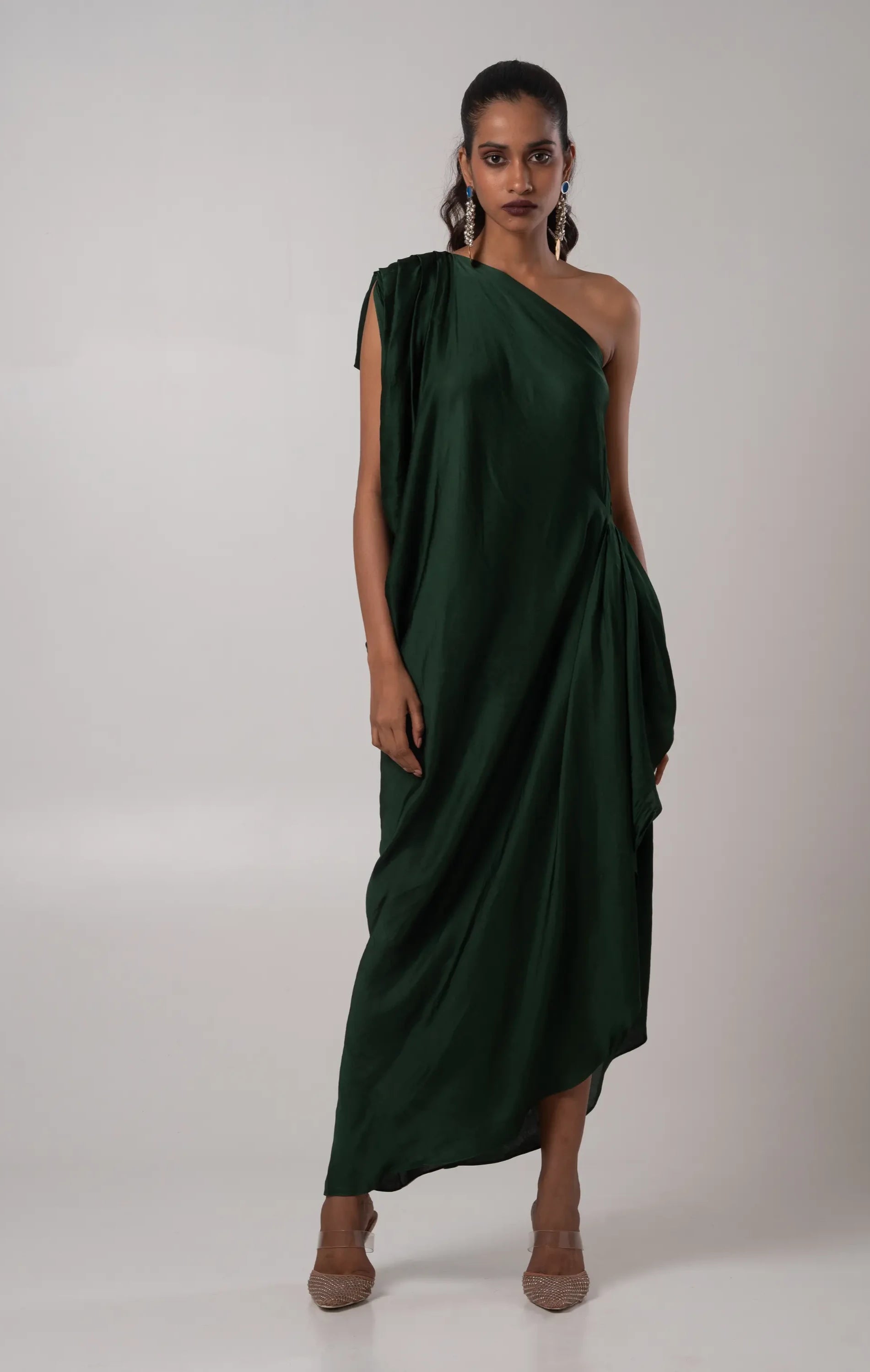 This effortlessly chic one-shoulder dress combines relaxed elegance with modern design. The draped fabric creates a flattering, fluid silhouette that moves beautifully with your body, offering both comfort and sophistication. The asymmetrical one-shoulder neckline adds a contemporary twist, making this dress perfect for both casual and semi-formal occasions. Ideal for evening outings, cocktail parties, or stylish day events, this dress offers a timeless, yet fashion-forward look that exudes effortless grace.