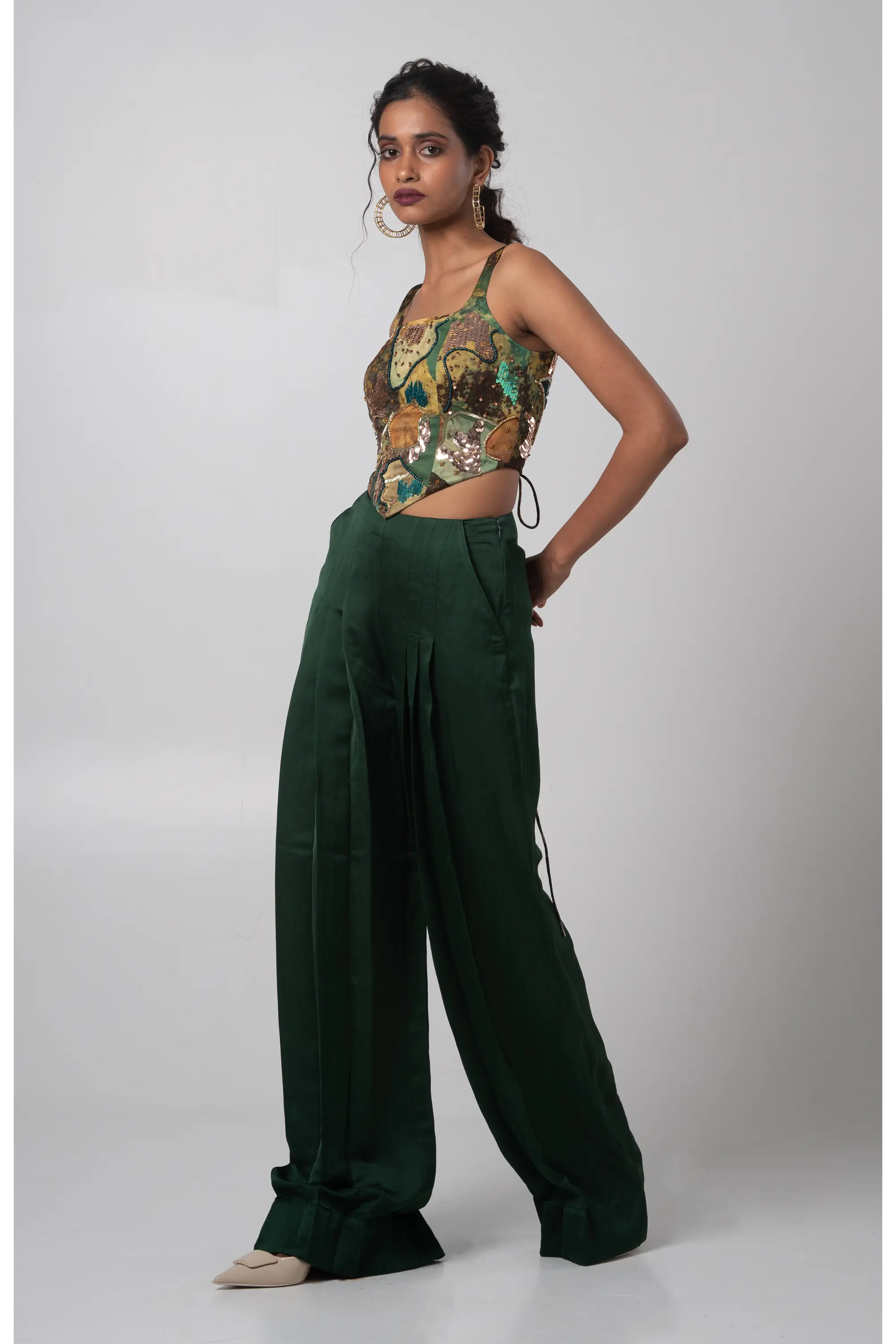 This striking hand-embroidered V-cut corset is a masterclass in craftsmanship, featuring structured boning that provides a sleek and flattering fit. The corset is designed with an adjustable back cord tie-up, allowing for a customizable silhouette that blends both comfort and style. The fabric, interwoven with shimmering gold sari thread, offers a subtle sheen that adds an opulent touch to the piece. Paired with deep green pleated super wide-leg trousers, this ensemble exudes a sense of effortless luxury and bold fashion. The trousers? dramatic pleats enhance movement and flow, creating a striking contrast with the corset?s structured design.