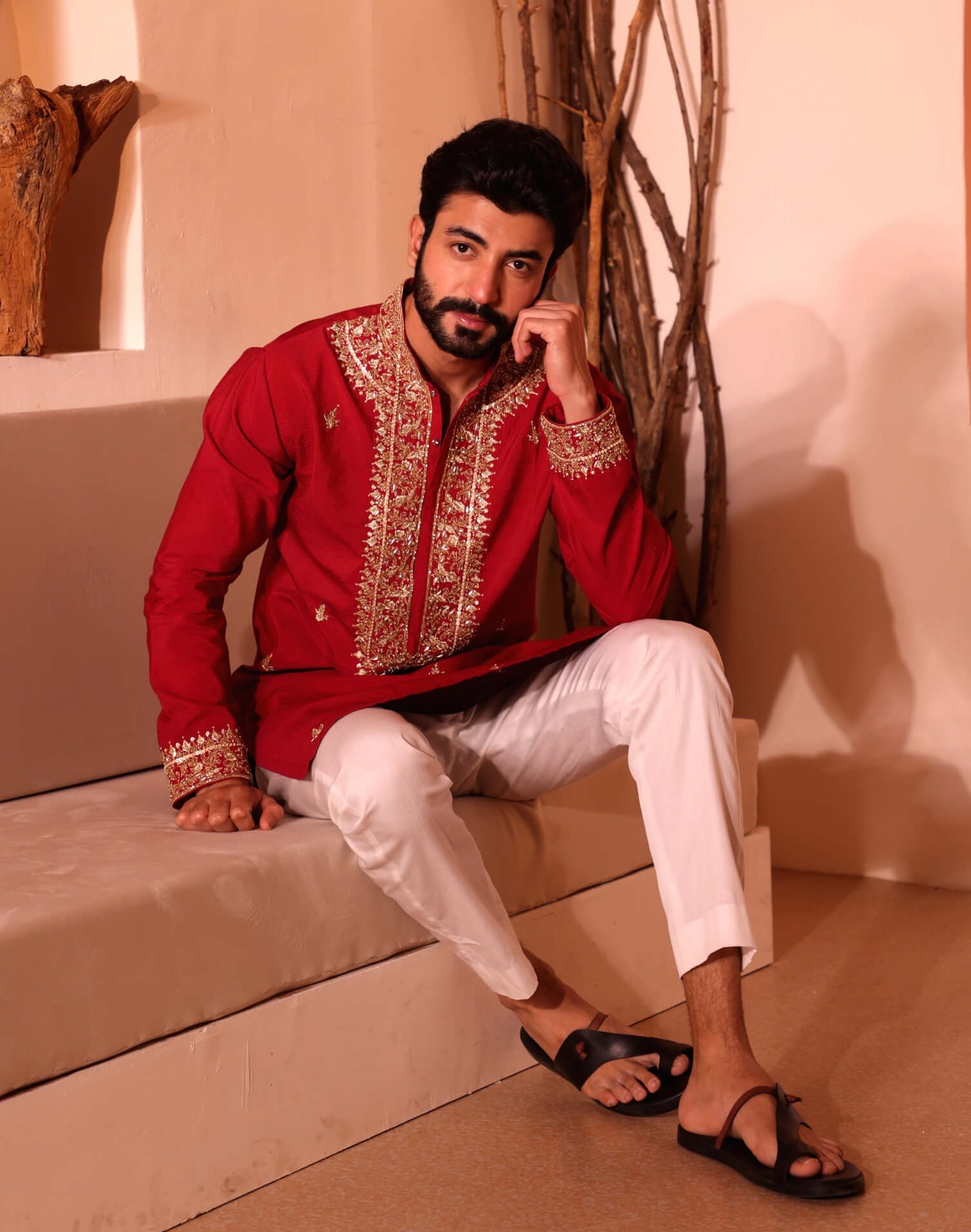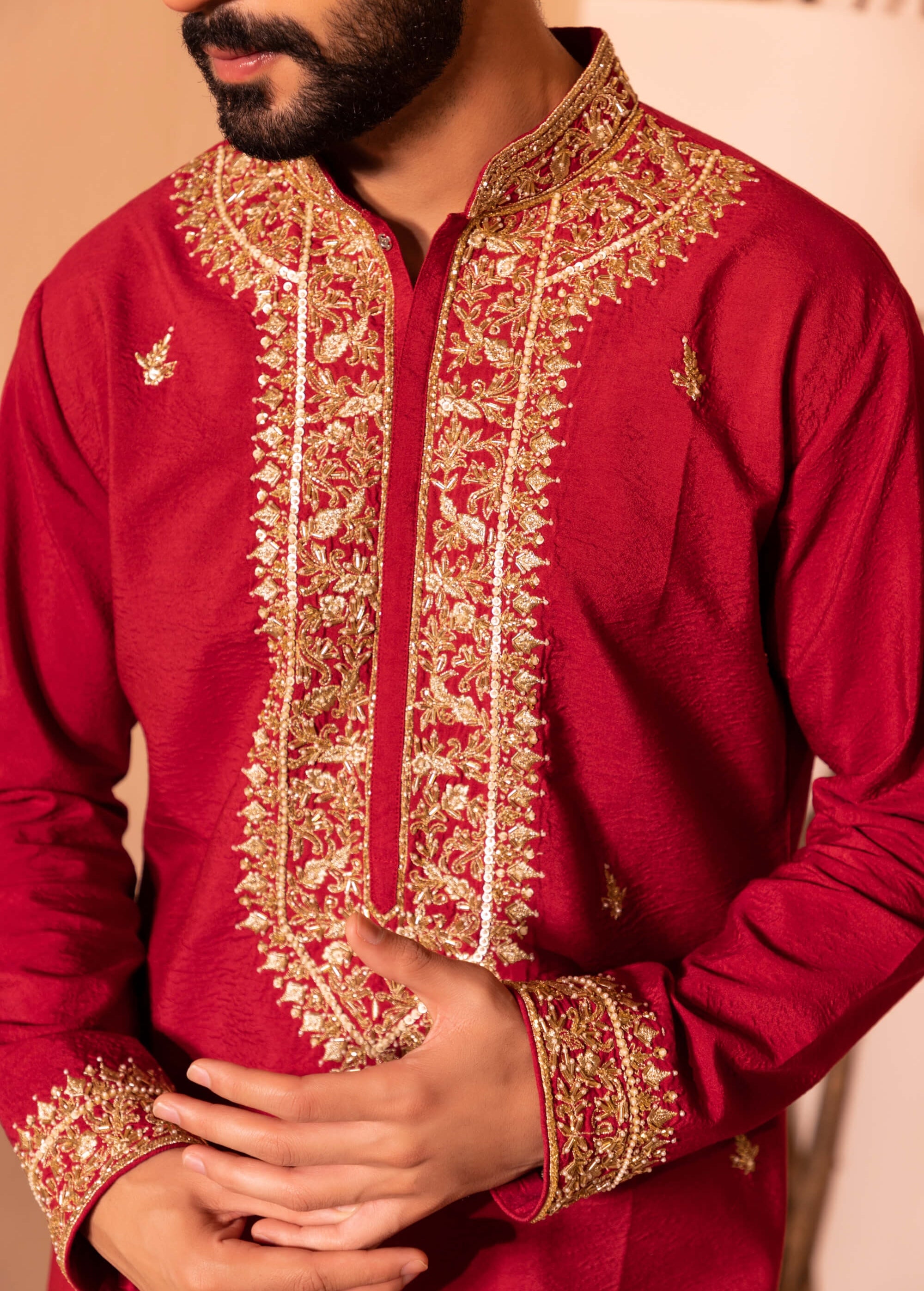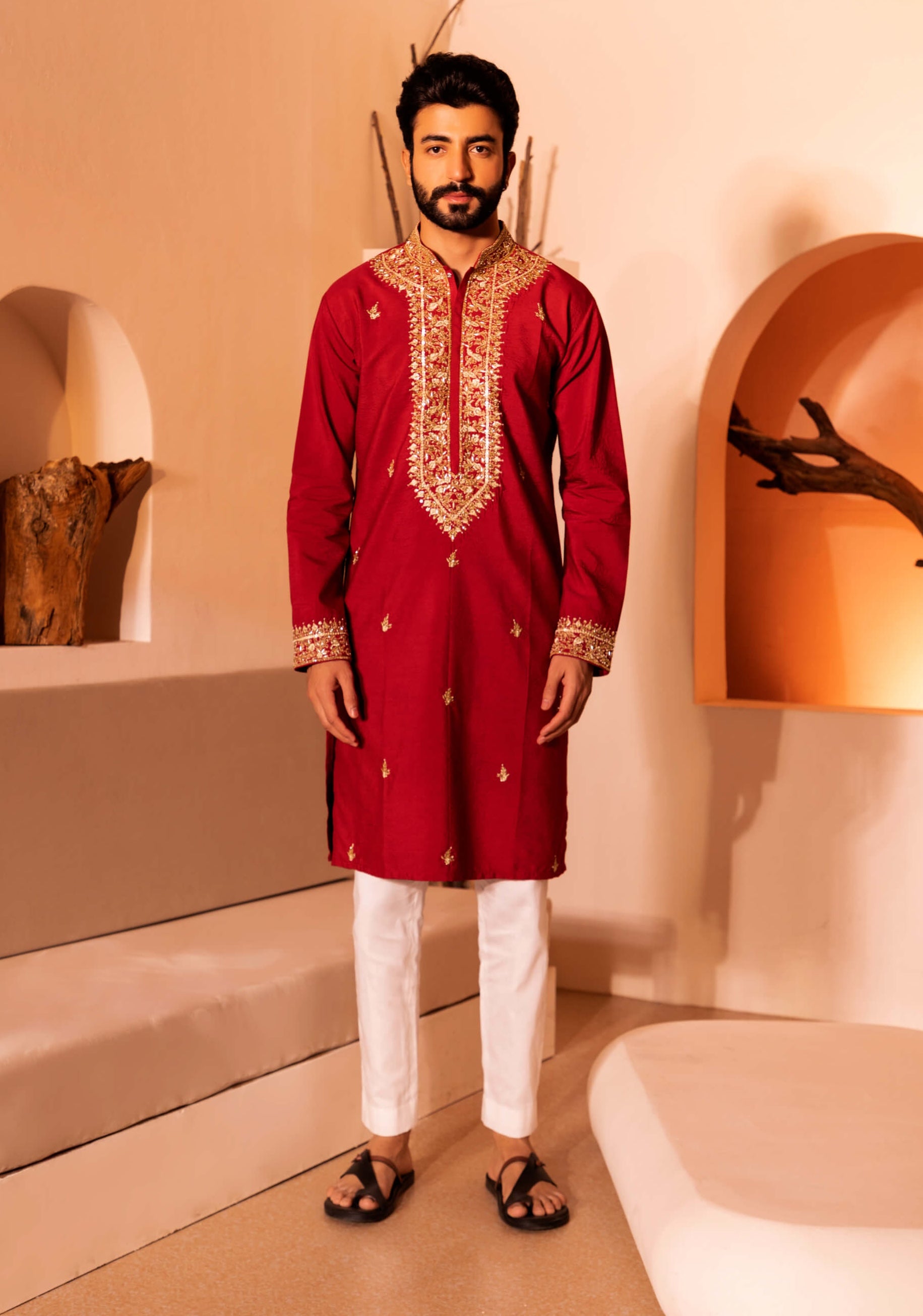 Embrace the refined charm of the Saheb Kurta, expertly made from luxurious silk viscose fabric. This distinguished kurta features a concealed placket and is adorned with scattered hand embroidery that includes intricate beadwork, thread detailing, sequins, and cutdana embellishments on the yoke and sleeves. Complete with a comfortable inside lining, the Saheb Kurta effortlessly blends sophisticated design with artisanal craftsmanship, making it an ideal choice for any elegant occasion.