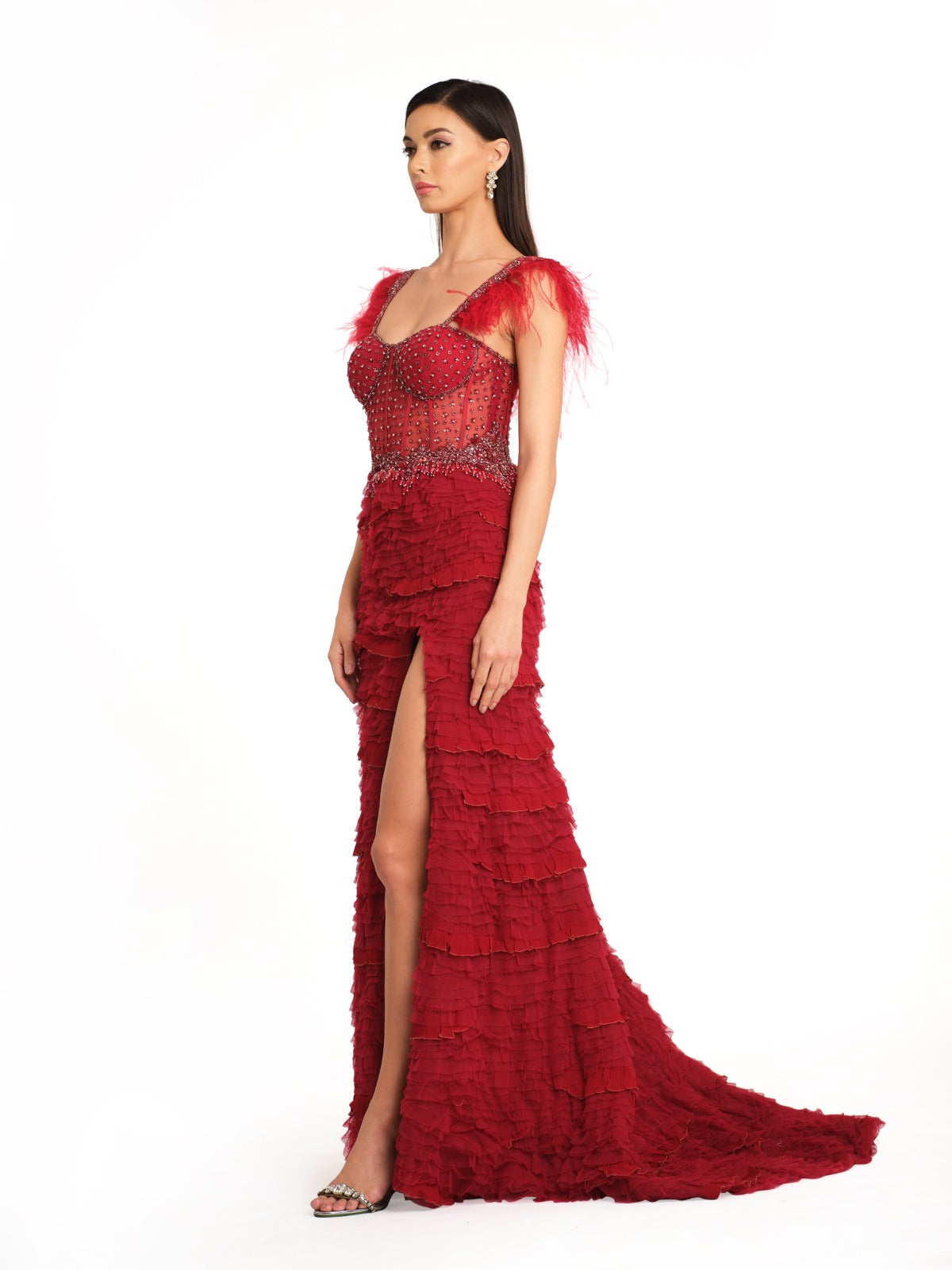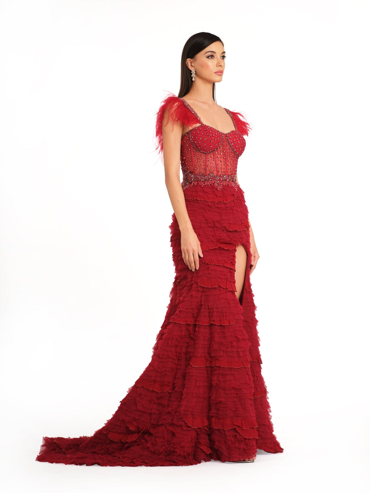 This captivating dress features a daring thigh slit and a corset fit that accentuates the figure. The sweetheart neckline adds a touch of classic elegance complemented by signature frill detailing that enhances its sophisticated charm. Feather detailing on the shoulder straps introduces a unique and glamorous element. The back tie-up closure ensures a customizable fit making this dress a perfect blend of bold design and refined style.