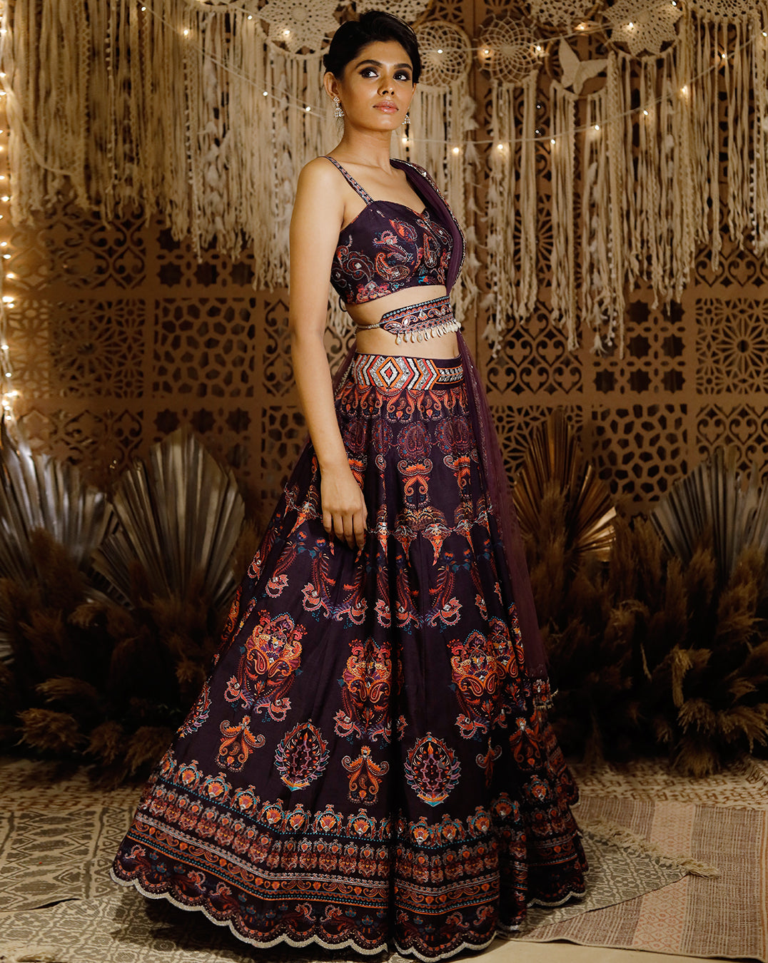 Step into elegance with this mesmerizing outfit featuring bold hues of purple and striking geo-floral prints. The lehenga and blouse, crafted from digitally printed raw silk, are beautifully enhanced with intricate mirror and resham work for a touch of opulence. The ensemble is completed with a net dupatta, adorned with a printed, highlighted border and delicate gota edging, adding a graceful finishing touch. An embellished waist belt cinches the waist, further enhancing the overall look with a touch of refinement. This outfit is perfect for making a statement at any special event, blending vibrant colors and luxurious details seamlessly.