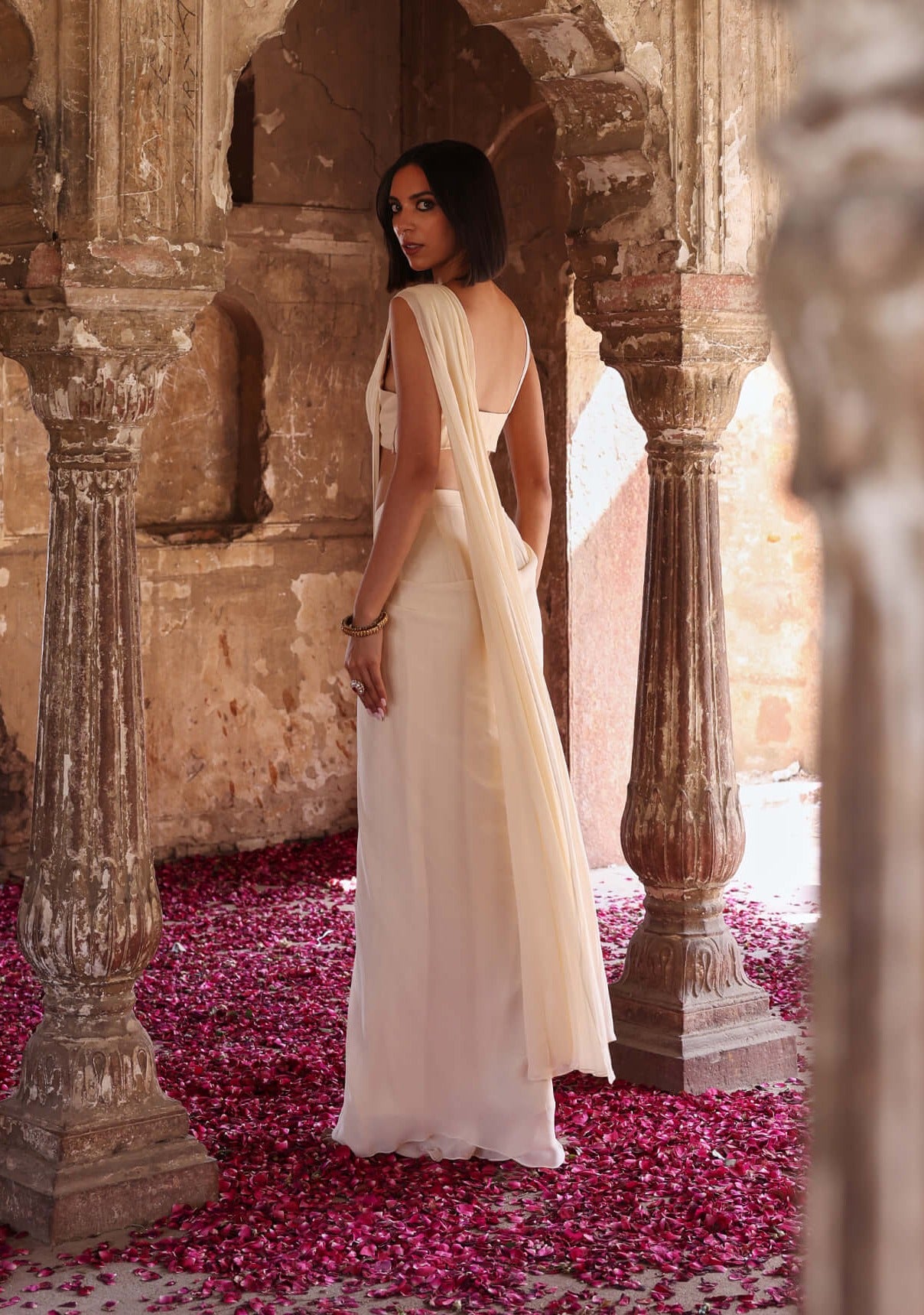 The Diya ivory embellished choli is flawlessly paired with a stunning embellished cape and a pre-stitched saree, creating a look that exudes sophistication and grace. This exquisite ensemble blends traditional elements with contemporary flair, featuring intricate embellishments that add a touch of opulence. The embellished cape drapes elegantly, enhancing the luxurious feel of the outfit. Ideal for festive occasions and celebrations, the Diya outfit offers a perfect balance of elegance and modern style. Whether you're attending a wedding or a grand event, this ensemble, with its intricate embellished cape, ensures you stand out with timeless beauty and effortless charm.
