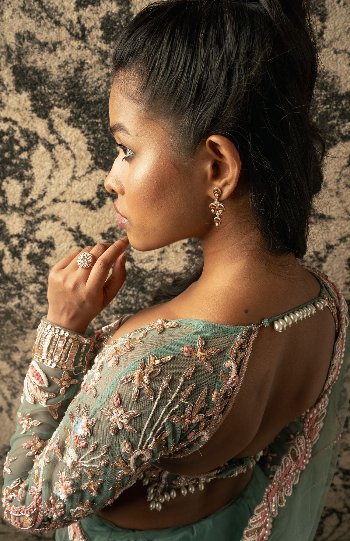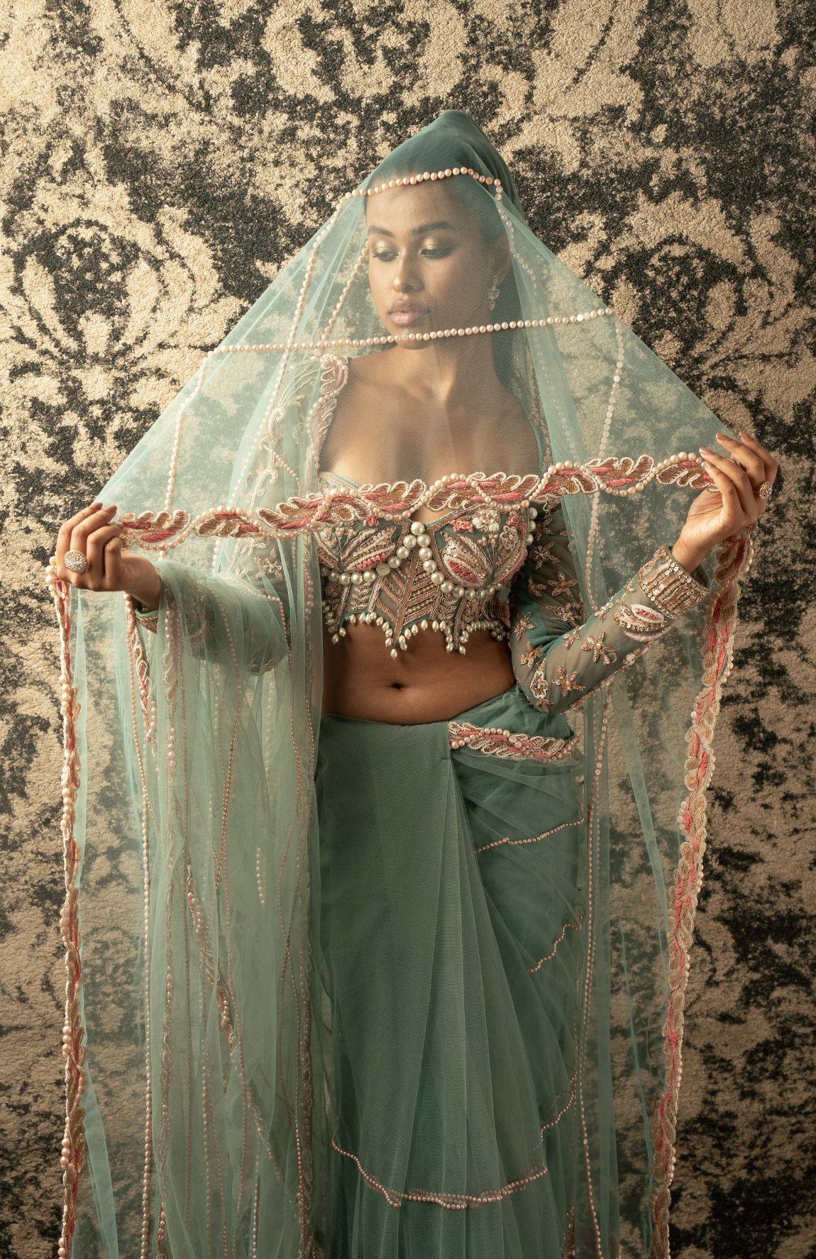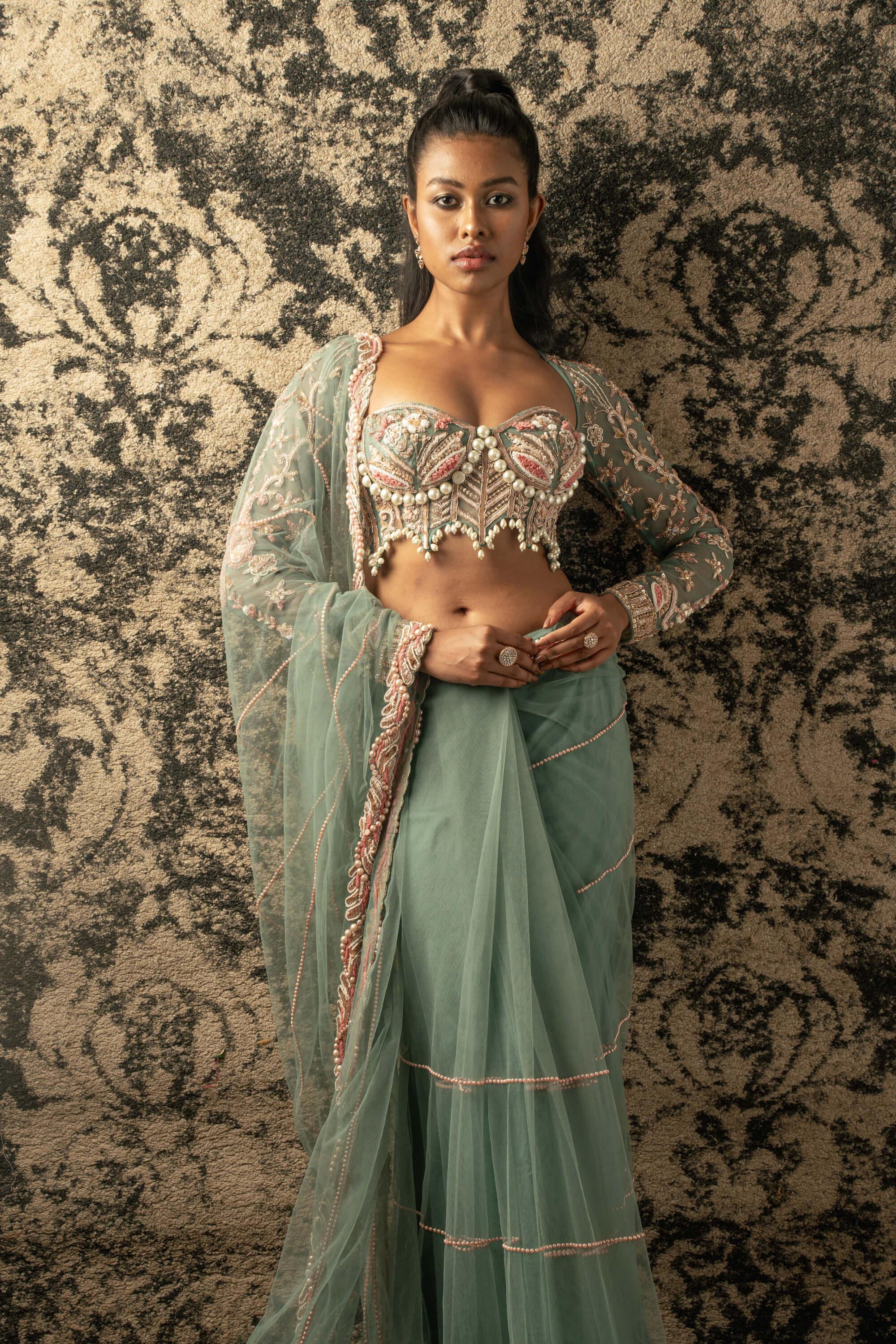 This enchanting dusty turquoise saree is crafted from delicate net fabric, radiating an ethereal charm that captivates the imagination. Paired with a matching net blouse adorned with a flair of pink, it emanates a bridal and festive aura that is simply irresistible. So mesmerizing is its allure that one might be compelled to invent an occasion just to don its elegance and grace. Perfect for weddings, celebrations, or any special event, this saree is a true embodiment of beauty and festivity, destined to make every moment memorable.