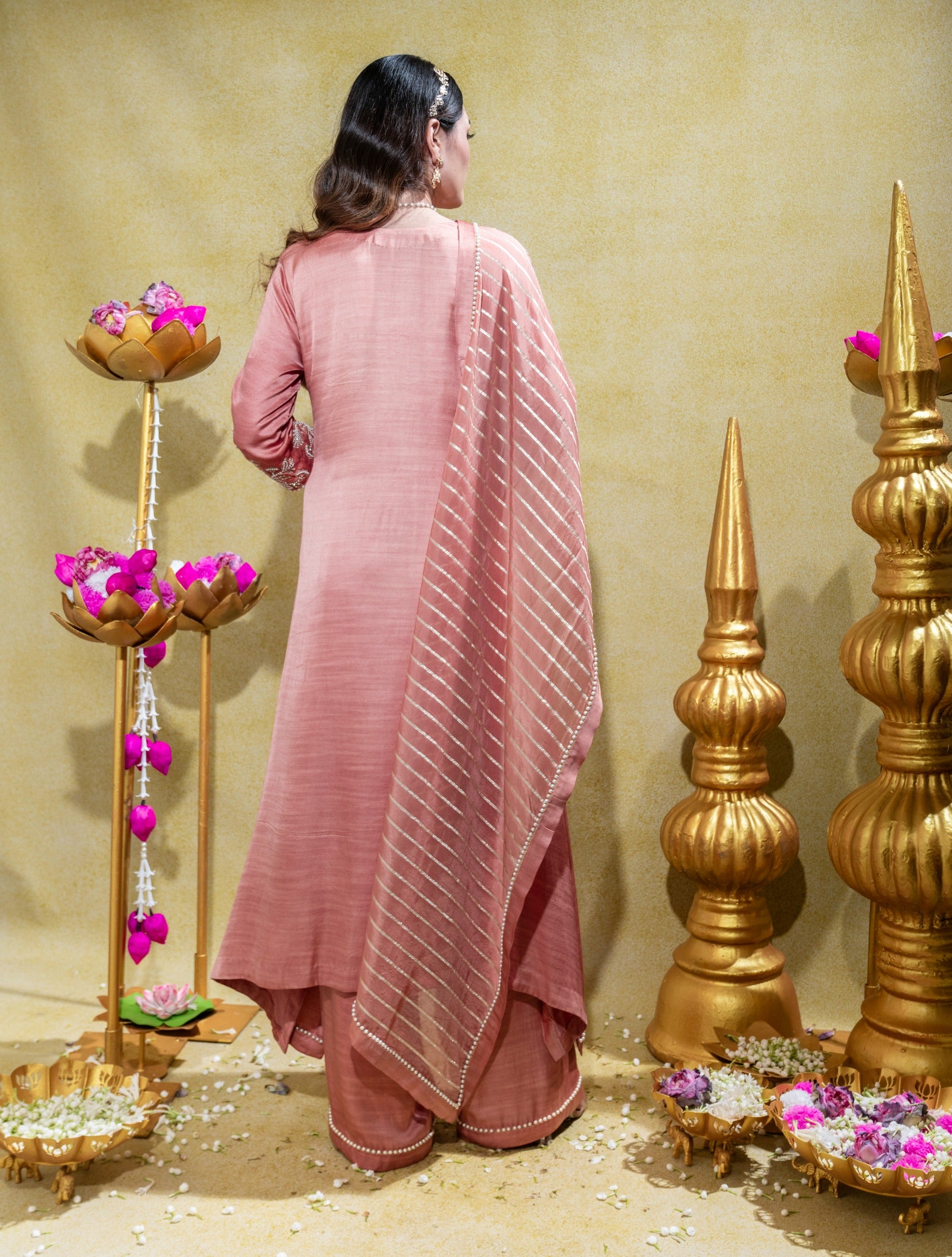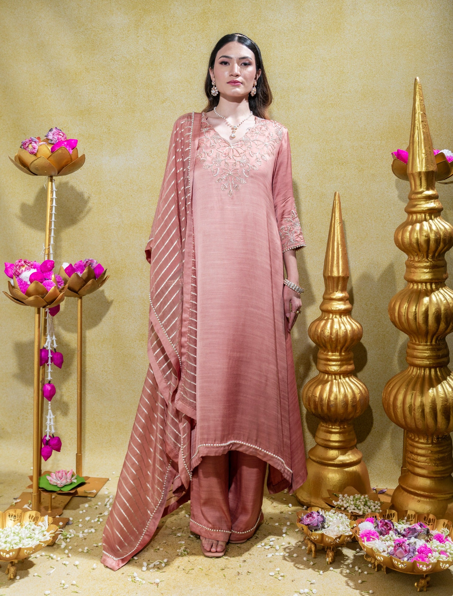 Discover the elegance of our dusty peach embroidered asymmetrical kurta, paired with matching pants and a soft organza dupatta. This exquisite kurta, featuring a unique asymmetrical cut and delicate embroidery, offers a contemporary twist on traditional design. The dusty peach hue exudes warmth and sophistication, perfectly complemented by the sleek, tailored pants. The ensemble is completed with a soft organza dupatta, which adds a touch of ethereal grace and fluidity. Ideal for both festive and formal occasions, this outfit seamlessly blends modern style with classic charm, making it a versatile addition to your wardrobe.