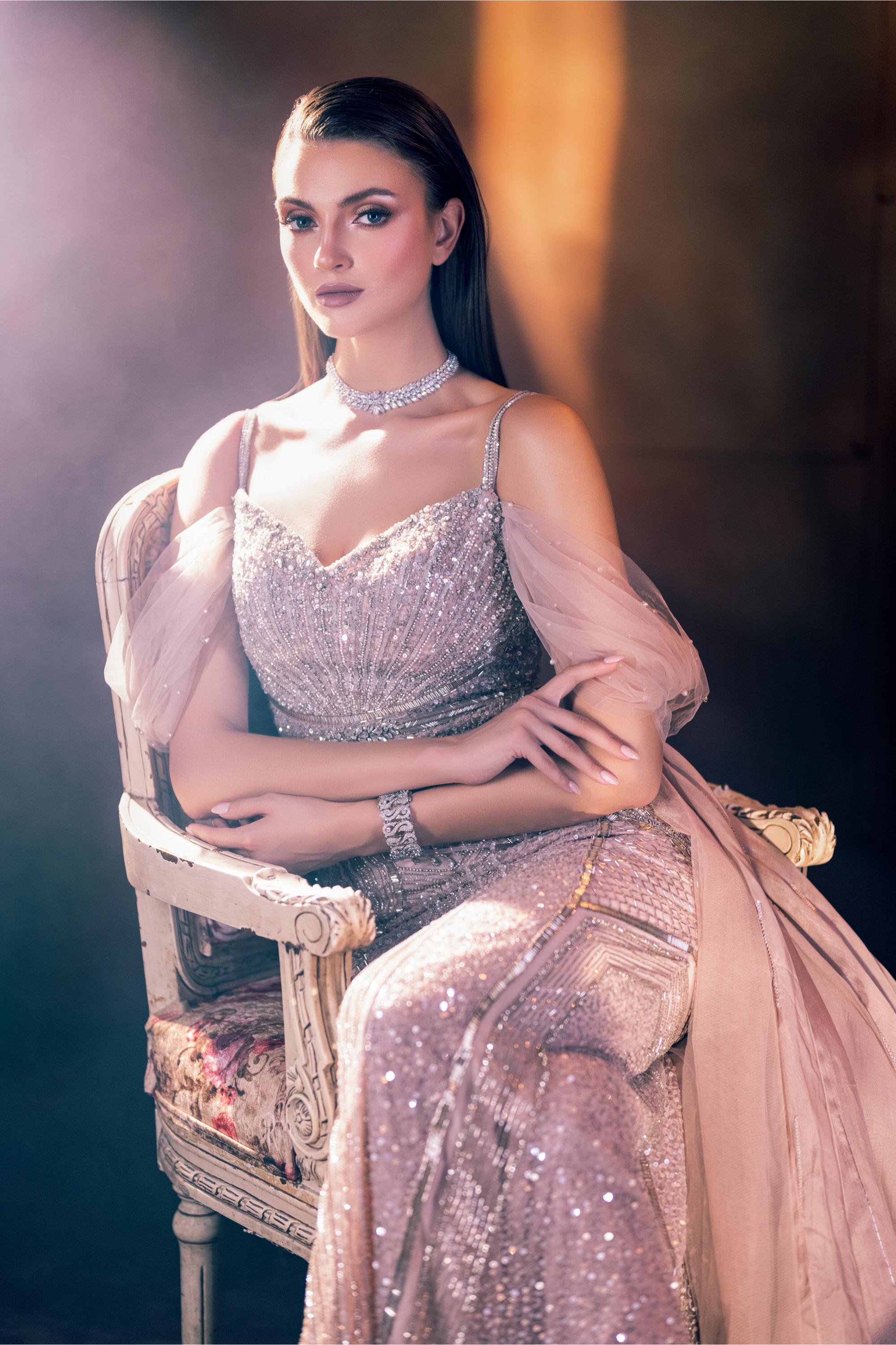 Sparkle and shine in this classic dusty pink sheath gown, elegantly paired with a detachable organza overskirt. Featuring delicate cowl sleeves and a strappy design, the gown is adorned with shimmering silver embroidery on soft dusty pink tulle, creating a twinkling effect that makes you look like a star. Perfect for glamorous evenings and special events, this enchanting ensemble combines sophistication with a touch of whimsy, ensuring you steal the spotlight.