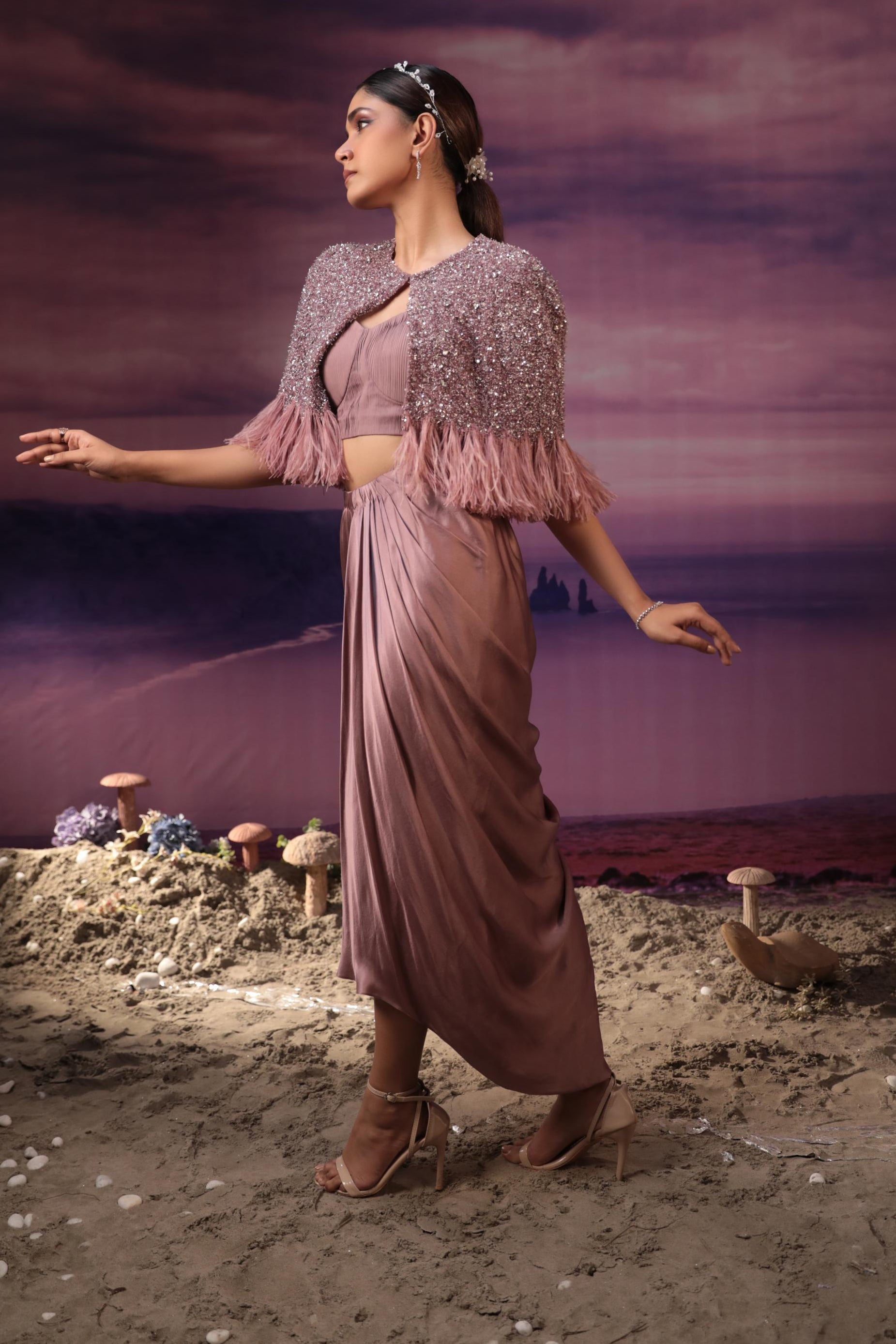 Add a touch of glamour to your look with this stunning ensemble featuring a cape adorned with sequins sheathing work and elegant feathers on the hem. Paired with a drape skirt and a pleated bustier, this outfit exudes sophistication and style, making it perfect for formal events or parties.