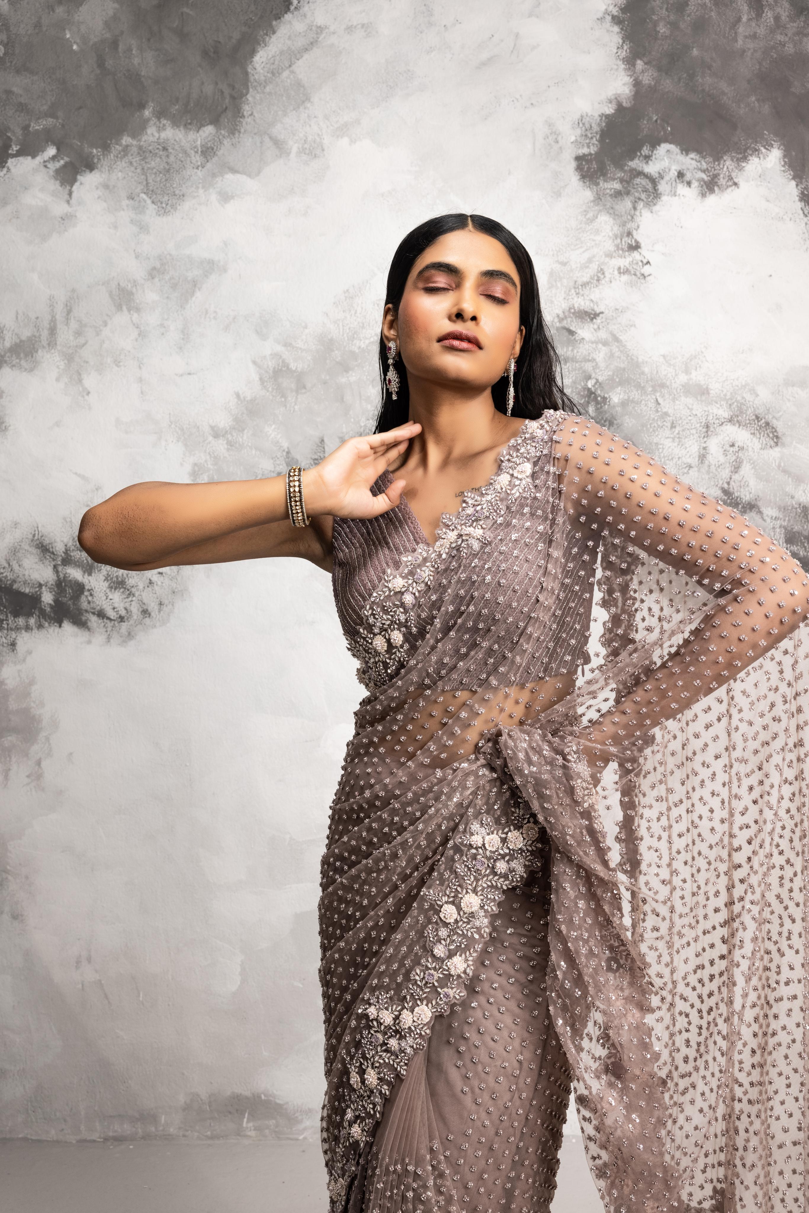 This delicate lace net blouse features intricate silver bugle bead highlights, adding a subtle yet elegant sparkle. Paired with a beautifully embroidered floral cutwork border, the blouse exudes timeless charm. The ensemble is completed with a net saree, adorned with scattered detailing throughout, creating a soft, ethereal look. Ideal for festive occasions, this outfit combines intricate craftsmanship with understated glamour.