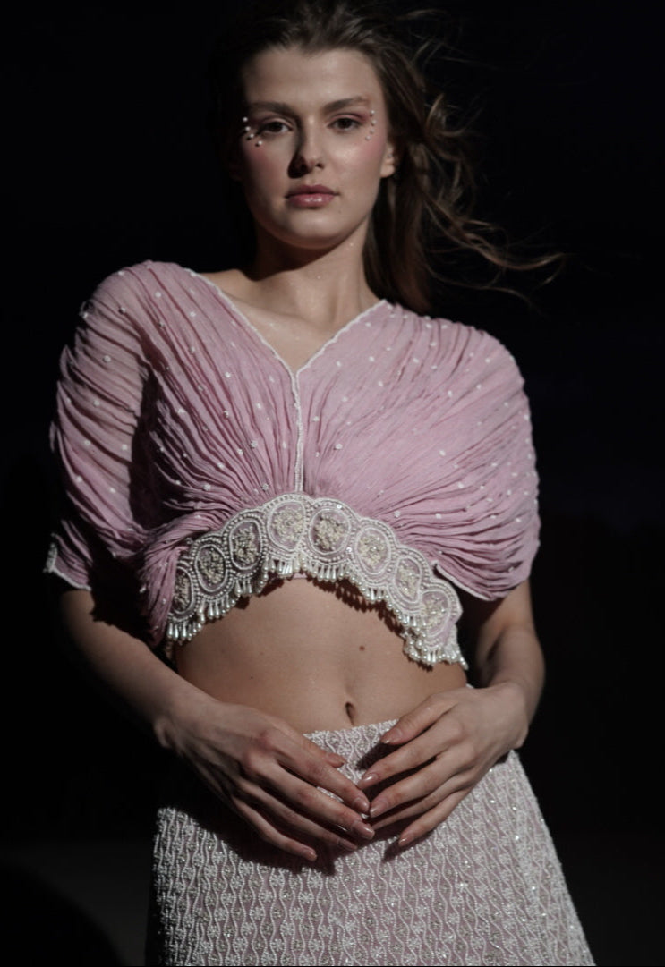 This striking ensemble features a heavily embroidered skirt adorned with intricate moti and sequin work in a bold zigzag pattern, creating a dazzling effect. Paired with a delicate organza cape and a fitted bustier, this outfit exudes both glamour and sophistication. Perfect for special occasions, it blends traditional craftsmanship with modern design for a stunning, show-stopping look.