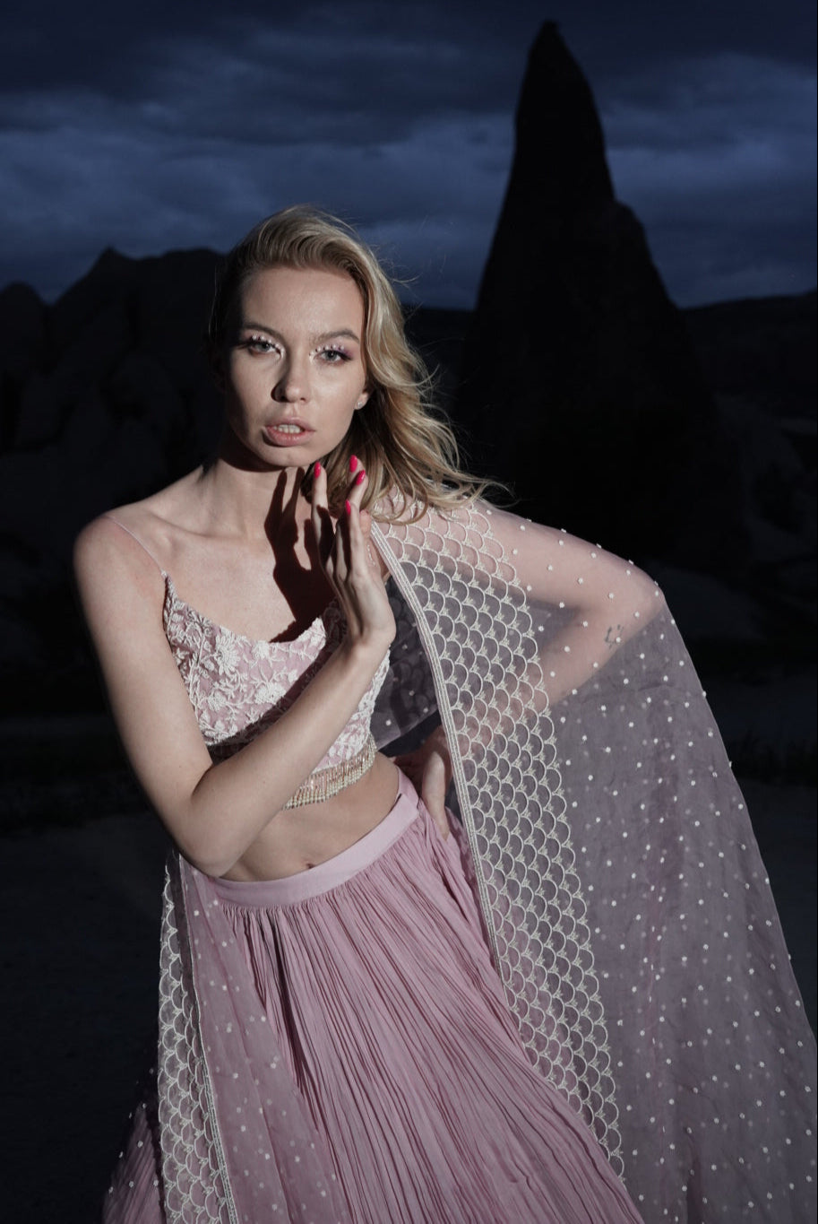This elegant ensemble features a gathered viscose plain skirt, offering a smooth and flattering silhouette. The look is complemented by a dupatta with intricate jal work, adding a touch of traditional craftsmanship. The blouse also showcases delicate jal work, tying the outfit together with refined detailing. Ideal for festive occasions, this outfit seamlessly blends simplicity with intricate artistry.